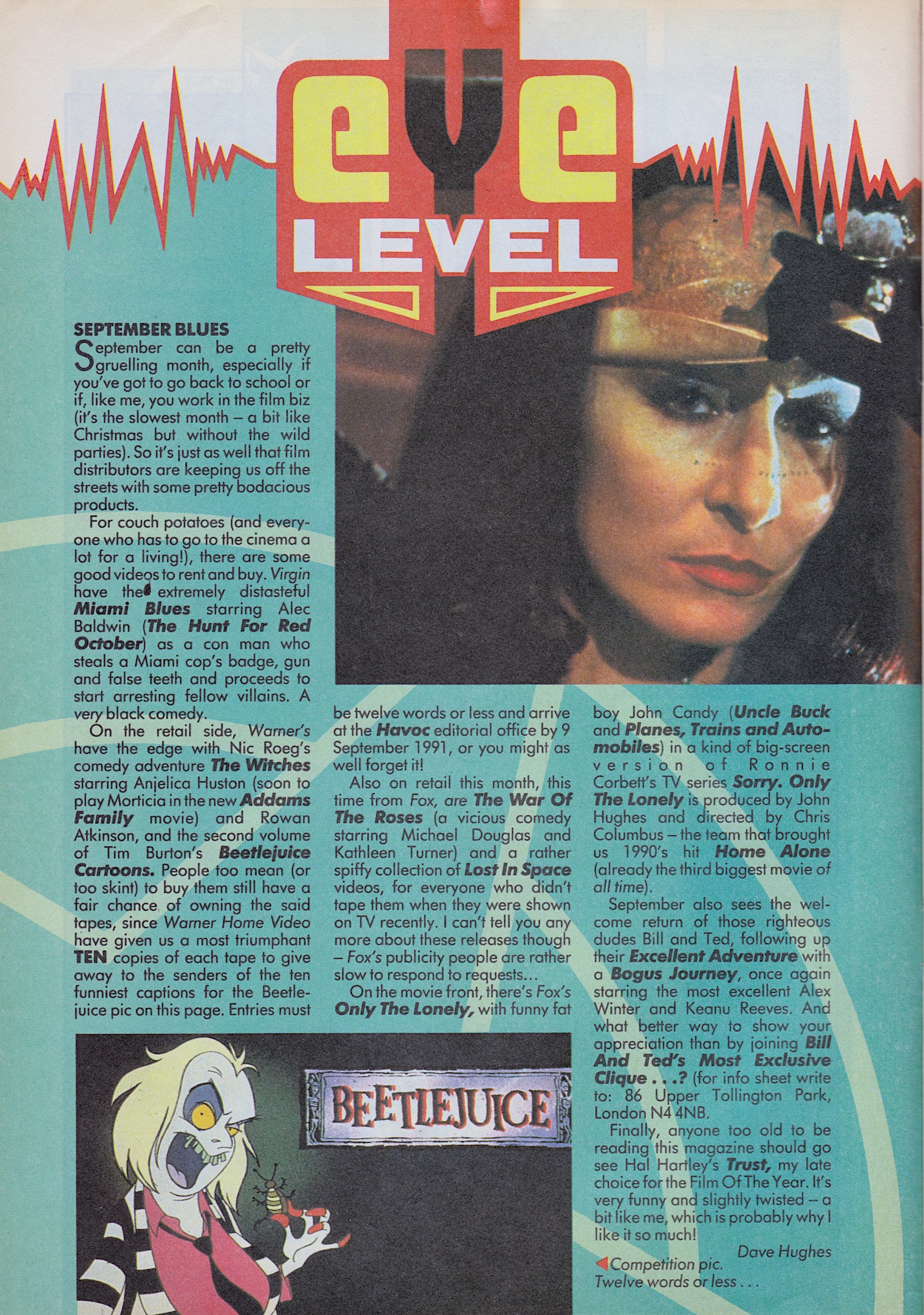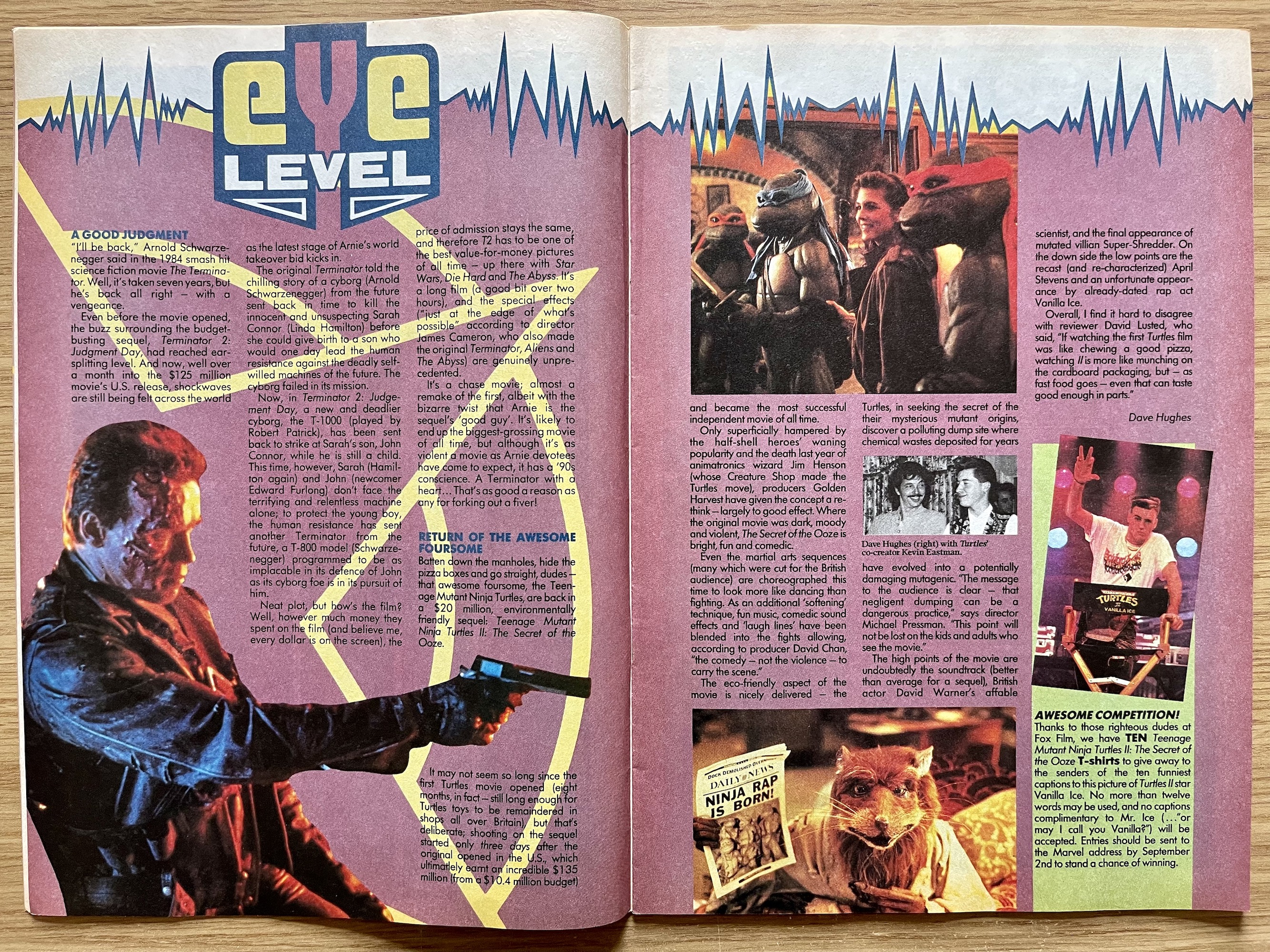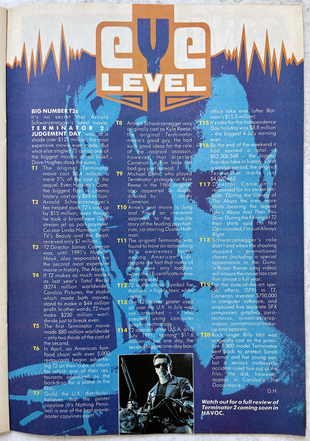 This issue’s Eye Level is a particularly interesting one. During the summer of 1991 cinema goers were treated to a vast array of blockbusters with everything from City Slickers and The Naked Gun 2 1/2: The Smell of Fear, to The Rocketeer and Robin Hood: Prince of Thieves. But one film that stood out above all others was Terminator 2: Judgement Day and it’s the impending release of this movie that takes up the whole page, with 20 facts about the film and its star.
