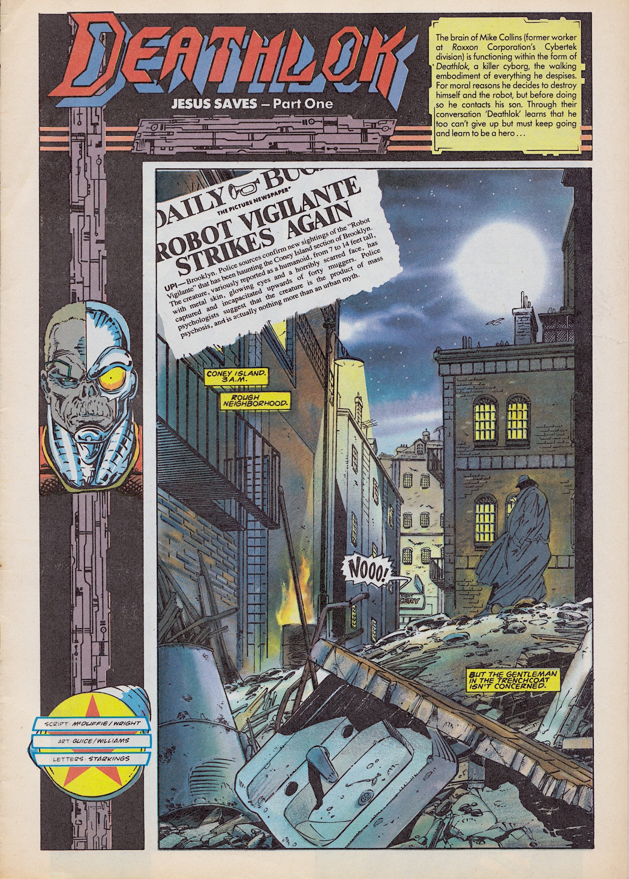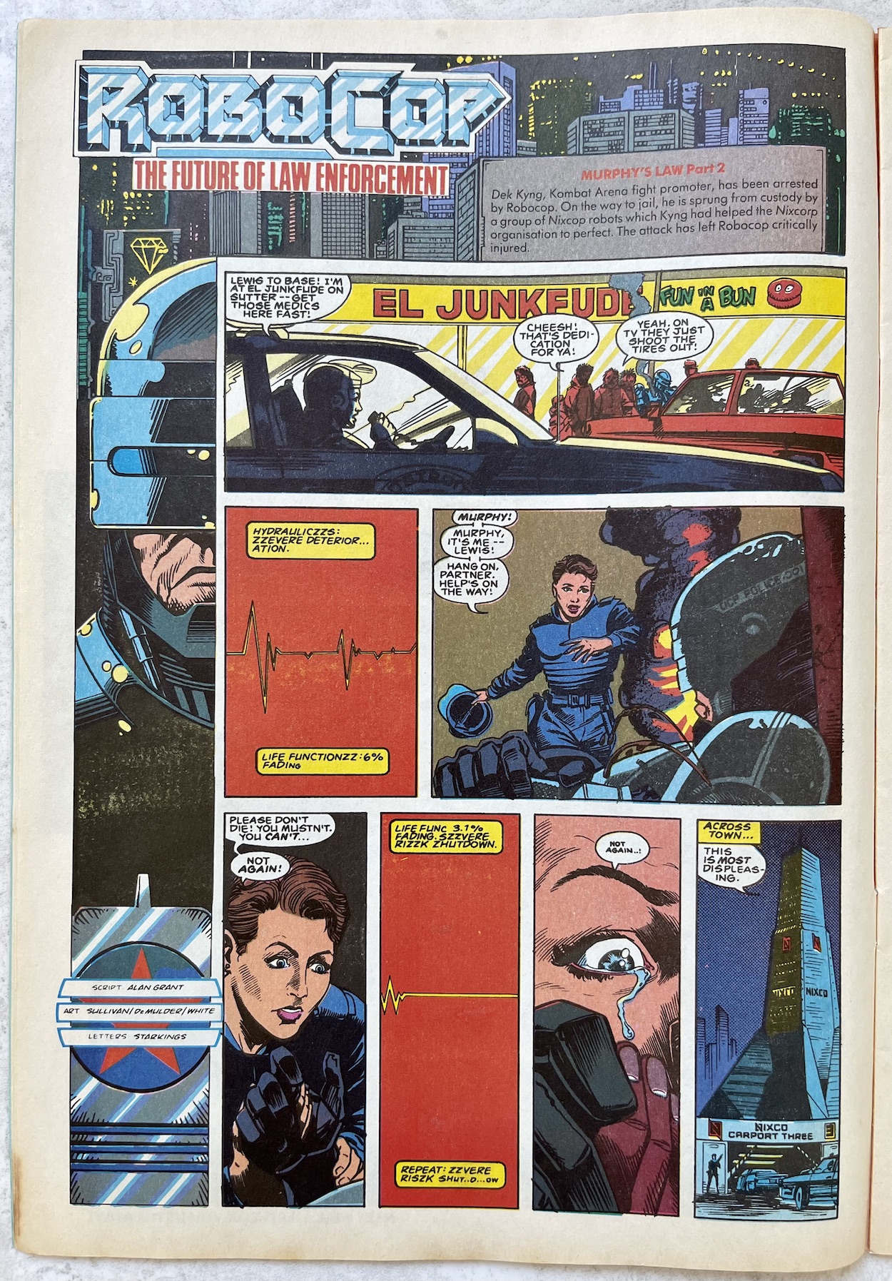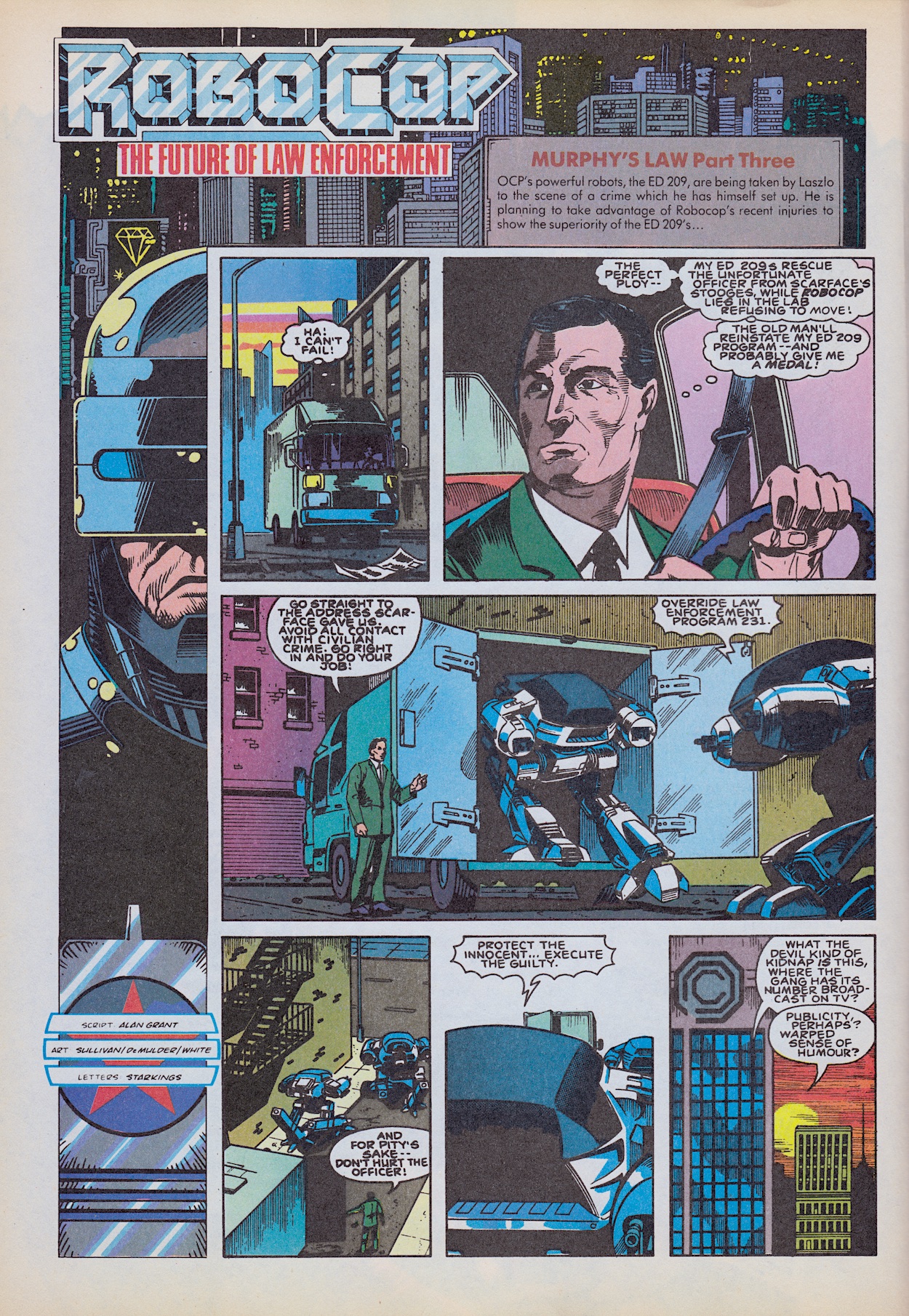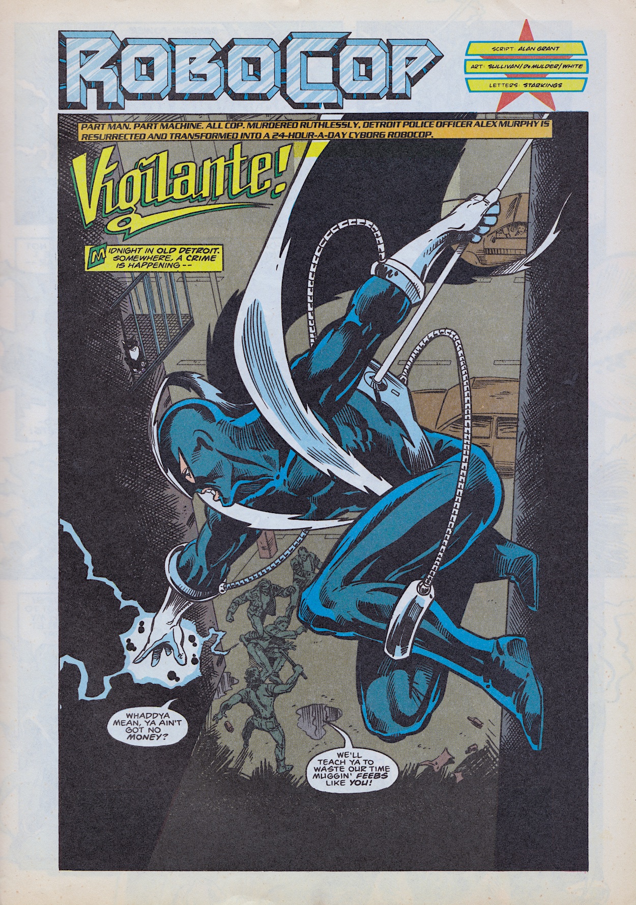 So Danny Ketch and the flaming skull are the main draw for new readers and as you can see the title logo not only changes colour each issue but the headline strip does as well. This issue Danny’s hellfire alter ego also has a special one-page feature, replacing Eye Level for one week. But let’s kick things off with the first story and it’s Alex Murphy inside RoboCop in the first part of his second story, which takes pole position just as Conan did when he began a new tale in #3. It’s still written by Alan Grant with pencils by Lee Sullivan, inks by Kim DeMulder, colours by Steve White and letters by Richard Starkings.