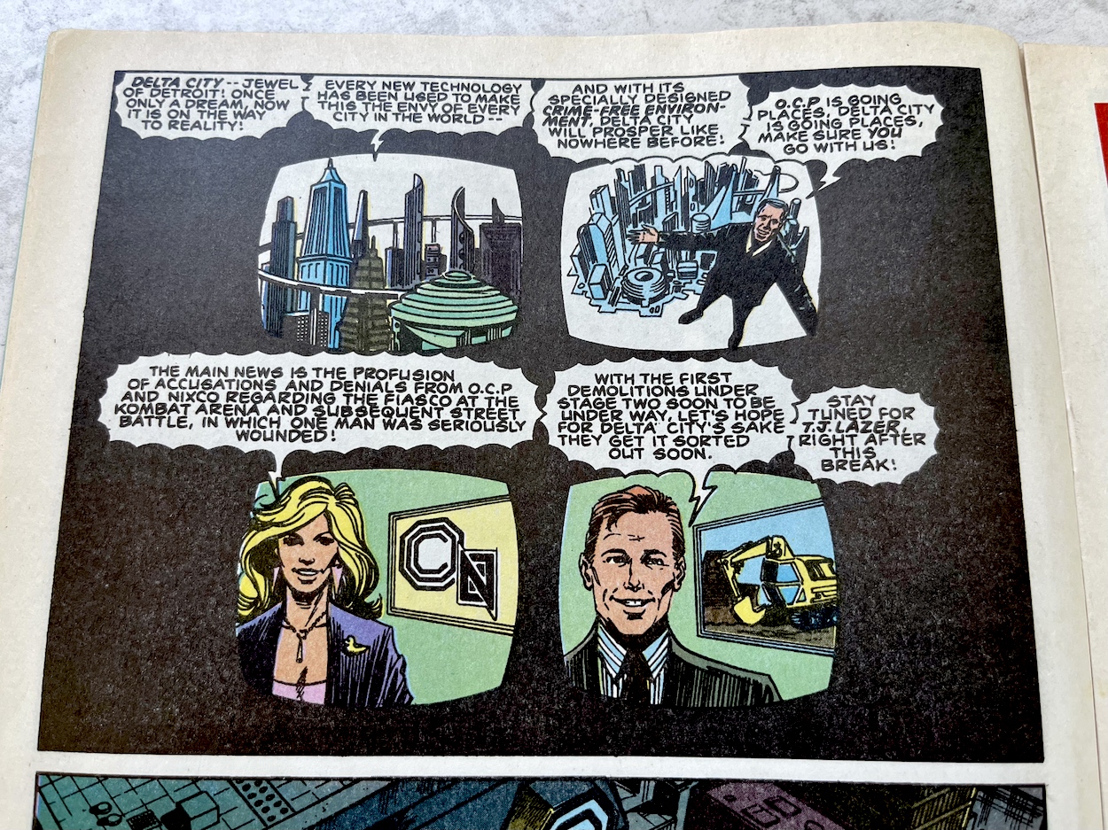 First up though it’s time for a commercial and some news updates from Media Break. I loved these in the first film and in particular in every episode of the TV series. I’d completely forgotten Delta City didn’t actually exist yet in the movie, I’m so used to seeing it complete (or at least in a more advanced state) in the series complete with its self-aware central intelligence, that reading this feels like a prequel to the RoboCop I grew up with.