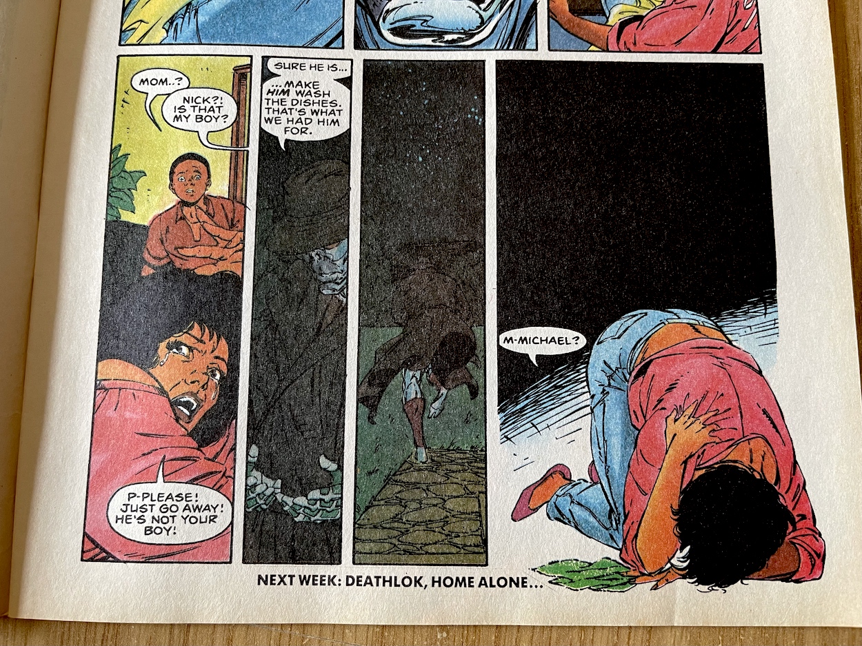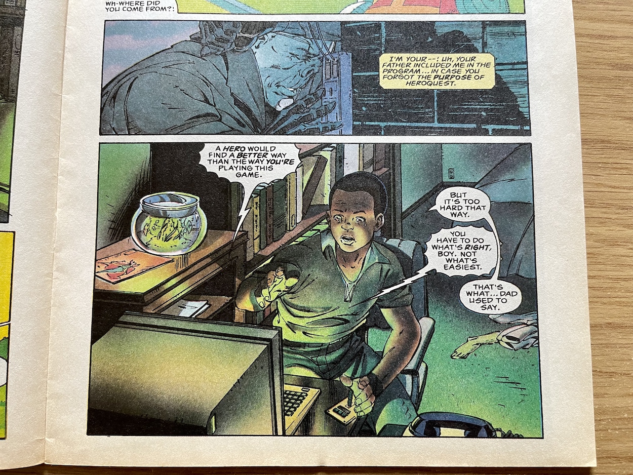 The Deathlok computer detects a ‘HeroQuest’ program running at the number given to it (how topical for 1991) and it creates an avatar for itself to interact with the player, young Nick, who knows his dad has died. This is the game we saw him play previously, when Michael tried to explain to him how bigger and better weapons don’t make the hero, it’s about being brave against the odds and, telling him that he’s a friend of his dad’s he reminds him of this in a touching scene.