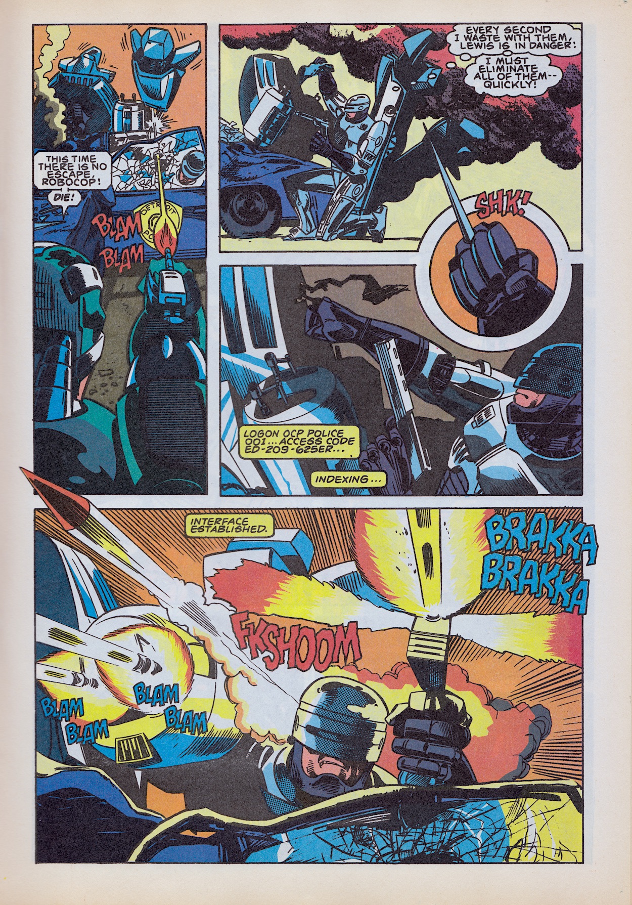 But first, either the ED-209s have shrunk since the movie or that’s one hell of a big van. I’m nitpicking, so I’ll just ignore this and get on with the main bulk of the story. The two sets of rogue robots start to take each other out, both believing they have the proper authority to rescue Lewis and that the other is breaking the law. An ED-209 even attempts to kill Alex because it deduces he’s trying to stop it rescuing her.