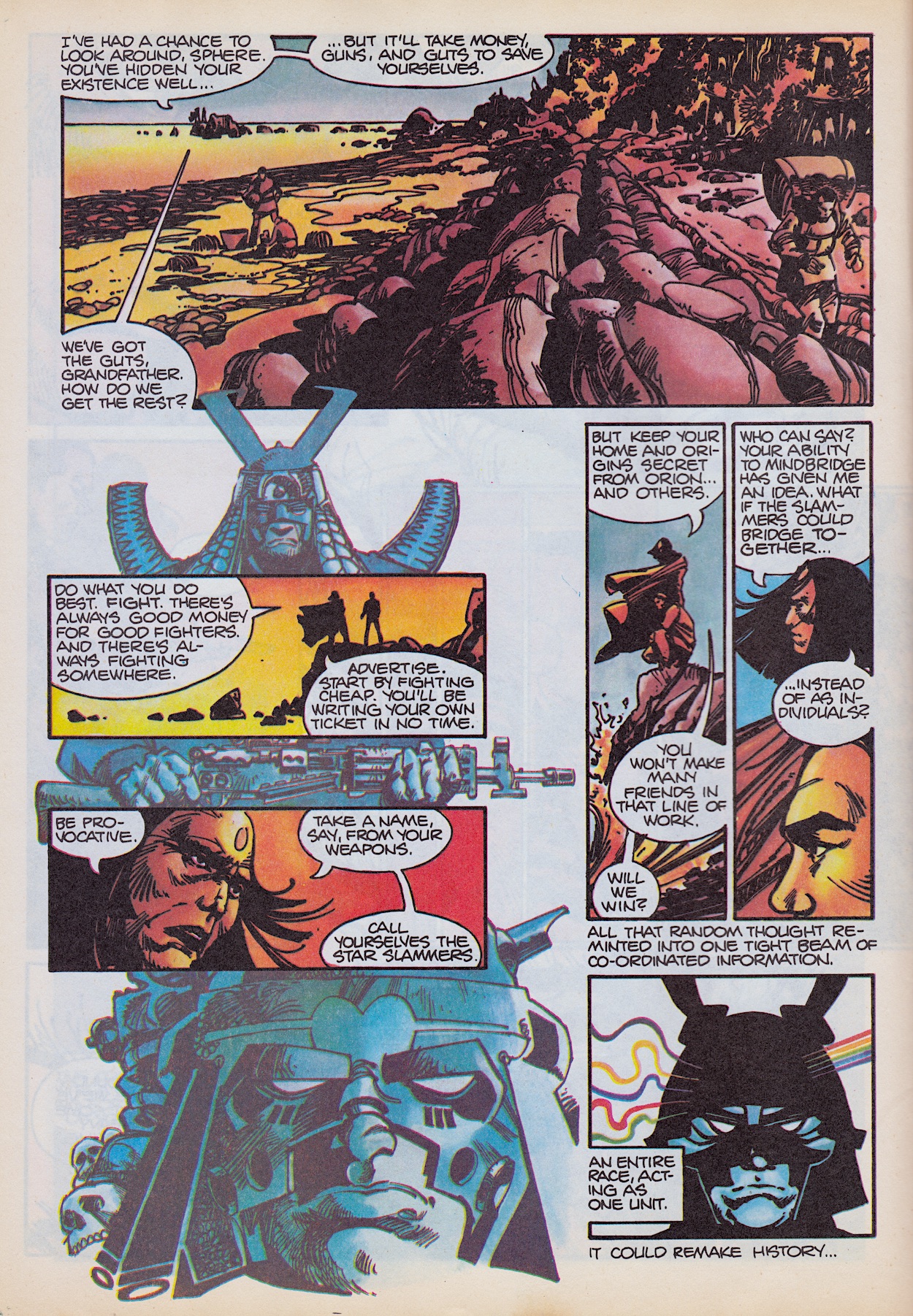 Less fascinating are the Star Slammers (written and drawn by Walt Simonson, coloured by Louise Simonson and Deborah Pedler, lettered by John Workman). Also getting a good portion of the comic we see how Grandfather and Sphere first met, the former as a senator bringing a warning of a future planet wipeout, the other the leader of the people on the planet used for sport. As the Slammers prepare for the war at last they reminisce about that first meeting, how the elder had to prove himself and how he engineered the Mindbridge.