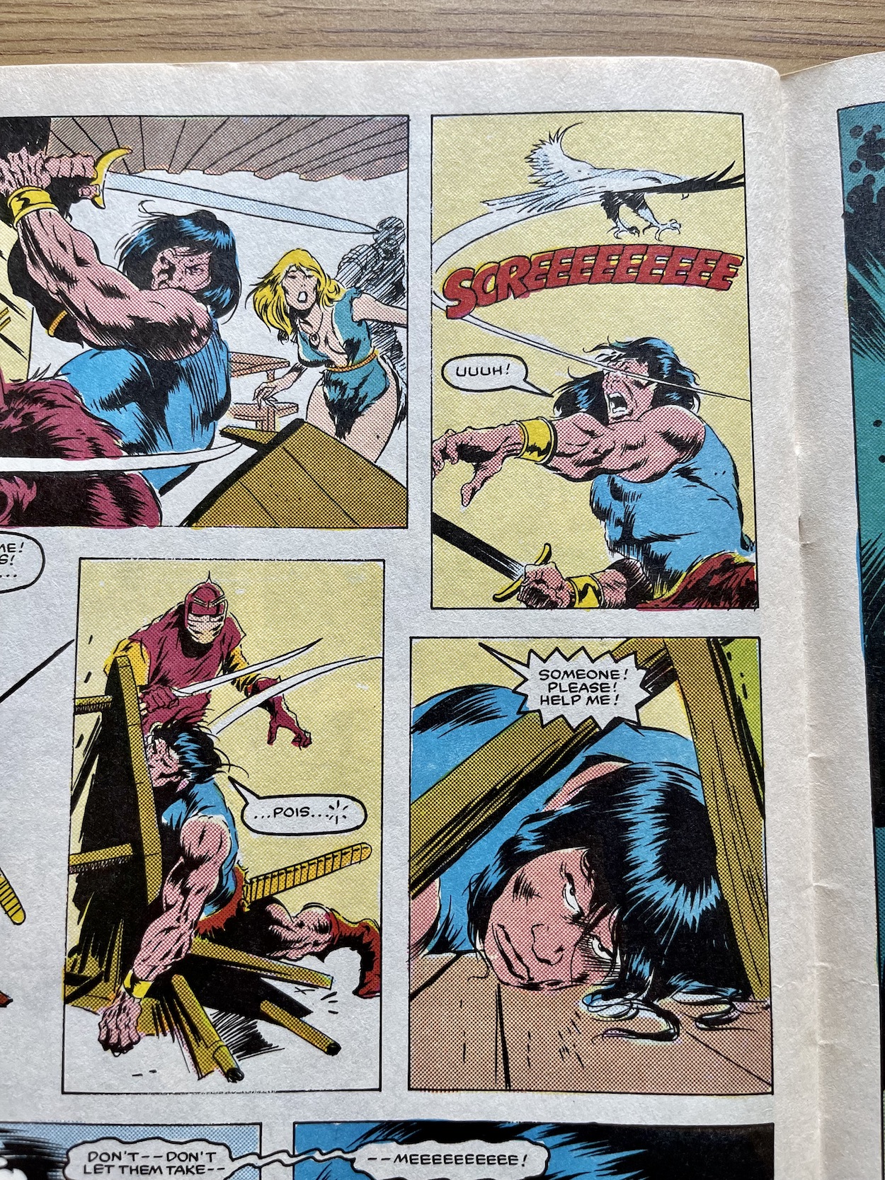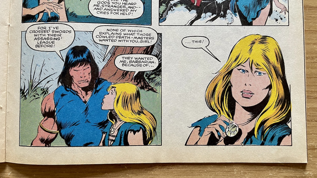 Part two of Conan’s Barbarian Death Song (written by Michael Fleischer, pencils bJohn Buscema, inks by Armando Gil, letters by Janice Chiang) sees our female guest character finally named (Tasmara) and she explains the cloud from last time was actually some random god who bestowed the jewel upon her neck because he was so enraptured by her beauty. She’s now being chased down by Baron Gerdeg and his Falcon Brotherhood because it gives her the ability to see the future, something she realised through tragedy as you can see above.