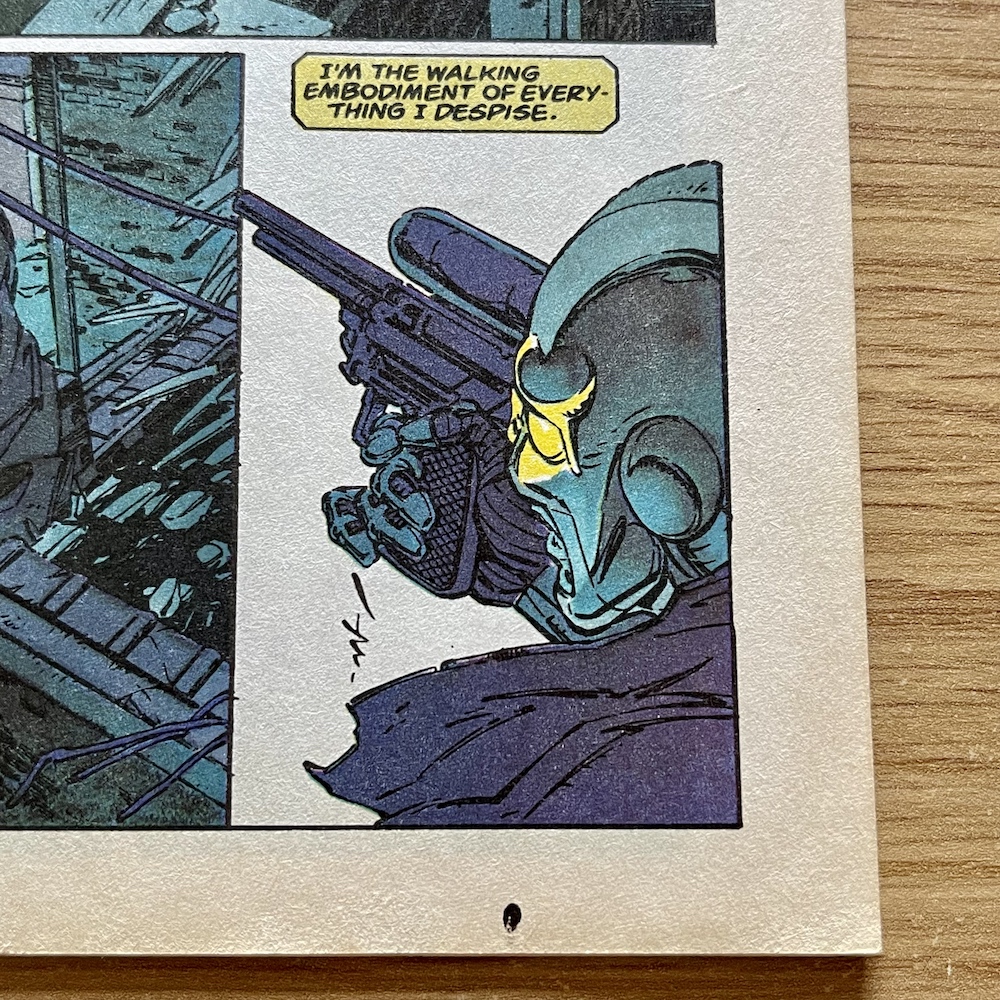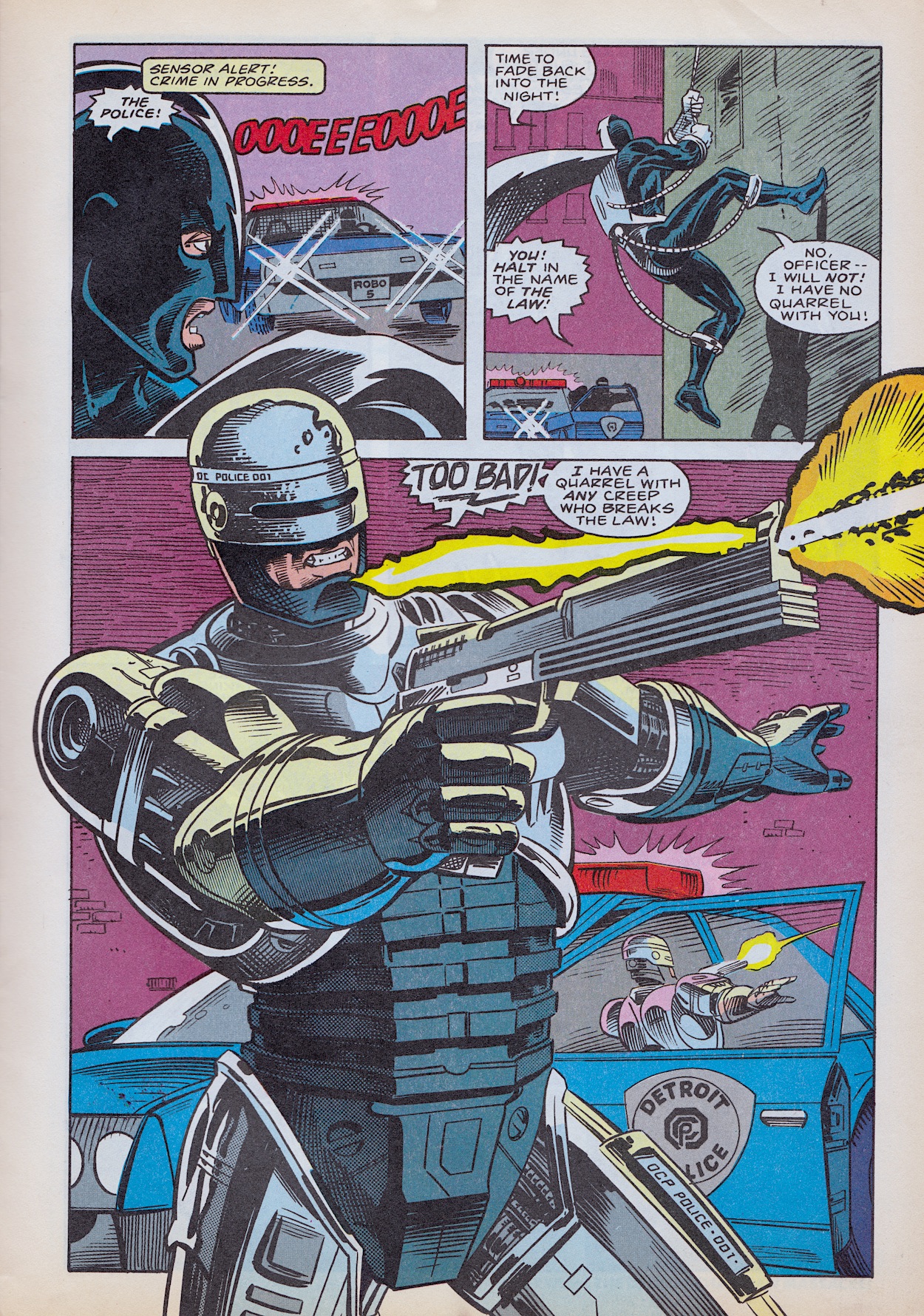 Cue sirens and a police car pulls up. Our panicked wannabe begins to scale the wall in a bid to fade back into the night like any good vigilante but he hadn’t bet on two things, his own incompetence and the officer being Alex Murphy aka RoboCop, who makes his entrance into the story in this glorious drawing by penciller Lee Sullivan and inker Kim DeMulder (colours by Steve White, letters by Richard Starkings). A great page, this.