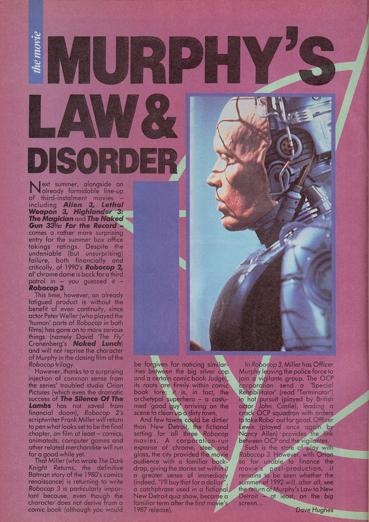 What’s strange here is that Dave Hughes‘s feature describes the franchise as a “fatigued product” in a comic printing strips based on that product! How did that make it past the editor? He also criticises Robocop 2 but praises the fact that its head writer Frank Miller would be returning for the third film. Yes, I’m aware Miller’s screenplay went through various rewrites by other writers but it’s still a strange thing to be thankful for after not enjoying his first RoboCop sequel.