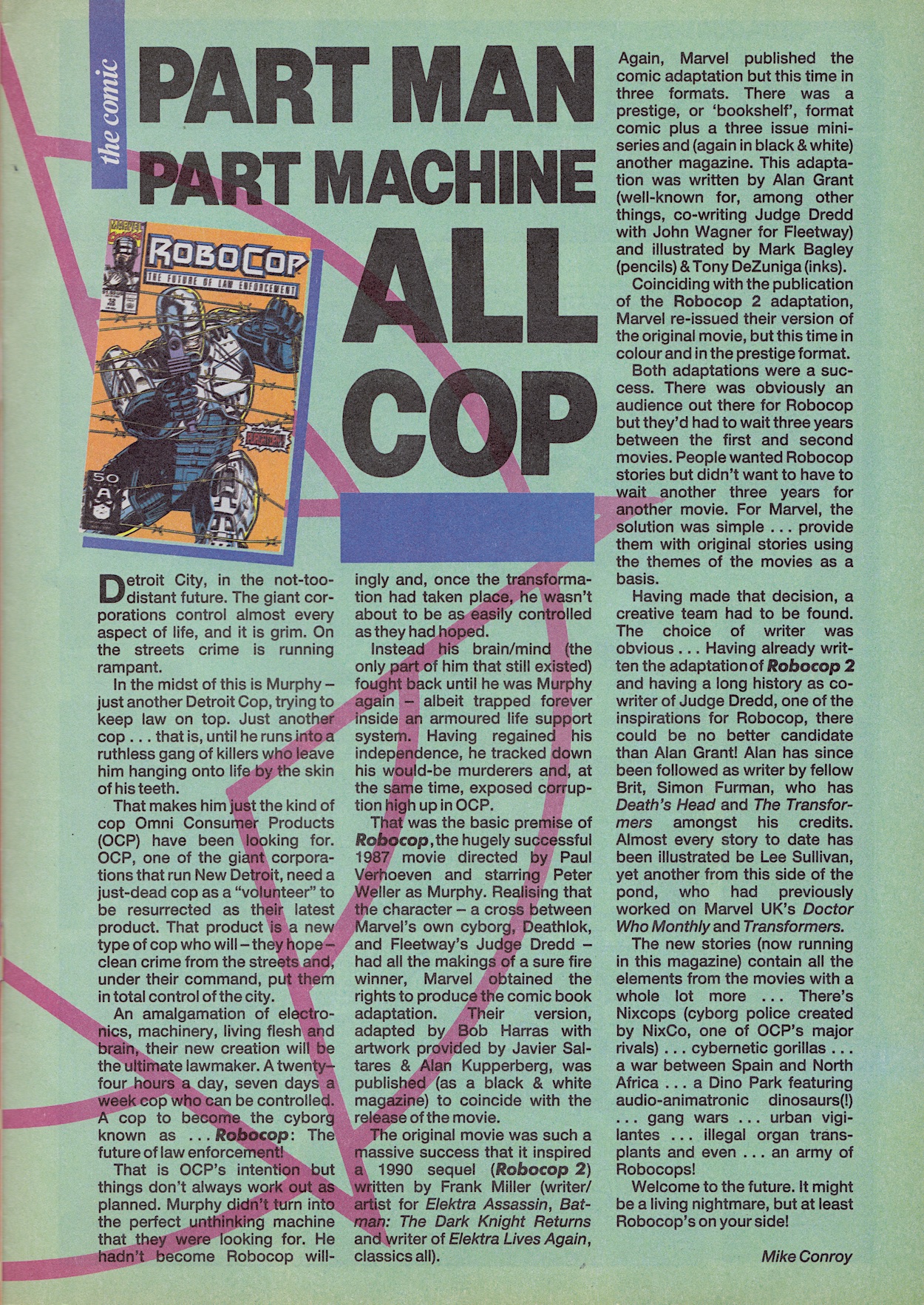To soften the blow (although this wasn’t the original intention) we get a third feature for our part man, part machine, all cop hero, billed on the contents page as an interview with Marvel UK artist Lee Sullivan who did superb work on RoboCop for the American arm of the publisher. Calling it this is a bit of a stretch though. It reads as if two quotes by Lee were pulled from a general career interview, with one answer about RoboCop and the other about Doctor Who, filled out with information about the artist.