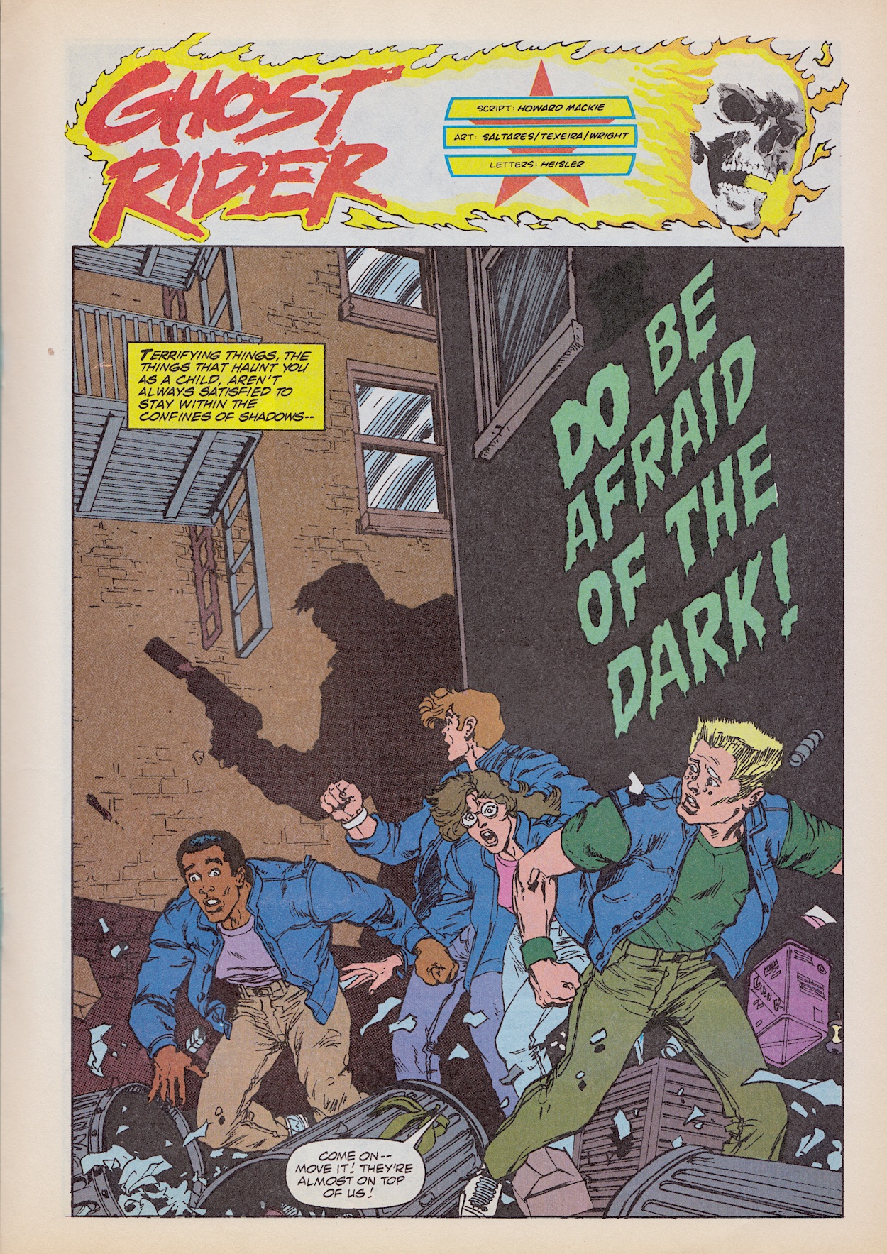 Danny Ketch and his Spirit of Vengeance get the bulk of pages this issue with part one of Do Be Afraid of the Dark (written by Howard Mackie, pencils by Javier Saltares, inks by Mark Taxeira, colours by Gregory Wright, letters by Michael Heisler) which begins with the gang of kids from previous issues, now referred to as the Cypress Pool Jokers, hunted down by who we assume are Deathwatch’s minions. Demanding to know where the canisters are, they’re threatening the lives of the kids at gunpoint when a bright light and roar of a motorbike from a nearby hedge halt proceedings.