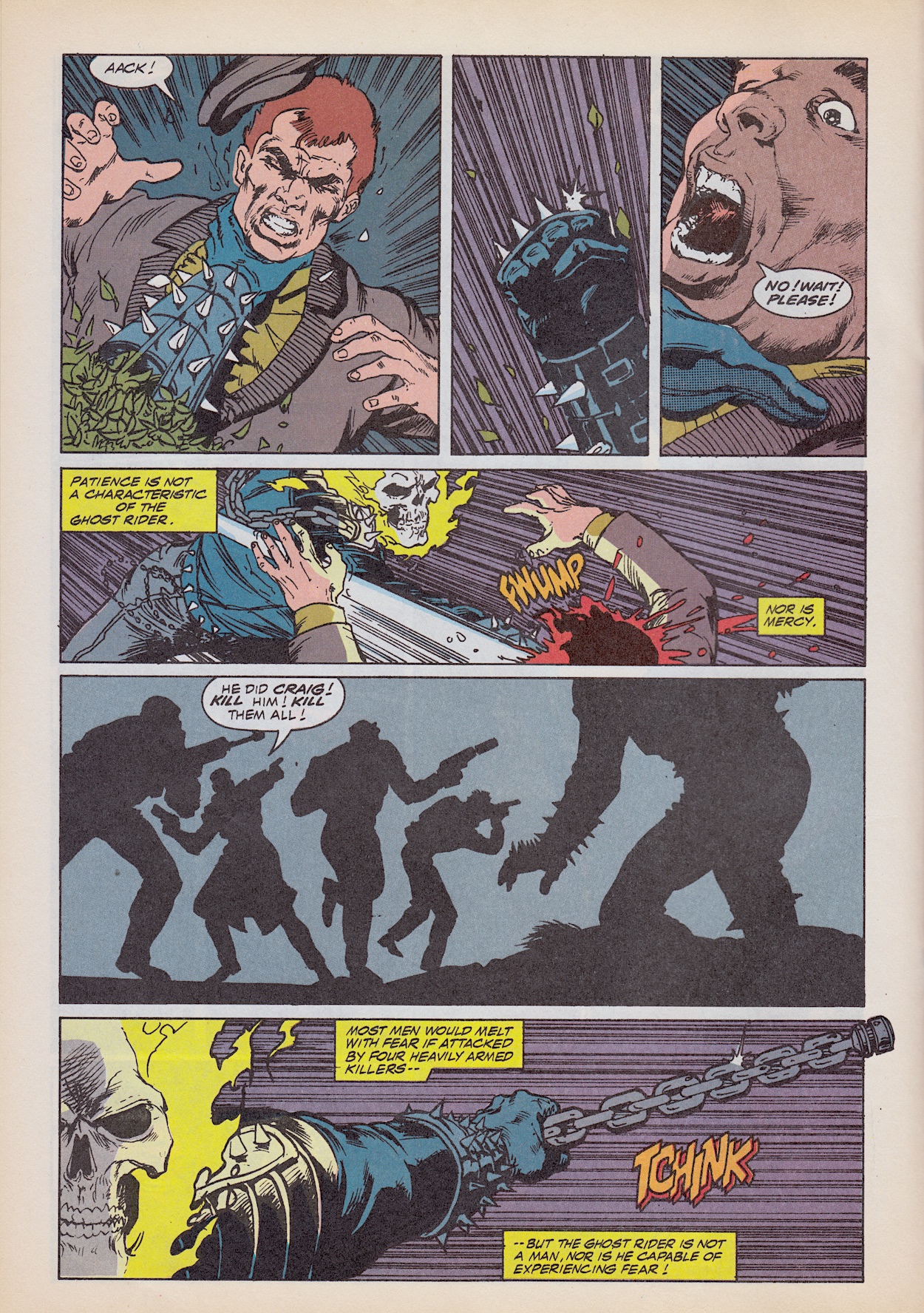 On the next page it’s stated how Ghost Rider would normally take his time, ensuring to inflict the most pain possible on these men, equal to the pain of each individual’s past offences. But this night he needs answers and so he lashes his magical chain around one of them and drags them away off the back of his bike, the criminal’s body bouncing up and down on the road over the ghostly flames.