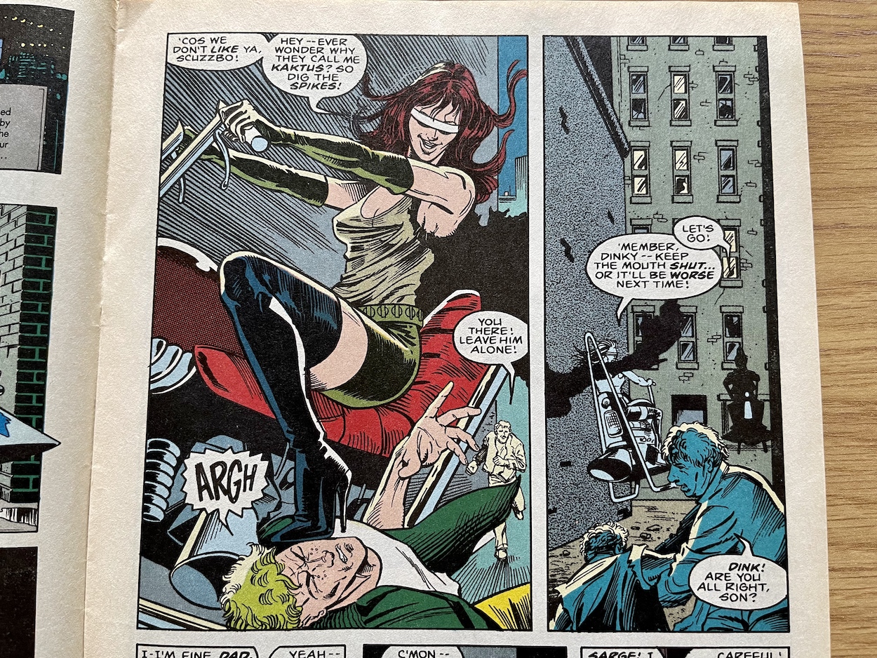 The final strip this week is Ghost Rider (written by Howard Mackie, pencilled by Javier Saltares, inked by Mark Taxeira, coloured by Gregory Wright, lettered by Michael Heisler) and it’s all about that mysterious suitcase and the young gang of kids who stole it. Kingpin’s men have tracked them down and sent in that well worn stereotype, the bad guy who is so overly polite you just know he means the exact opposite of what’s coming out of his mouth. We must remember these stories are nearly 30 years old. His hints soon turn to actual threats until one of the kids is stabbed by a flying knife.