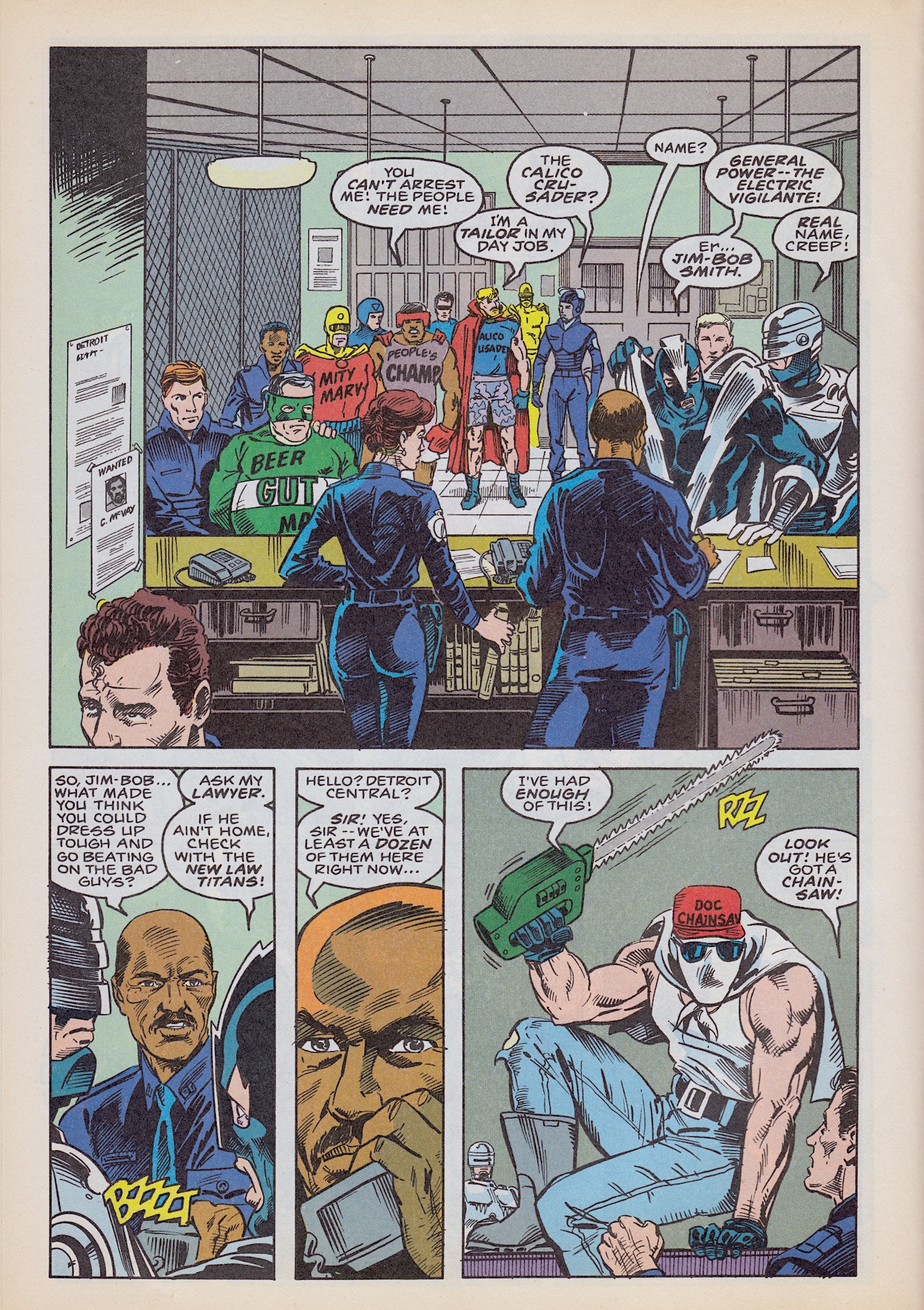 I don’t think I need to make any more comment on that one. Soon the sarge barks an order; all the vigilantes are to be charged with misdemeanours and set free. This happens much to the chagrin of the officers but has come down from the “very top” and thus the main mystery of the new story begins. Robo leaves to see if there’s something he can do (but we’re not given any more hints as to what this could be) and then we see former mugging victim Dink and his dad settling down to watch the city’s latest reality show, ‘The Detroit Vigilante‘ and that’s where it ends.