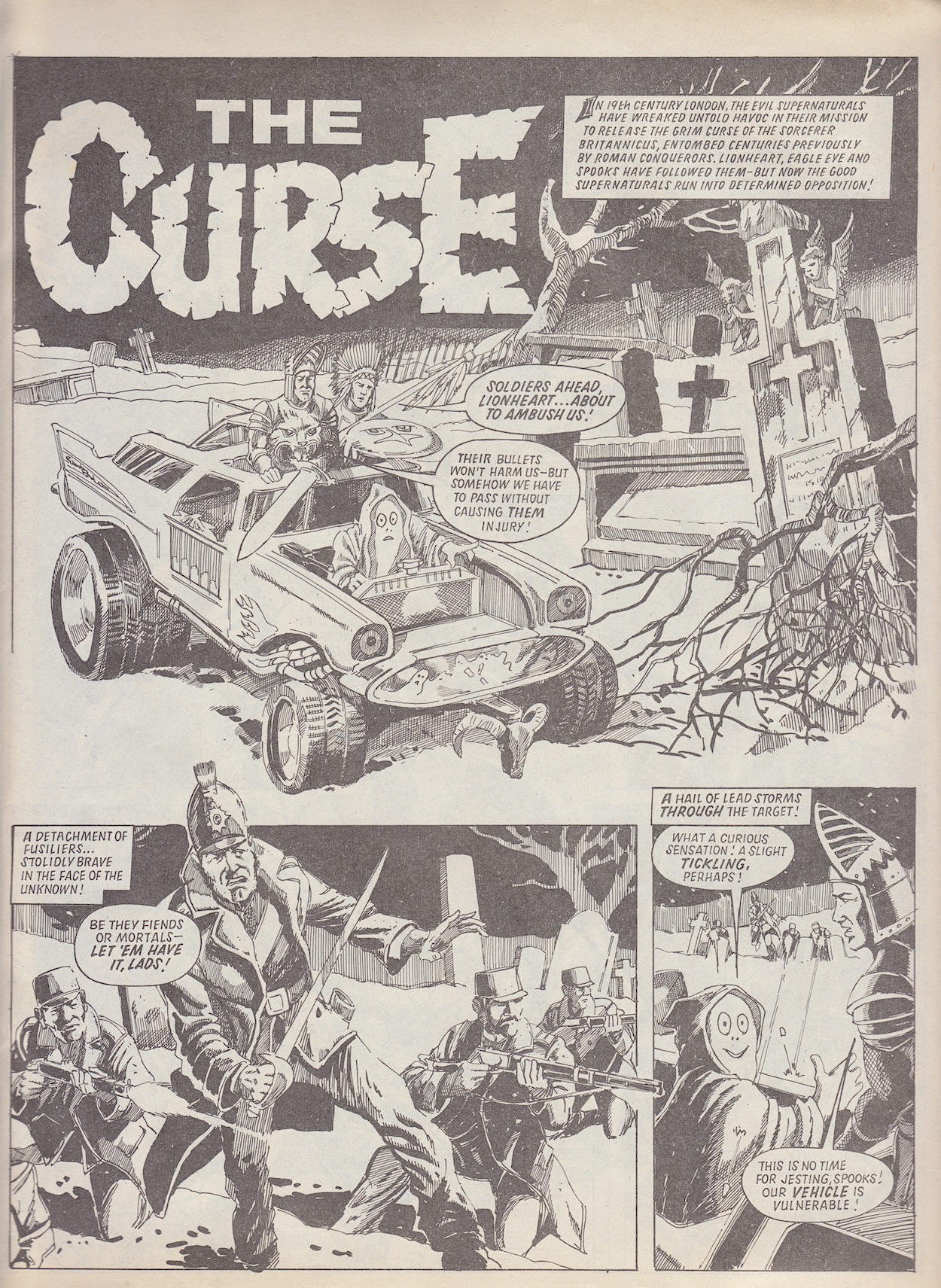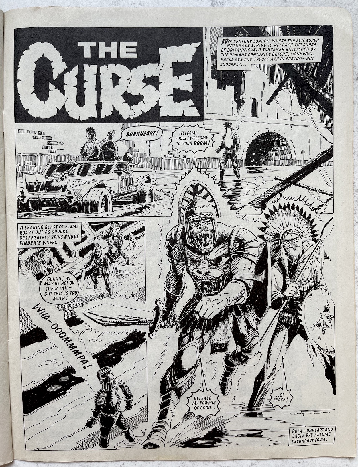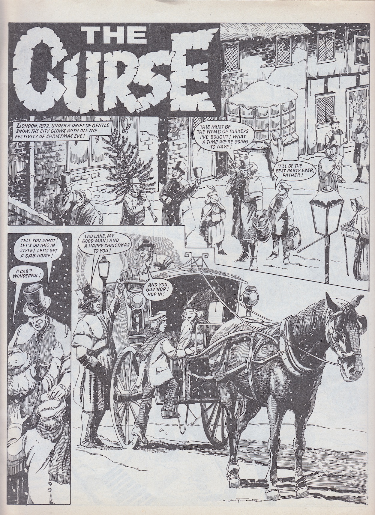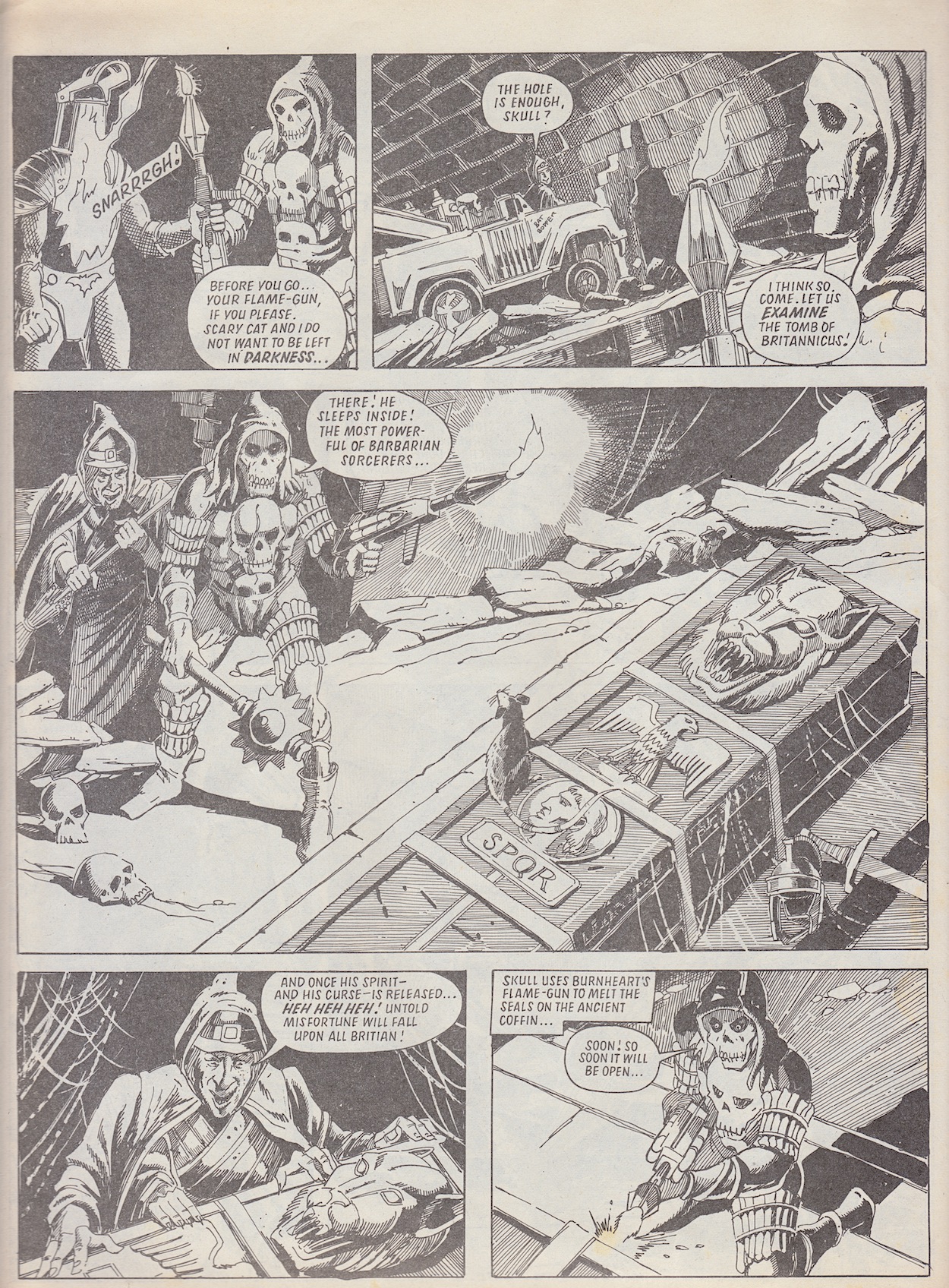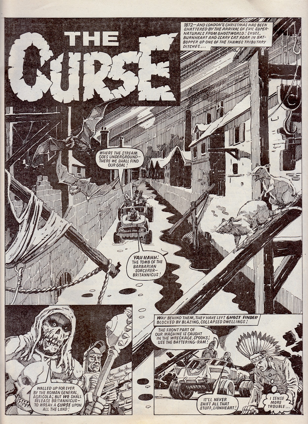 Let’s hope for more than this from our final strip, The Curse and the spooky Victorian setting is still oozing atmosphere thanks to artist Alan Langford, so its conclusion is off to a good start anyway. To speed things along the slightly harder edge Alan’s strips have had has been somewhat lost. Although things do start off excitedly enough with Skull and Burnheart looking likely to succeed in releasing the curse of Britannicus upon the UK.