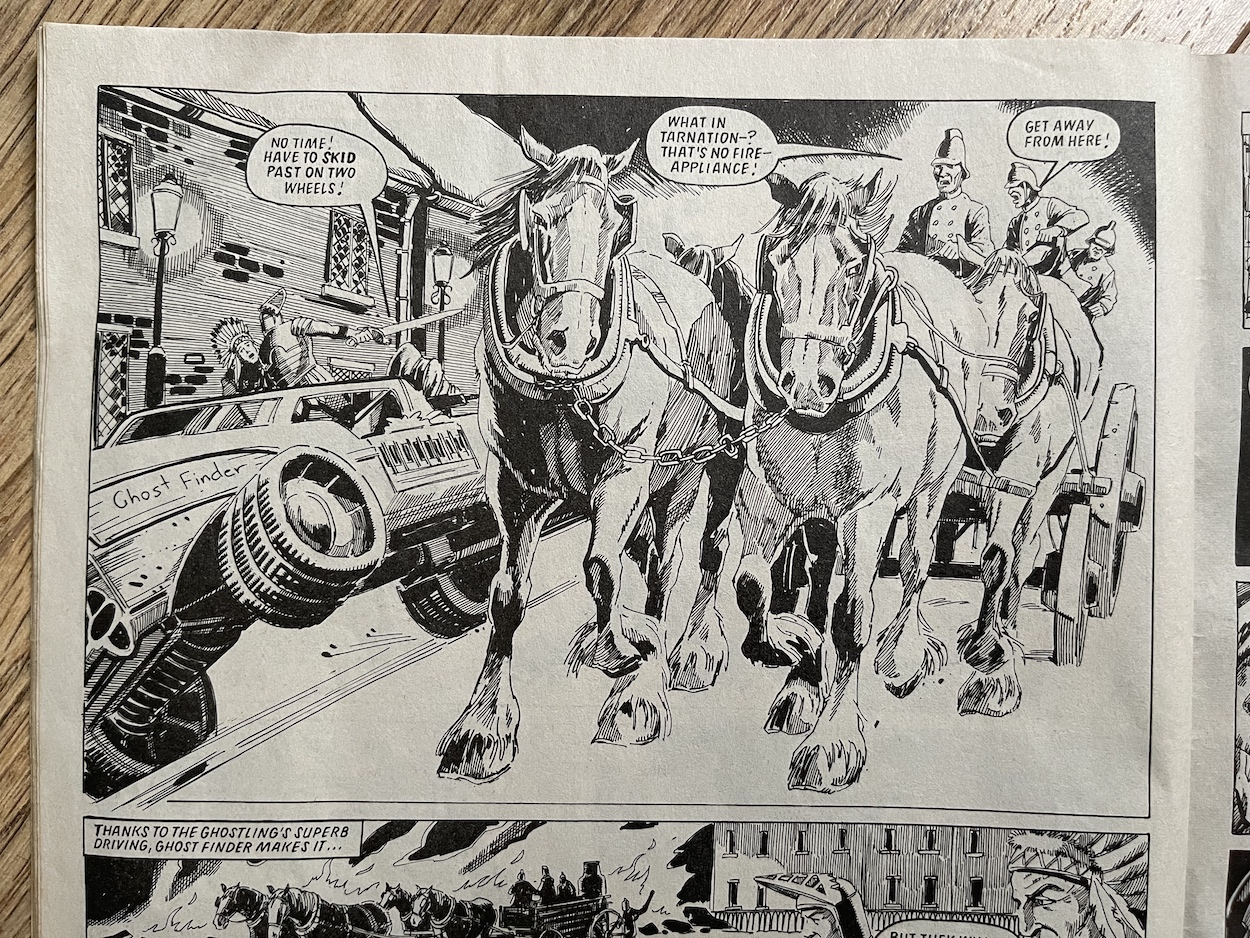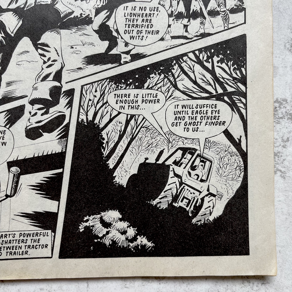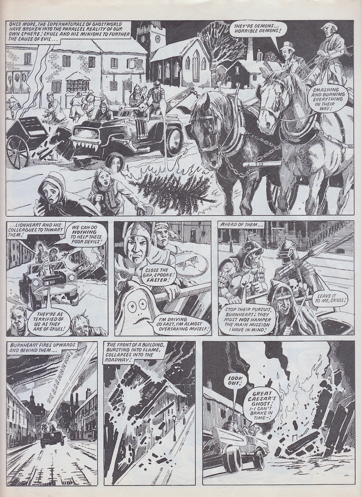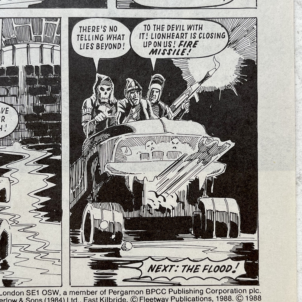 The wall they came up against last time did indeed unleash a torrent of water, which both the good and bad vehicles barely escape. It’s all ready for an epic confrontation. They’ve been fighting over this ever since Christmas after all, but in the end one panel showing Lionheart and Eagle Eye bopping their evil counterparts is all the battle we’ll get. In the background, Spooks loads the coffin on to the Ghost Finder and Skull just admits defeat. He even tells his cronies to stop fighting and retreat.