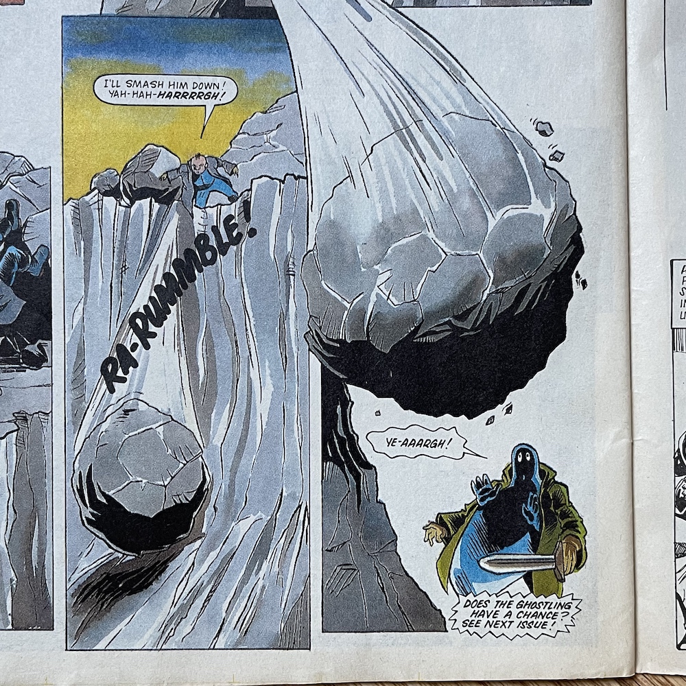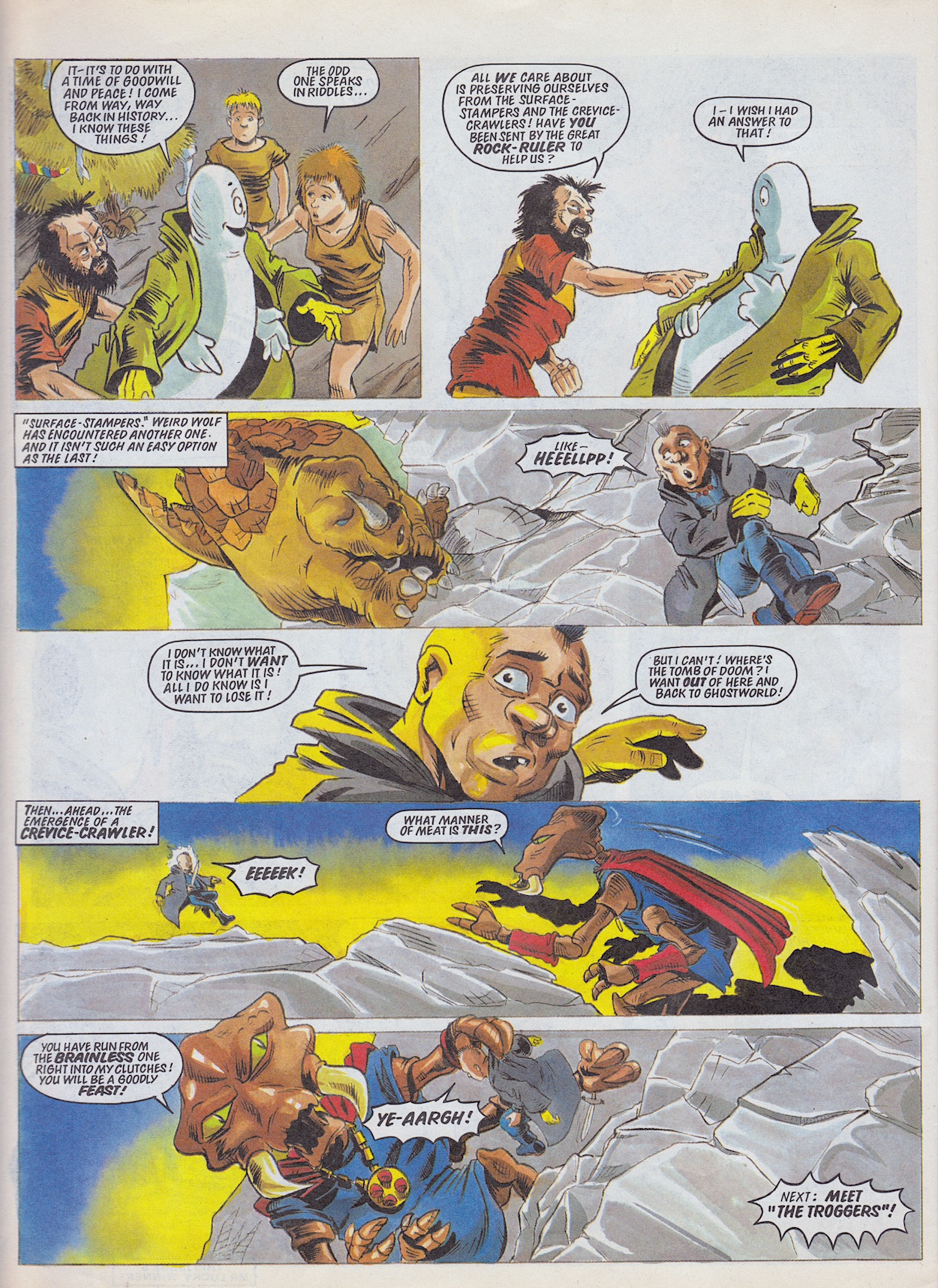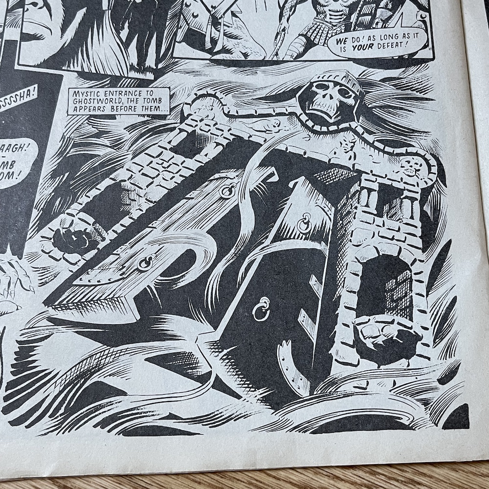 To get things back to some form of status quo Weird Wolf is thrown off his clifftop perch and by complete coincidence the Tomb of Doom appears beneath him, doors open for him to fall into, even though that contradicts Spooks’ previous predicament of finding the tomb’s location before it disappeared. Then the huge battle of the beasts is discussed by Spooks and (the brilliantly drawn) Thunder Bolt and that’s pretty much it before they disappear through the Tomb too. There are one or two action panels but for all intents and purposes the story is basically concluded with a, “oh well, nothing we can do, let’s go home”.