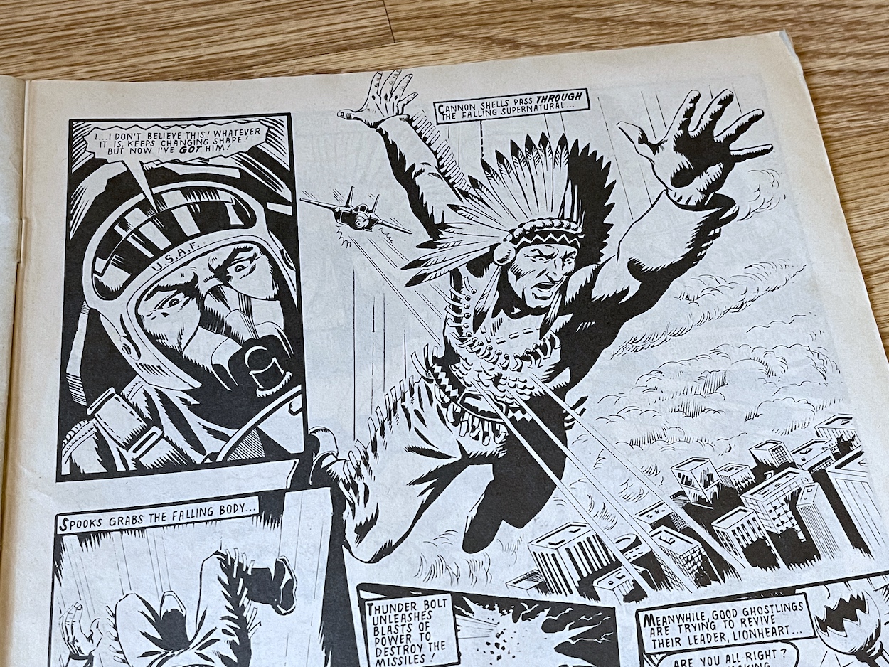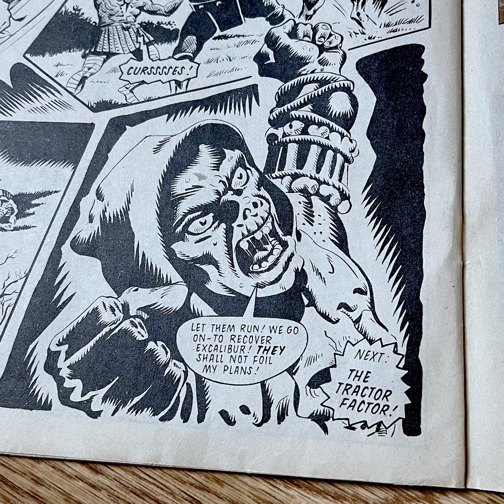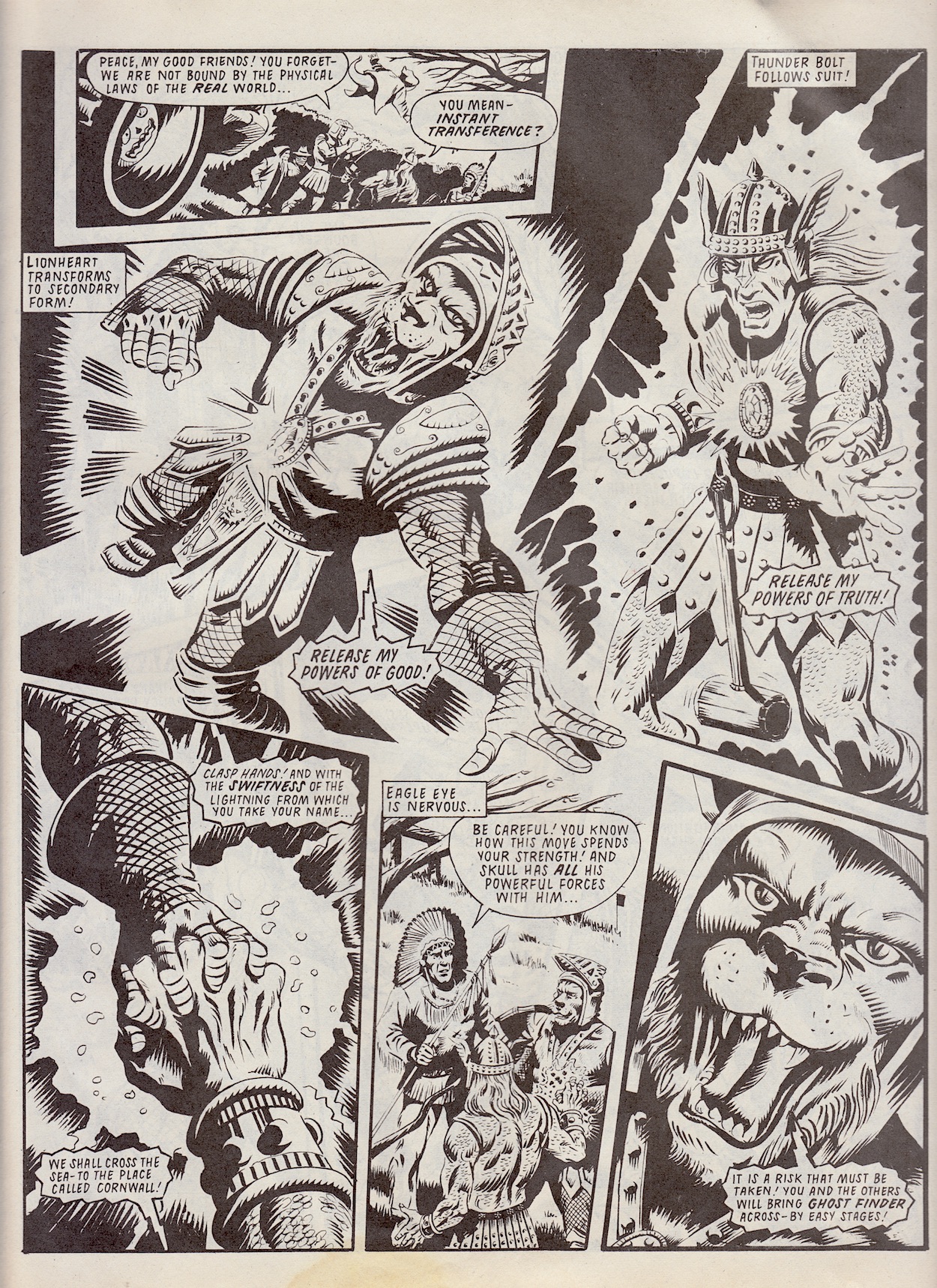 Eagle-Eye‘s selflessness in instantly transferring himself into battle in a weakened state doesn’t have the tension it should’ve had because his friends once again swoop in on their flying vehicle to save him and quite easily defeat the evil Super Naturals, even though they’ve been pretty evenly matched with them since the outset. Meanwhile, Skull has gone ahead to the lake and summons King Arthur’s sword. It’s here we get some genuine comedic moments and an inkling of where the comic could’ve gone in the future.