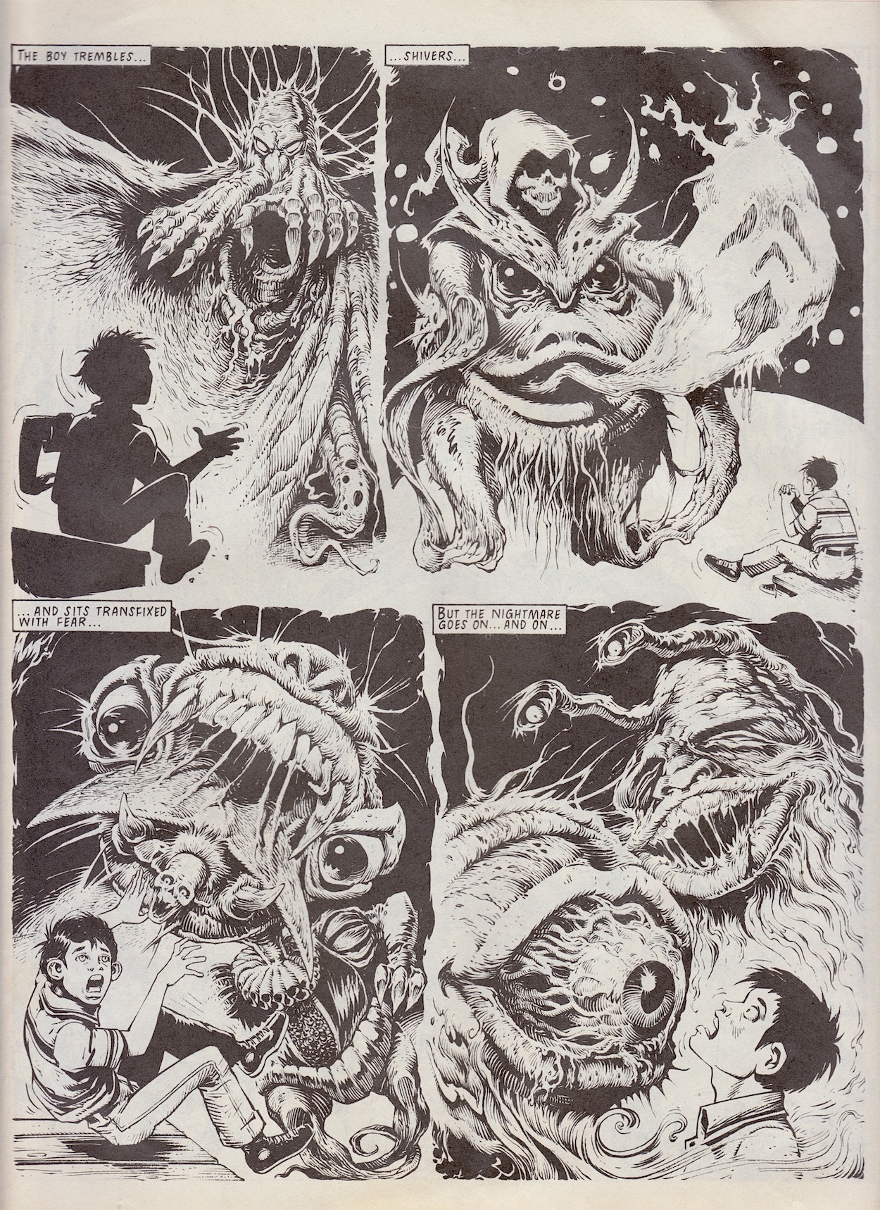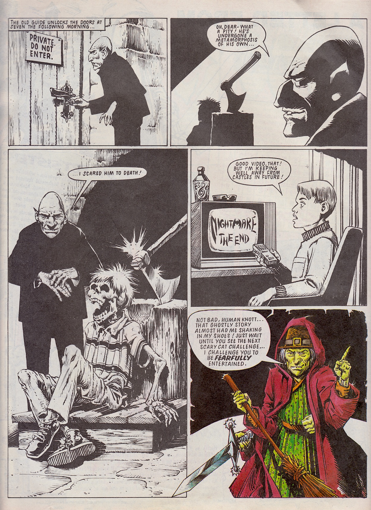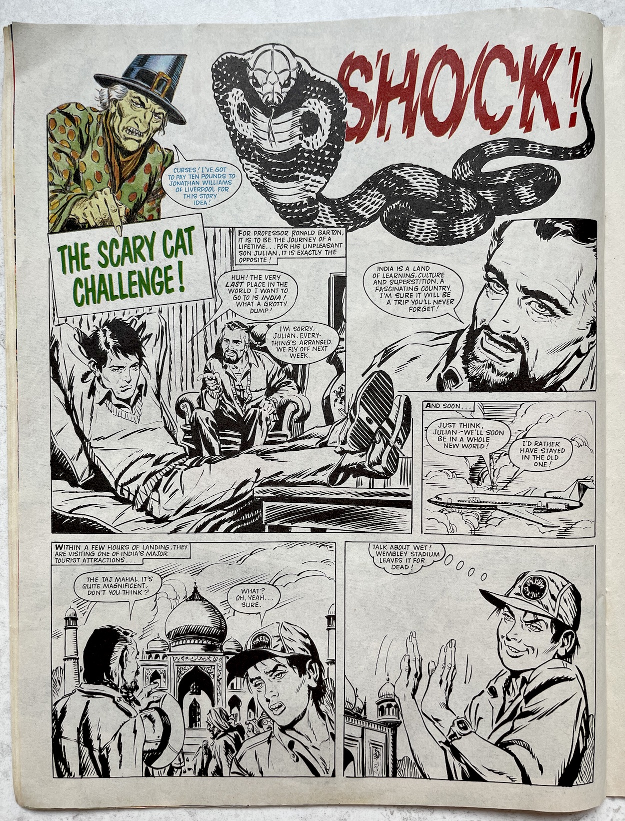 So while I did own this issue the rest of it feels brand new to these eyes. First up is the final Scary Cat Challenge. Genie is based on an idea sent in by reader Keith Scott and drawn by Alan Burrows (Beano, Red Dwarf, Transformers). It begins as we meet trespassing kid Jason Watkins just before he discovers an old lamp after falling through the roof of some buried Roman ruins. The genie that pops out is brilliantly snarky, a far cry from those we’d seen in movies up to this point (before Disney‘s Aladdin). Young Jason wishes himself out of the pit and is flown out by the magic of the genie. Awed by this, Jason starts to eye up what else he could wish for.