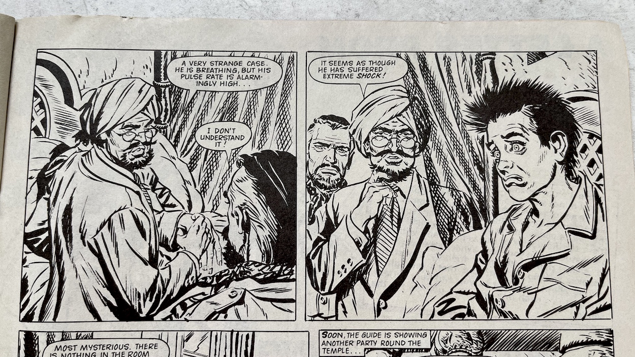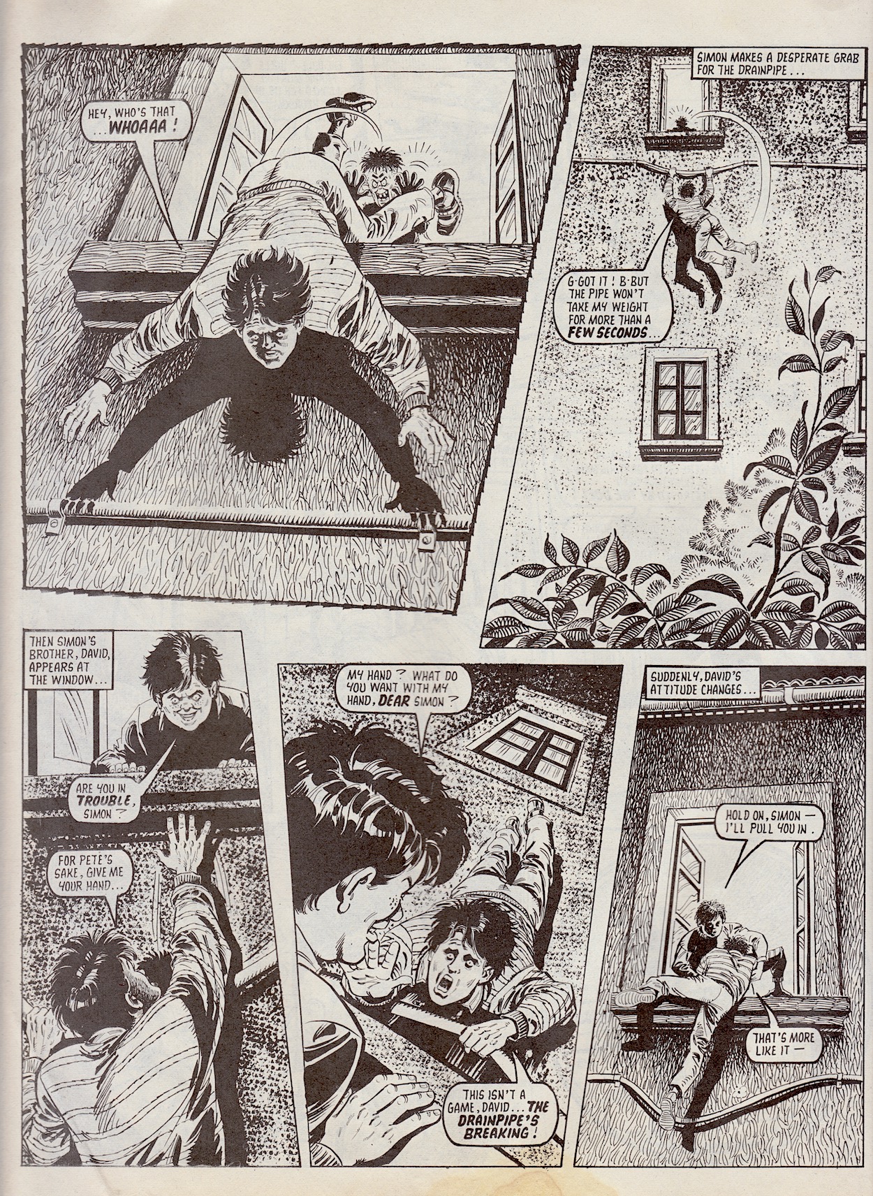 So here we are then, the moment a lot of readers of these reviews have been waiting for, it’s the final chapter of The Doll! Will we get an ending? Will it be a satisfying one? Will it be left open-ended even though with hindsight we know the strip would never return? It kicks off with Simon saving his foster dad’s life when he spots a caterpillar on his hospital drip, a doctor confirming it had been tampered with. A few minutes more and Frank would’ve been dead.