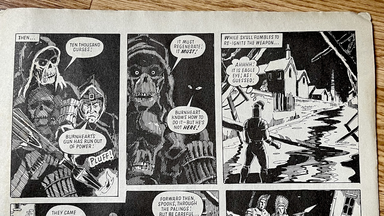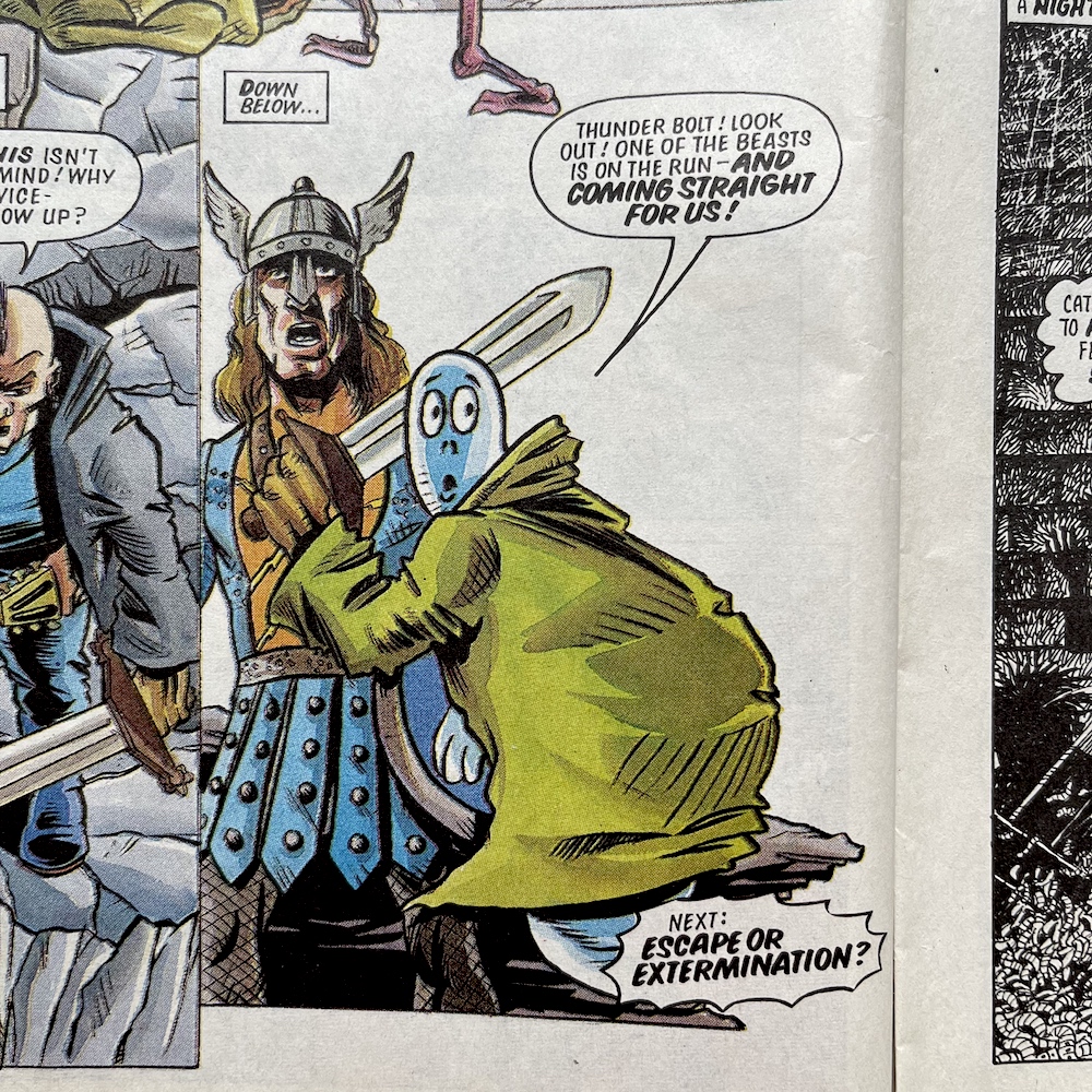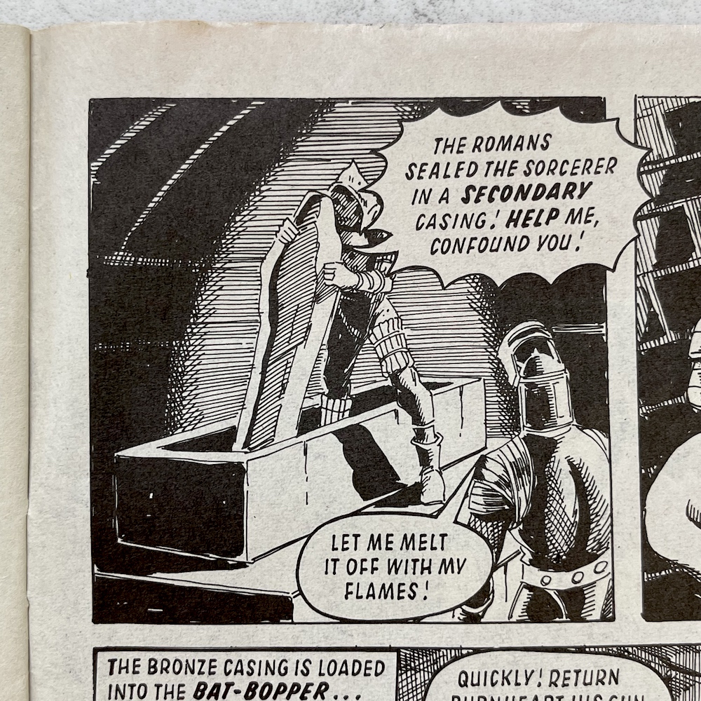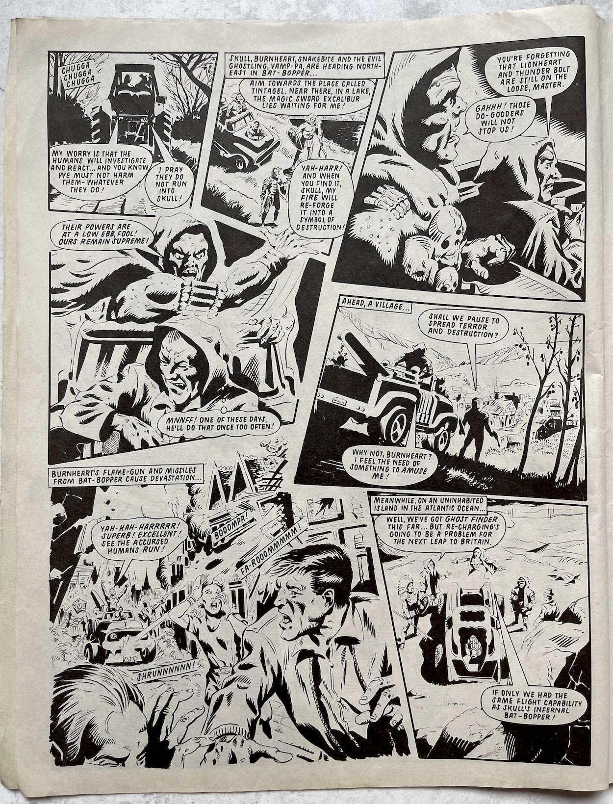 Between Mr. Lucky telling us the evil ones have been thrown back through the Tomb of Doom and Spooks mentioning what happened with Excalibur, both occurring off-page, it’s all a bit of an anti-climax. Then we see Skull, trapped in our real world with the Bat Bopper, which in itself could’ve made for an interesting tale, their leader trapped here with no way back and no henchmen to assist him. I think this serial would’ve been written by Barrie himself since it’s the main story, and he’s done everything he could to give us as satisfying an ending as possible, which is to be commended.