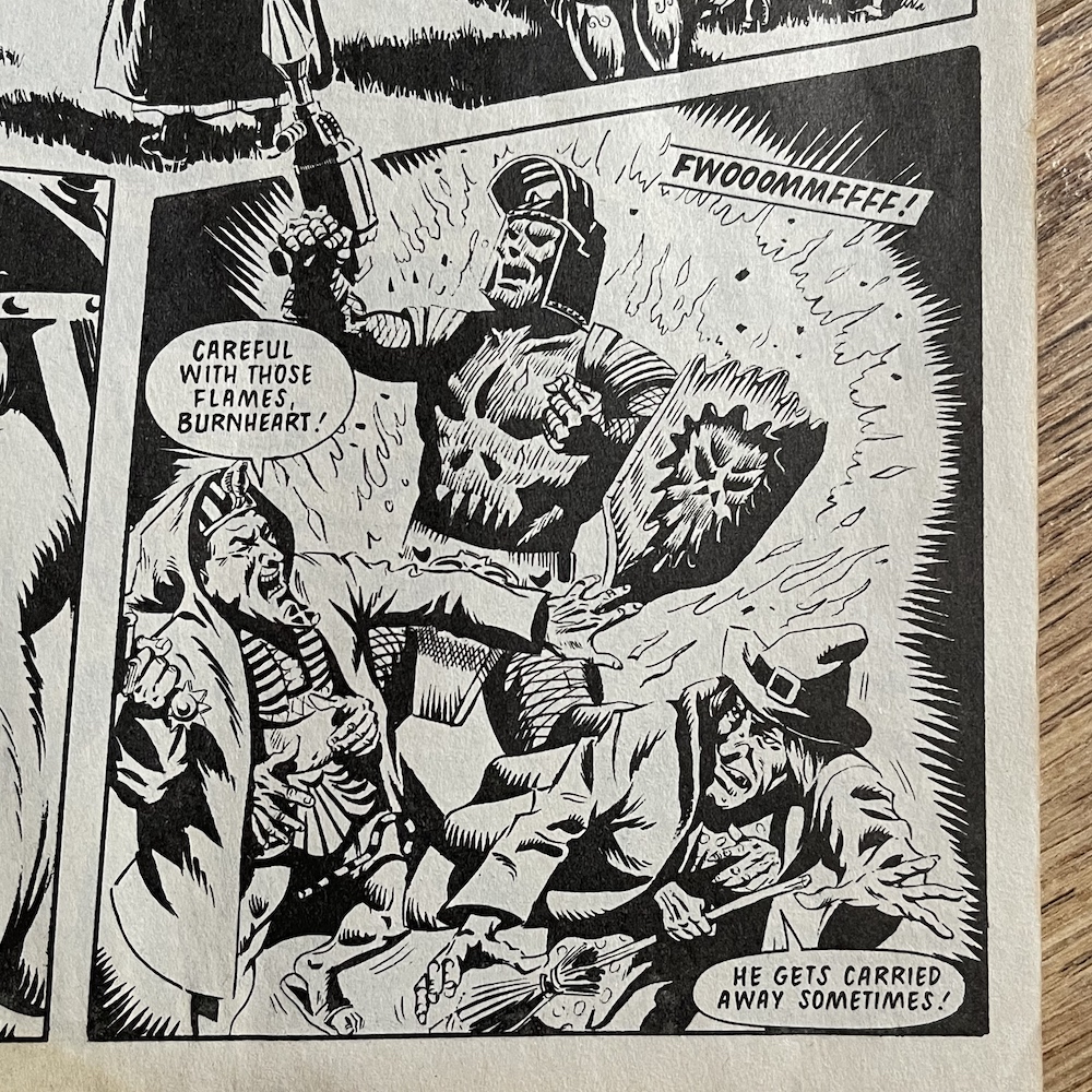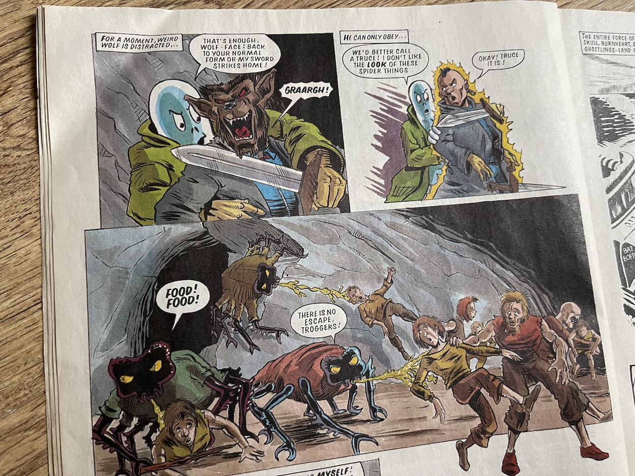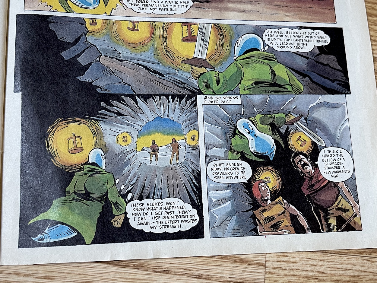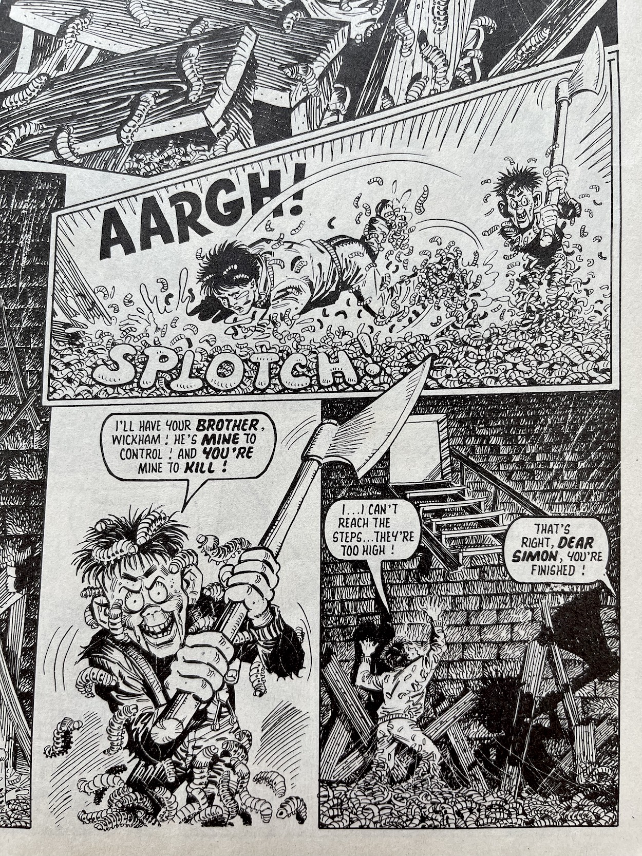 Between Mr. Lucky telling us the evil ones have been thrown back through the Tomb of Doom and Spooks mentioning what happened with Excalibur, both occurring off-page, it’s all a bit of an anti-climax. Then we see Skull, trapped in our real world with the Bat Bopper, which in itself could’ve made for an interesting tale, their leader trapped here with no way back and no henchmen to assist him. I think this serial would’ve been written by Barrie himself since it’s the main story, and he’s done everything he could to give us as satisfying an ending as possible, which is to be commended.