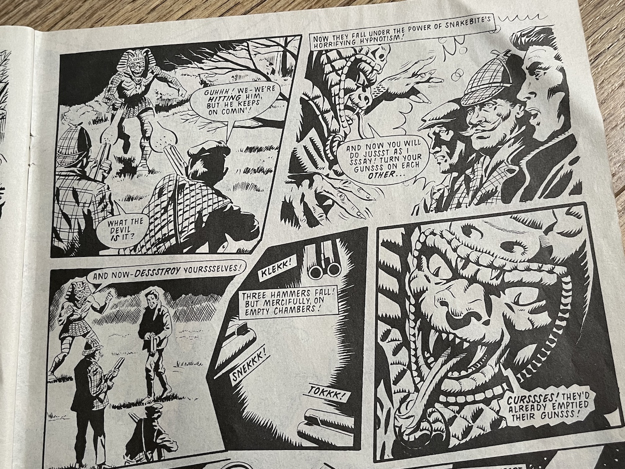 Since it’s the final issue and the last of Sandy James‘ posters I thought I’d better show it off to you and Snakebite is the star of the middle pages this time. We don’t get to see his full snake form but it does seem the comic has settled on how to consistently refer to each form a Super Natural can take and in which order. That’s a brilliant shield totem design too.