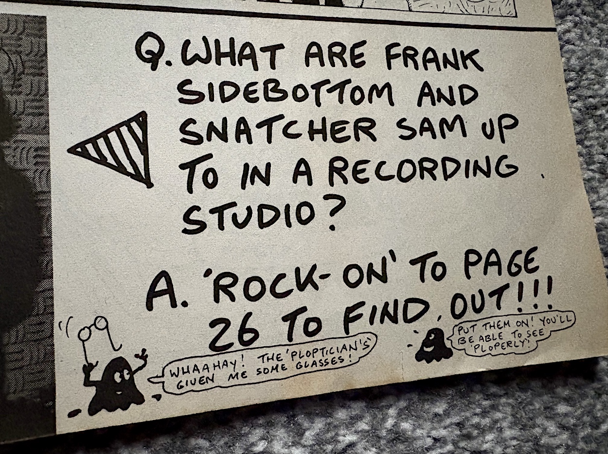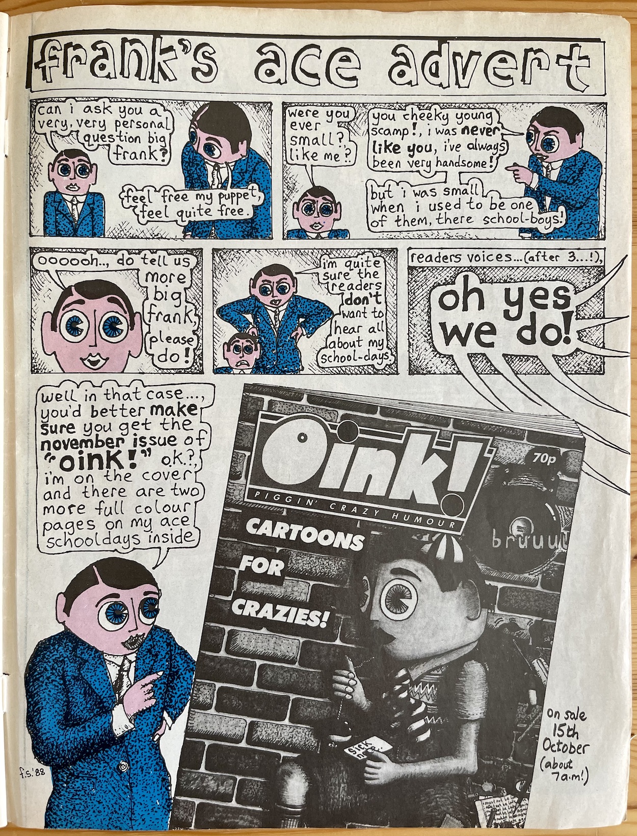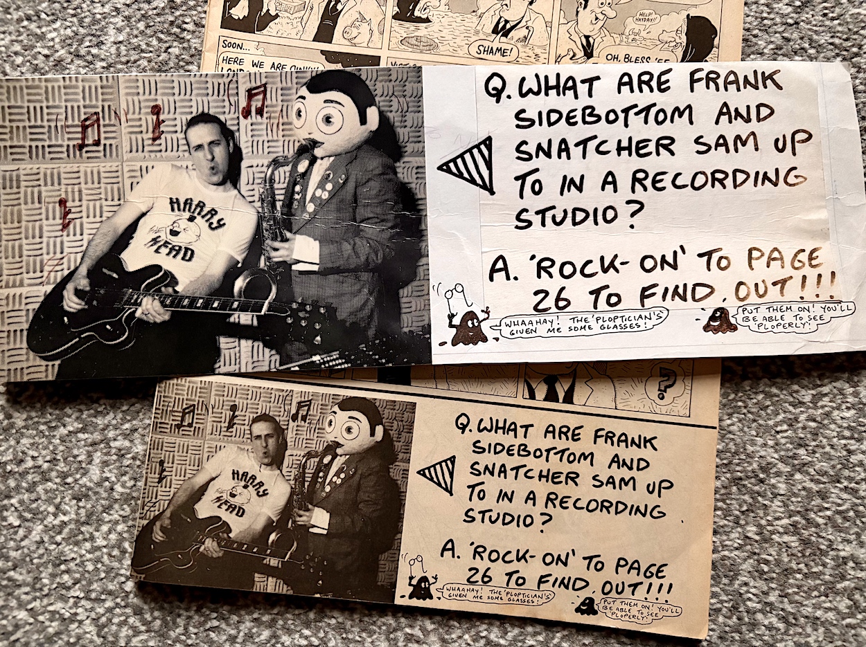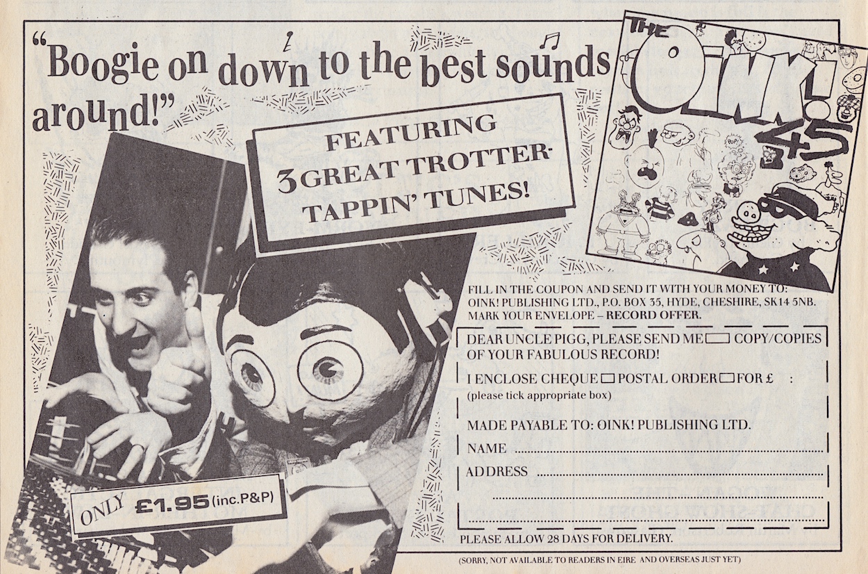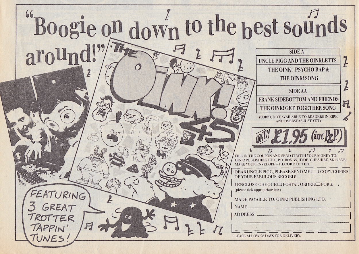 The first advert, below, certainly grabbed my attention because I can remember pestering my parents with it! This was as different a piece of comics merchandise as you were ever likely to get and I just had to have it! This was the kind of thing you’d only have seen in OiNK, thanks to the musical talents of Marc Riley (Snatcher Sam), Chris Sievey (Frank Sidebottom) and co-editor and writer Tony Husband.