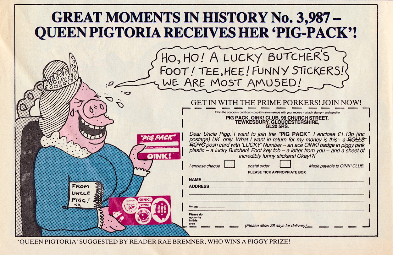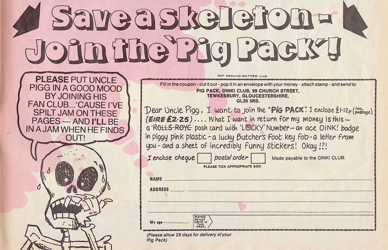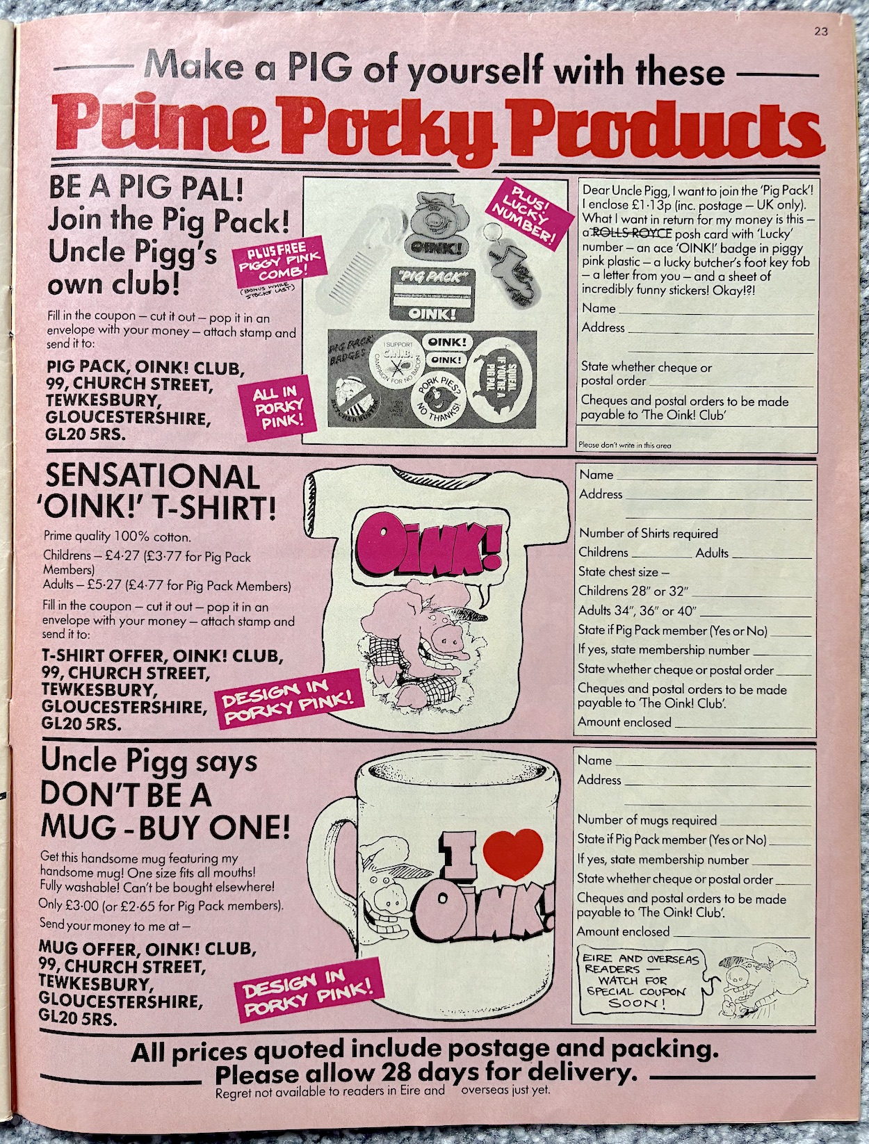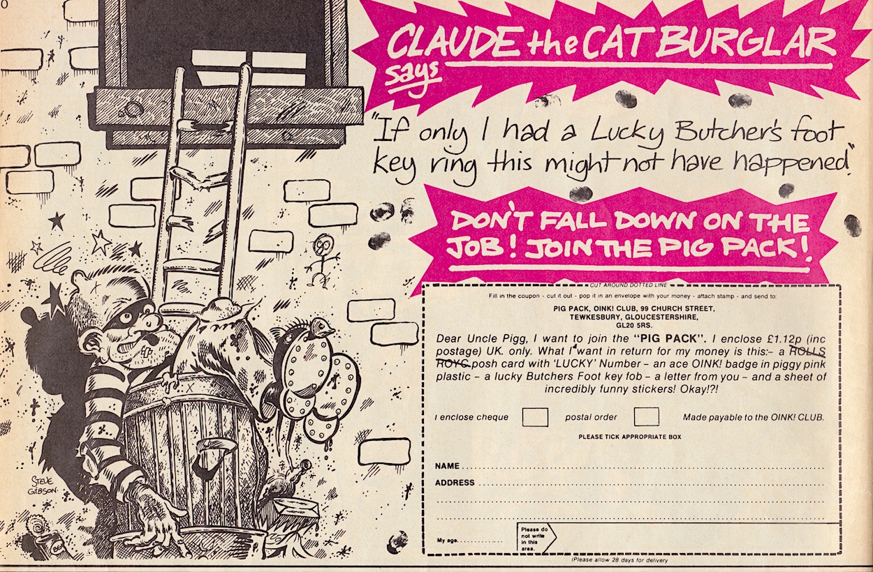 Right from the off OiNK was different in every way, even with its fan club. Older readers of this blog will have had (or will have known someone who had) the famous Gnasher furry badge as a child from Beano’s fan club. But OiNK went one better. Not only could we proudly display a piggy pink badge of Uncle Pigg (at a time when boys weren’t meant to like anything pink), we could own a lucky butcher’s foot too!