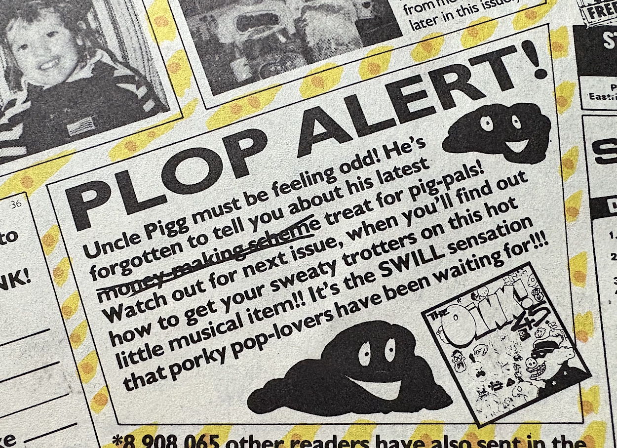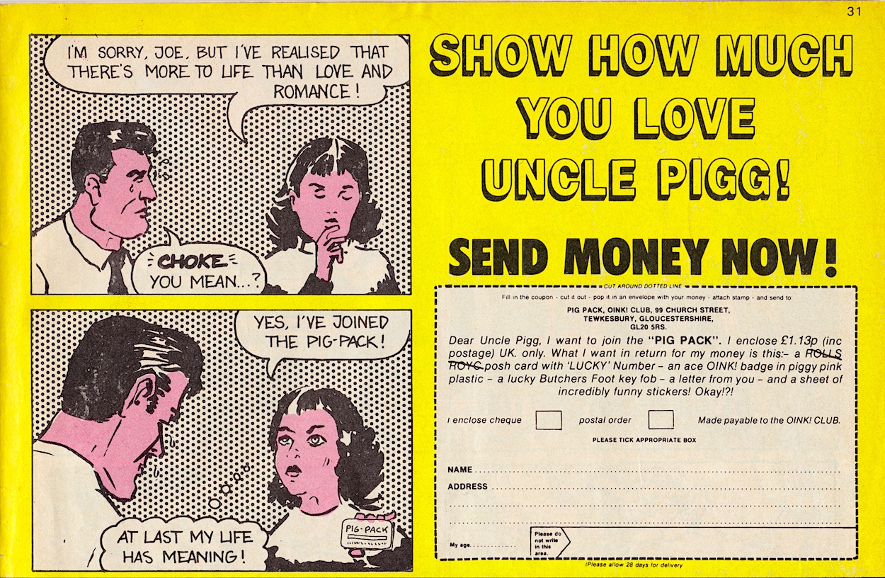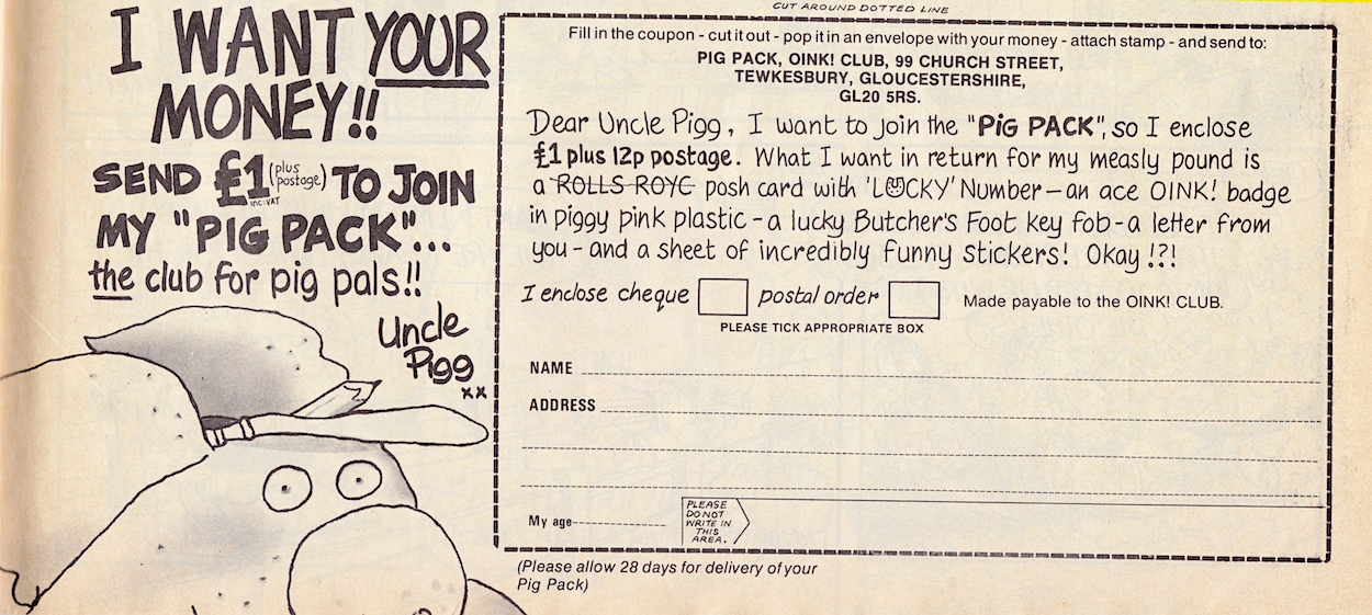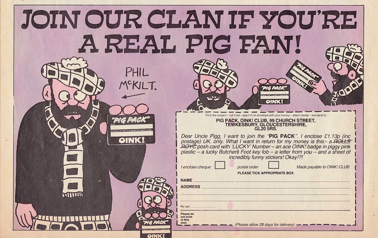 Right from the off OiNK was different in every way, even with its fan club. Older readers of this blog will have had (or will have known someone who had) the famous Gnasher furry badge as a child from Beano’s fan club. But OiNK went one better. Not only could we proudly display a piggy pink badge of Uncle Pigg (at a time when boys weren’t meant to like anything pink), we could own a lucky butcher’s foot too!