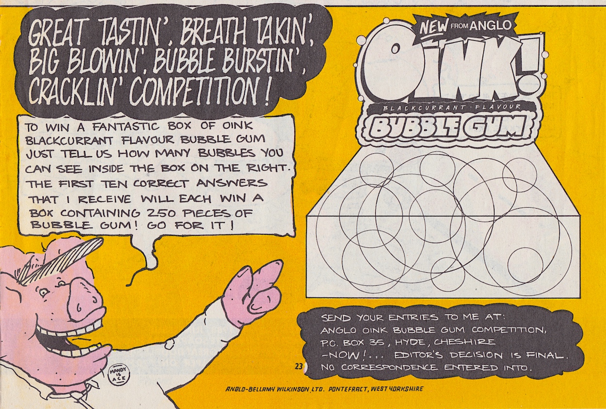 I never saw the bubblegum in my local sweet shop and, just like the sweatshirt, didn’t even see a photograph until that same post from last Christmas in which Patrick himself held up a surviving empty box. I can’t help but wonder, what if OiNK had remained as the popular fortnightly comic from its heyday and had continued on for more years to come. What other merchandise would we have seen Uncle Pigg churn out to fill his coffers?