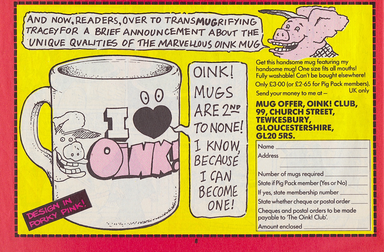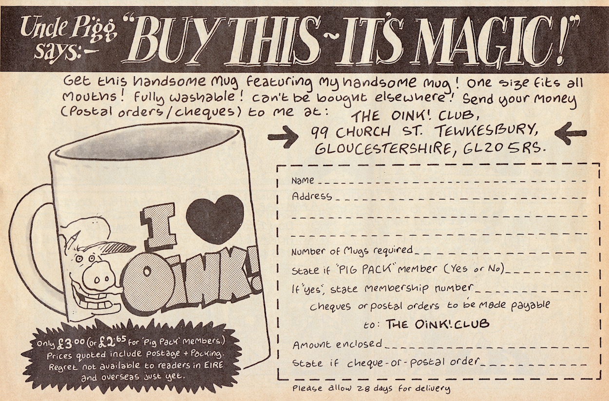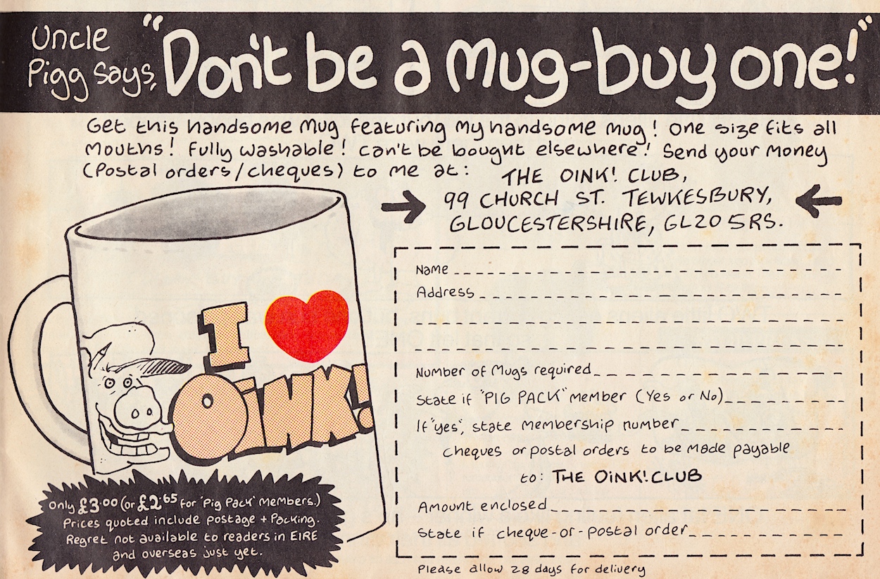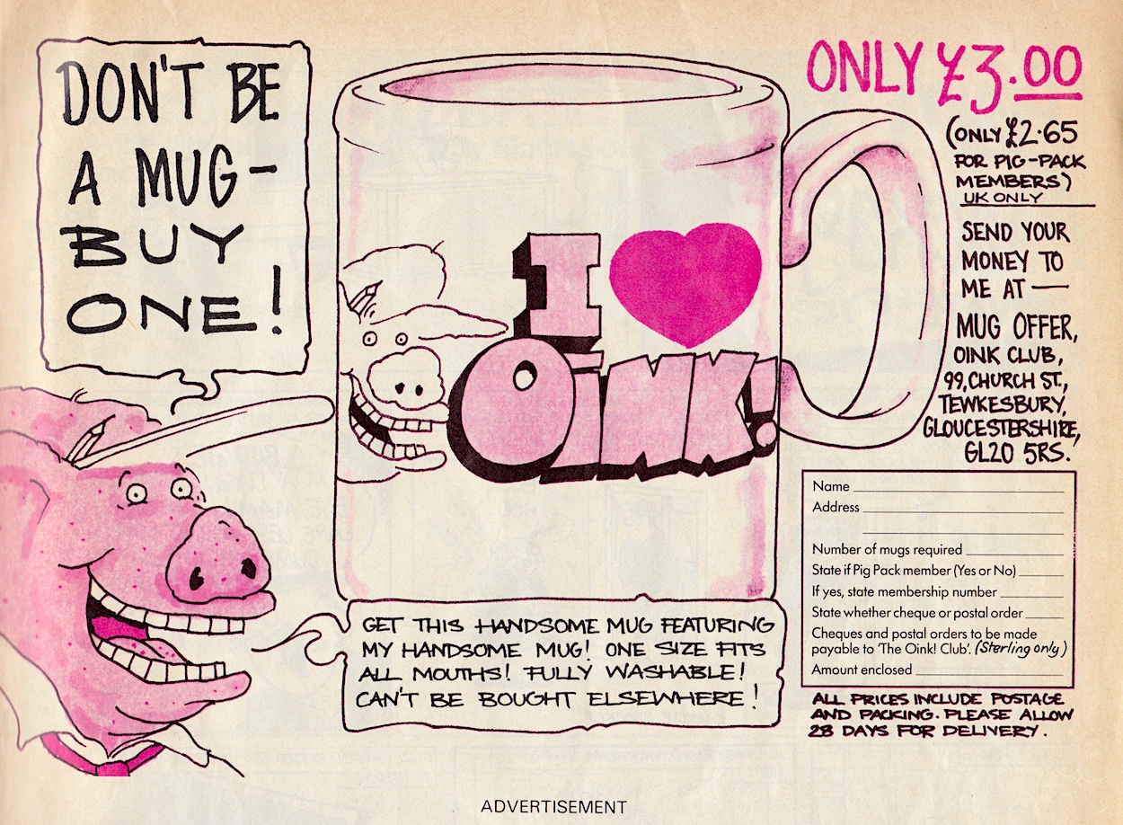 The t-shirt, pig pack and mug could be seen as the three main pieces of merchandise, seeing as how they were advertised more than any other. They’d often appear alongside each other and I’m sure the page below will be very familiar to any pig pal reading this. (Note the addition of a piggy pink comb now, too!) This was printed in almost every issue over the course of several months in 1987, during what I call the Golden Age of OiNK when it was at its height for me personally.
