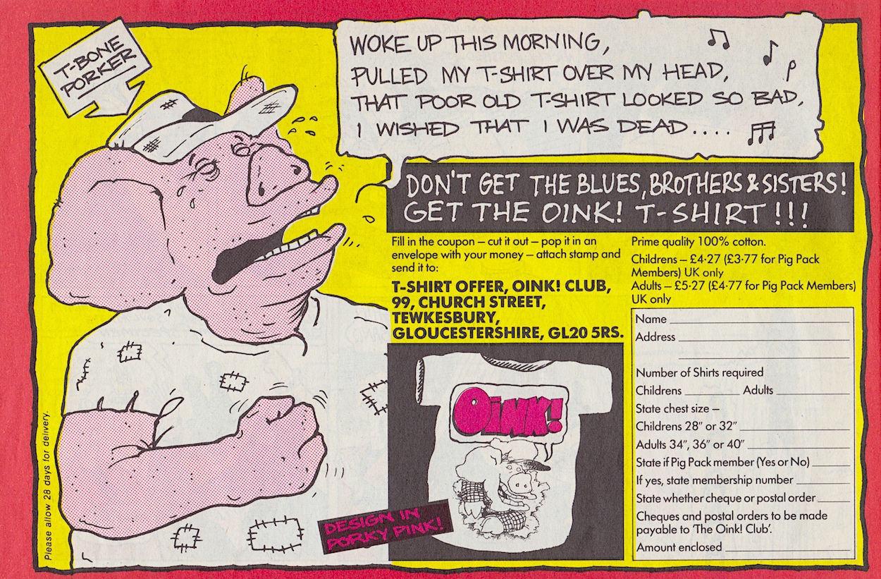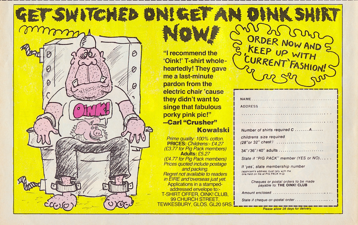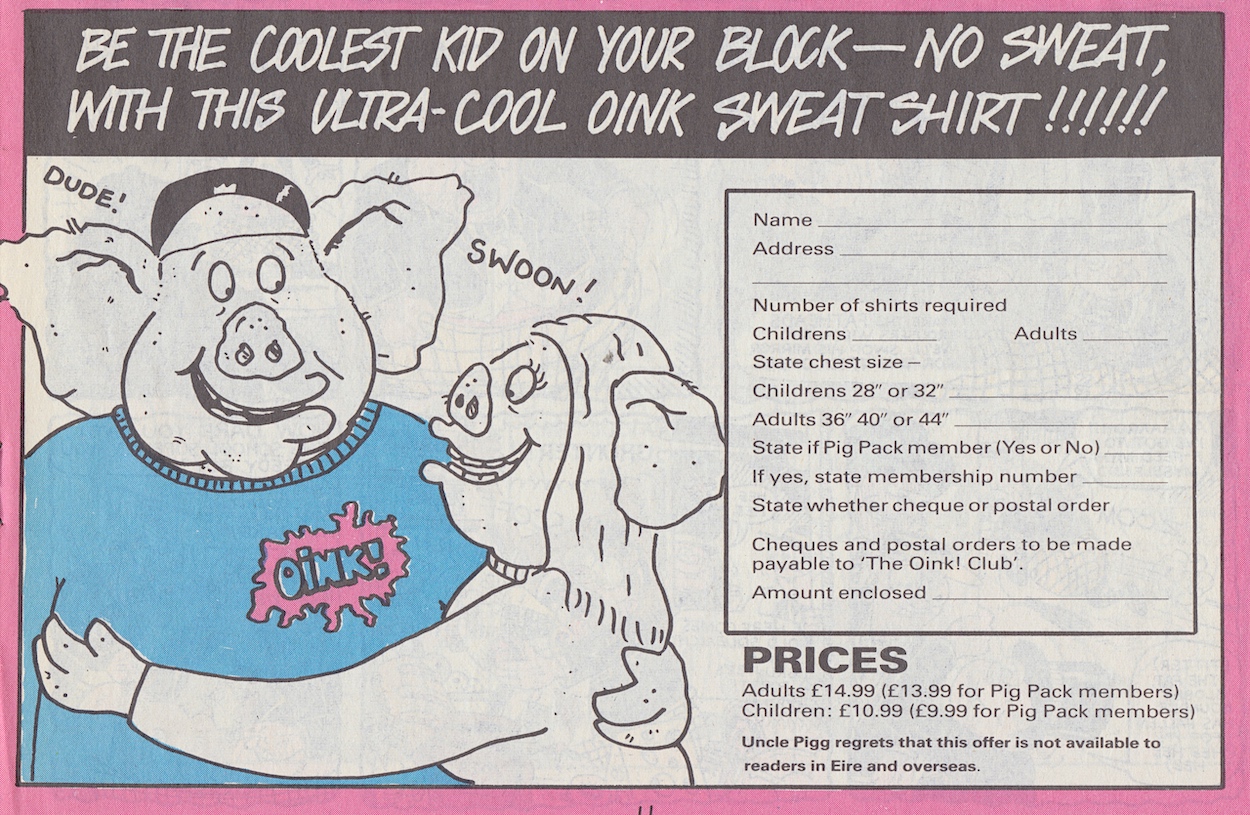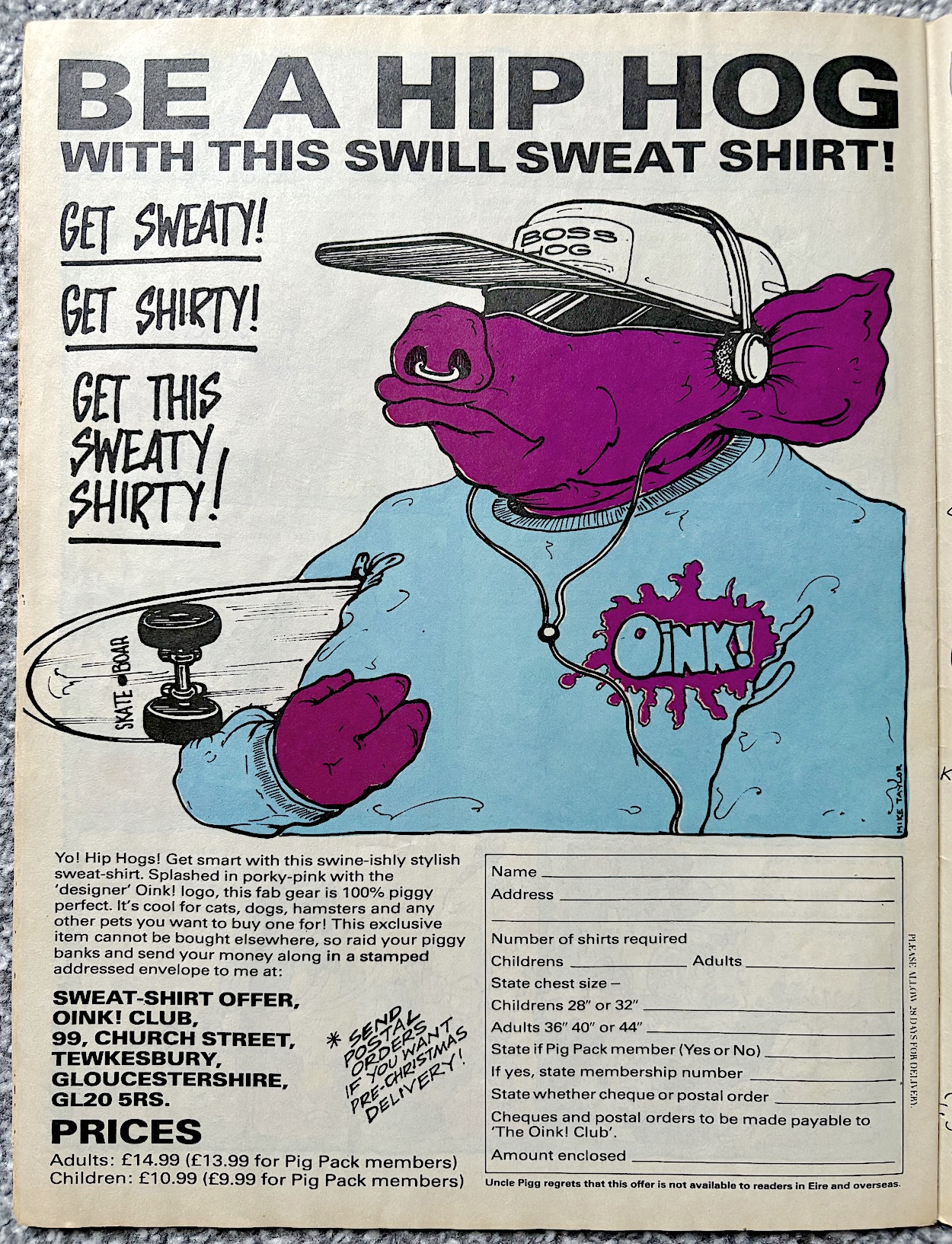 The first time I got to see what the OiNK sweatshirt actually looked like (since our ads were drawn rather than photographed, with the exception of the Pig Pack above) was during Christmas last year when I invited other fans to show off what they still owned. It’s a… unique fashion item. This full-page advert for it first appeared in #42, the Fantastic Fashion Issue funnily enough!