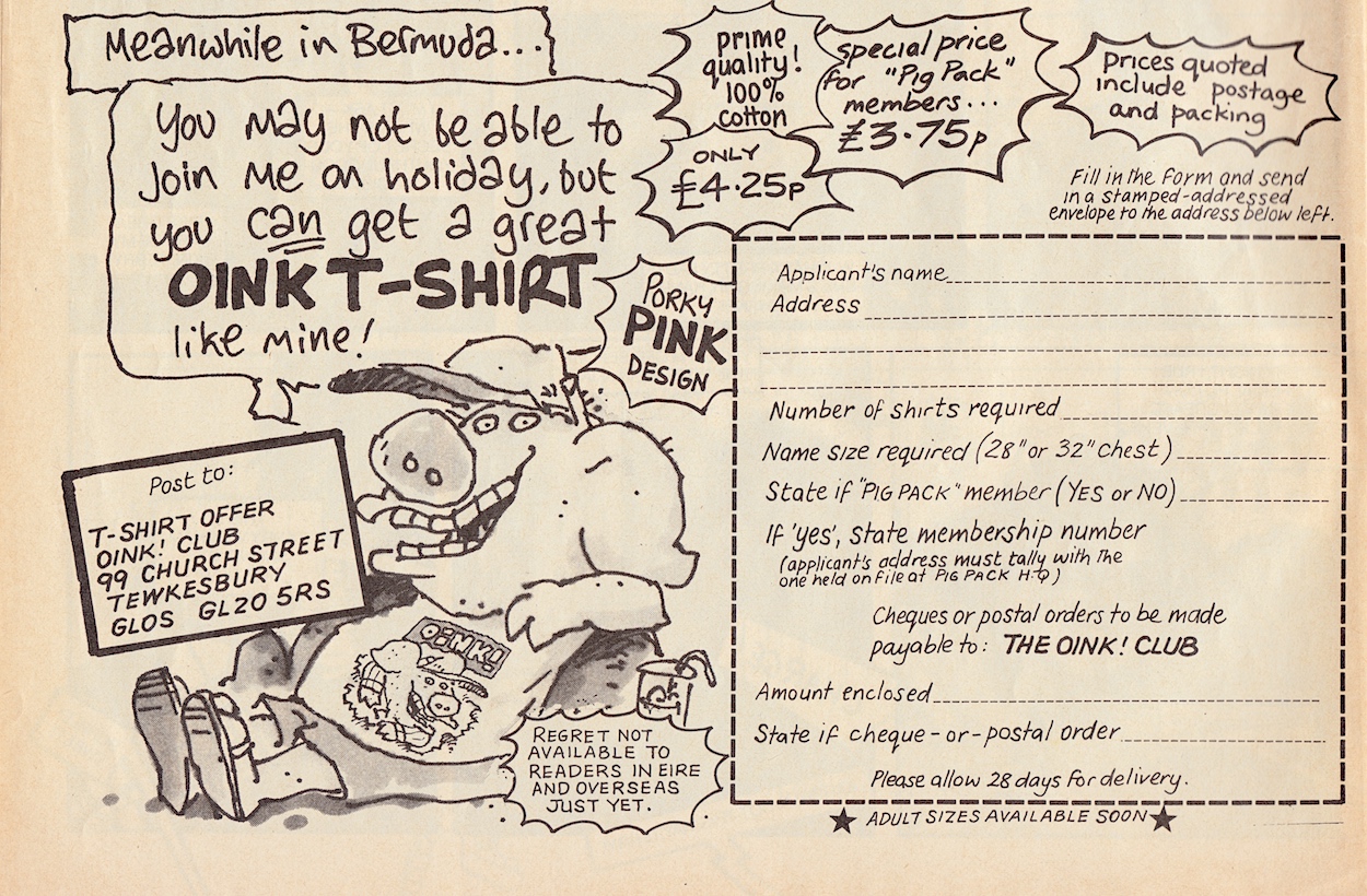 The second piece of apparel had the best tagline in a clothing advert ever in my opinion. “Get sweaty! Get shirty! Get this sweaty shirty!” is one of those OiNK lines that fans quote to each other today when reminiscing about their favourite comic (alongside, “And the dolphin’s name was Keith” and the OiNK Song chorus, among others). At over a tenner, in comparison to the rest of the items it was expensive for the 80s.