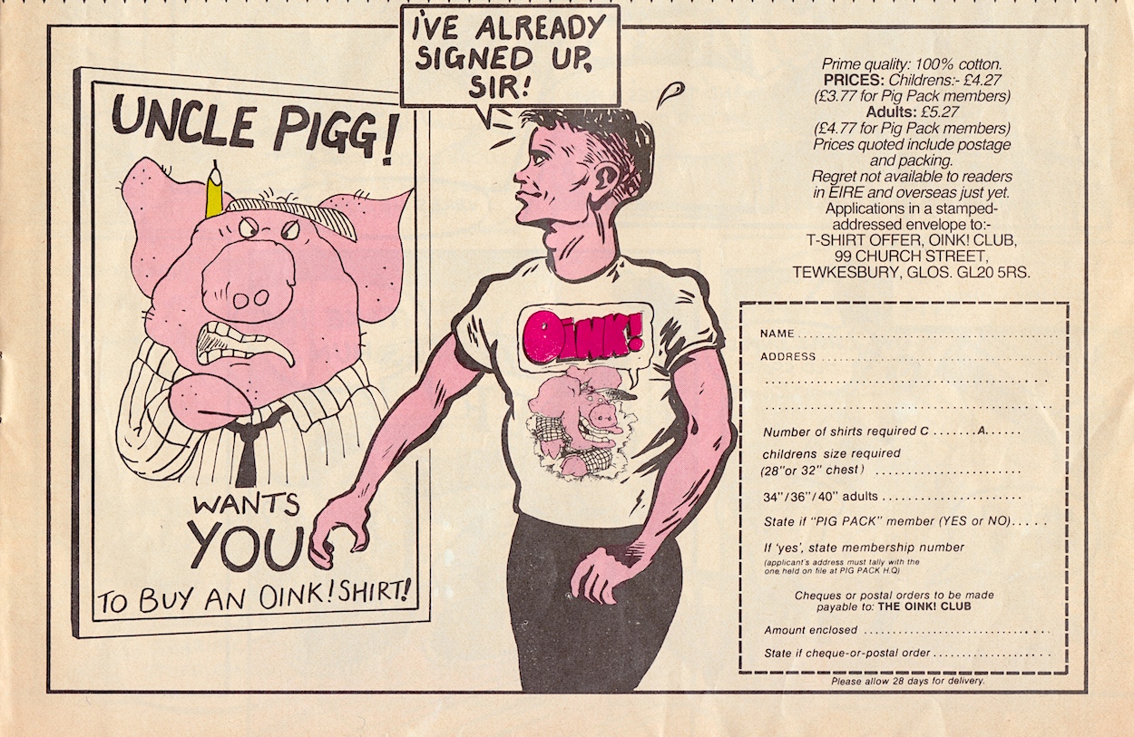 Two OiNK goodies I particularly coveted as a kid but never ordered for whatever reason were items of clothing. The t-shirt appeared very early in the run and would be available for purchase all the way to the end. Just like the club membership and the mug it also received a variety of adverts. Below is the original as it appeared in #8, as well as those from the War Special (#20) and the All-Electric Issue (#23). Bringing up the rear is the one from the final months of the comic and clearly Uncle Pigg wasn’t beyond using emotional bribery to make a buck.