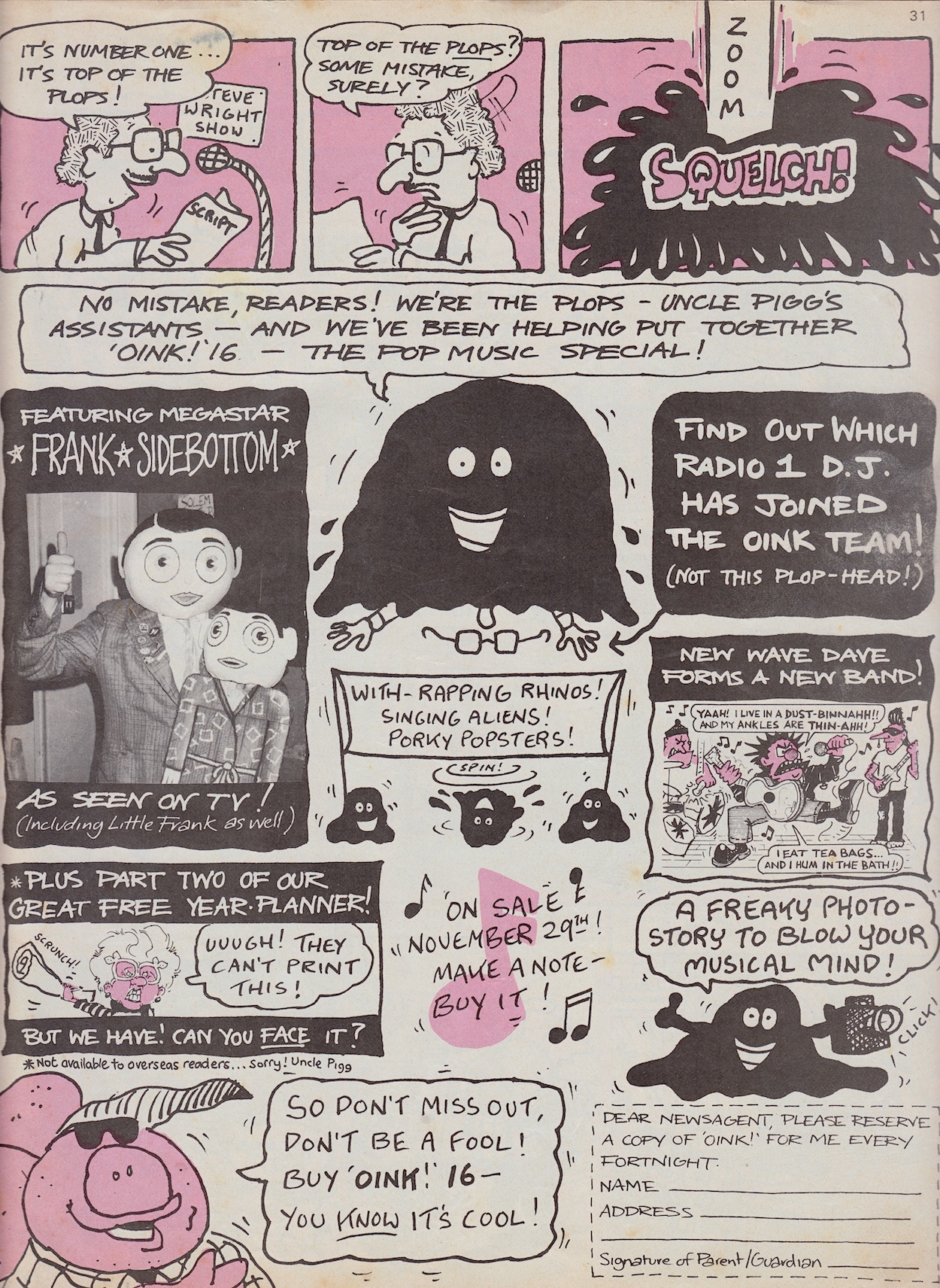 Frank Sidebottom, or rather Chris Sievey underneath, would become a regular fixture of OiNK all the way through to its final edition, his felt-tip coloured strips, showbiz news, buying guides and much more a highlight of every issue. Suitably enough his first appearance is in the music special, which features plenty of parodies and themed strips as this full-page promo shows. Don’t miss out, you can click follow or keep abreast of updates through social media (check out the menu above), the full review is in just three days.