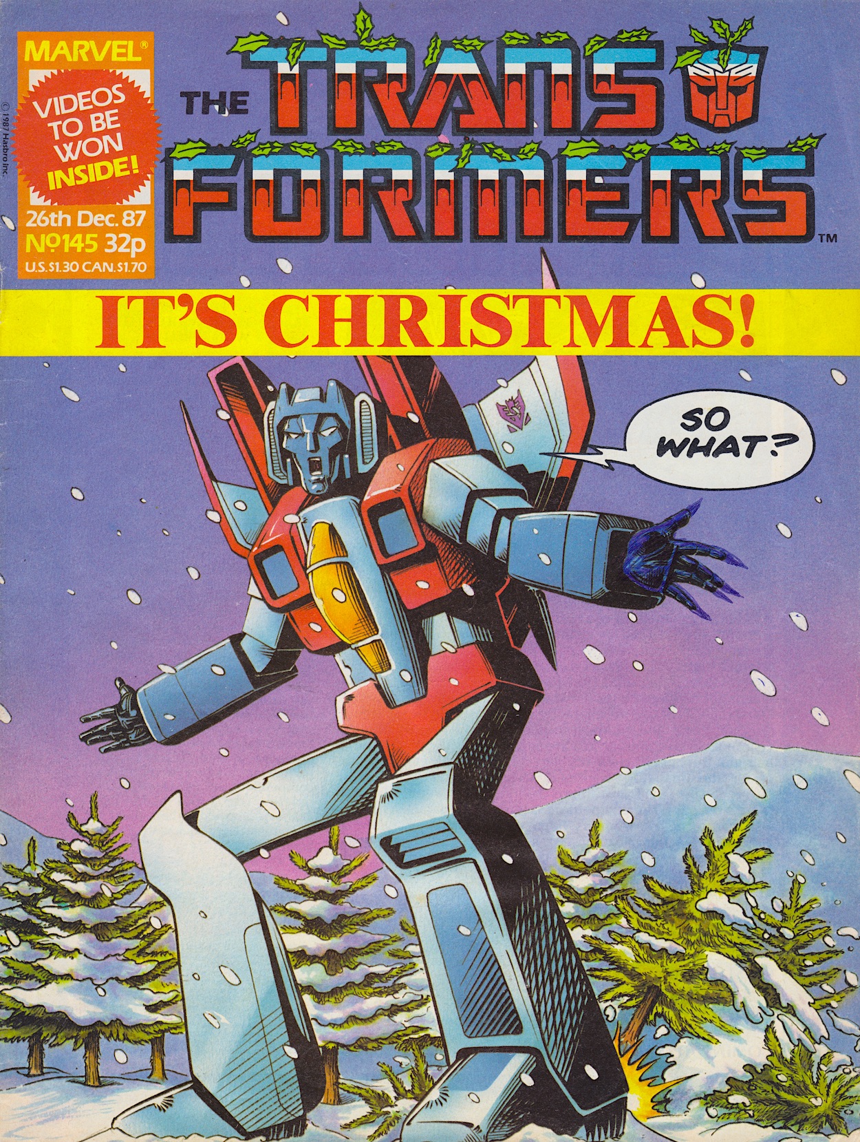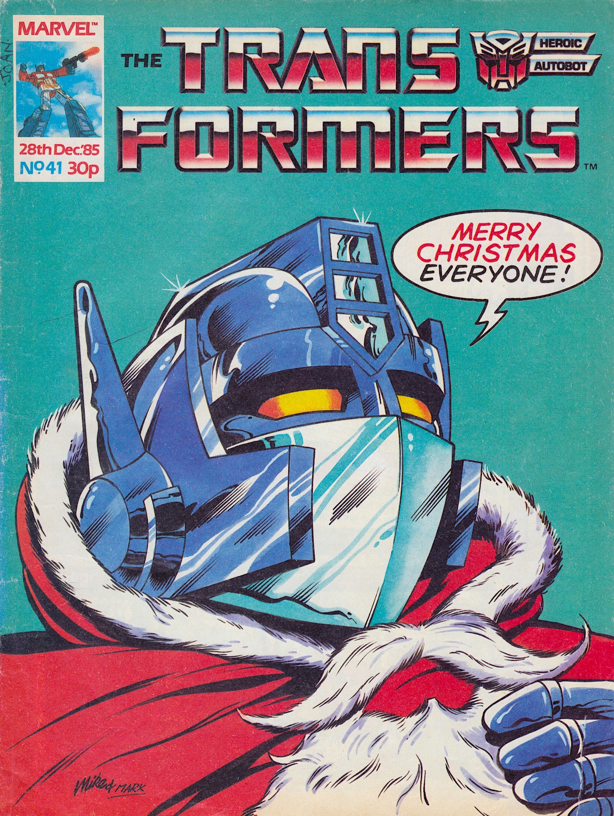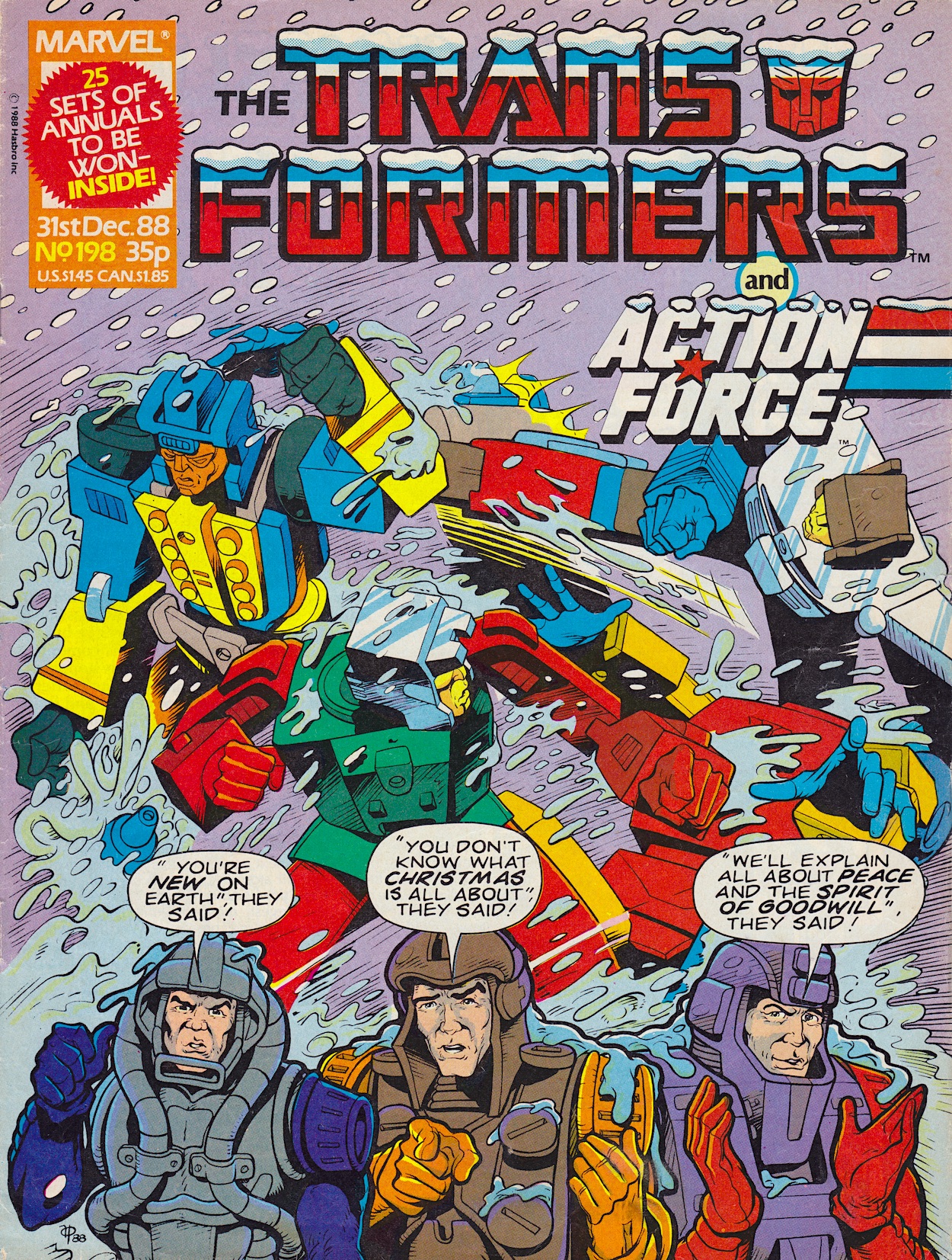 That earliest issue from the comic’s first year may only pay lip service to the festivities on the cover but as you can see from then on they celebrated with some of the most fun issues they ever produced. There’s snow or holly on a couple of the logos and even Optimus Prime dressed as Santa which, much like Wildcat, is actually explained in the story and isn’t just a cover image. Although they play up to that with the next year’s Christmas card image of Galvatron, who wasn’t inside.