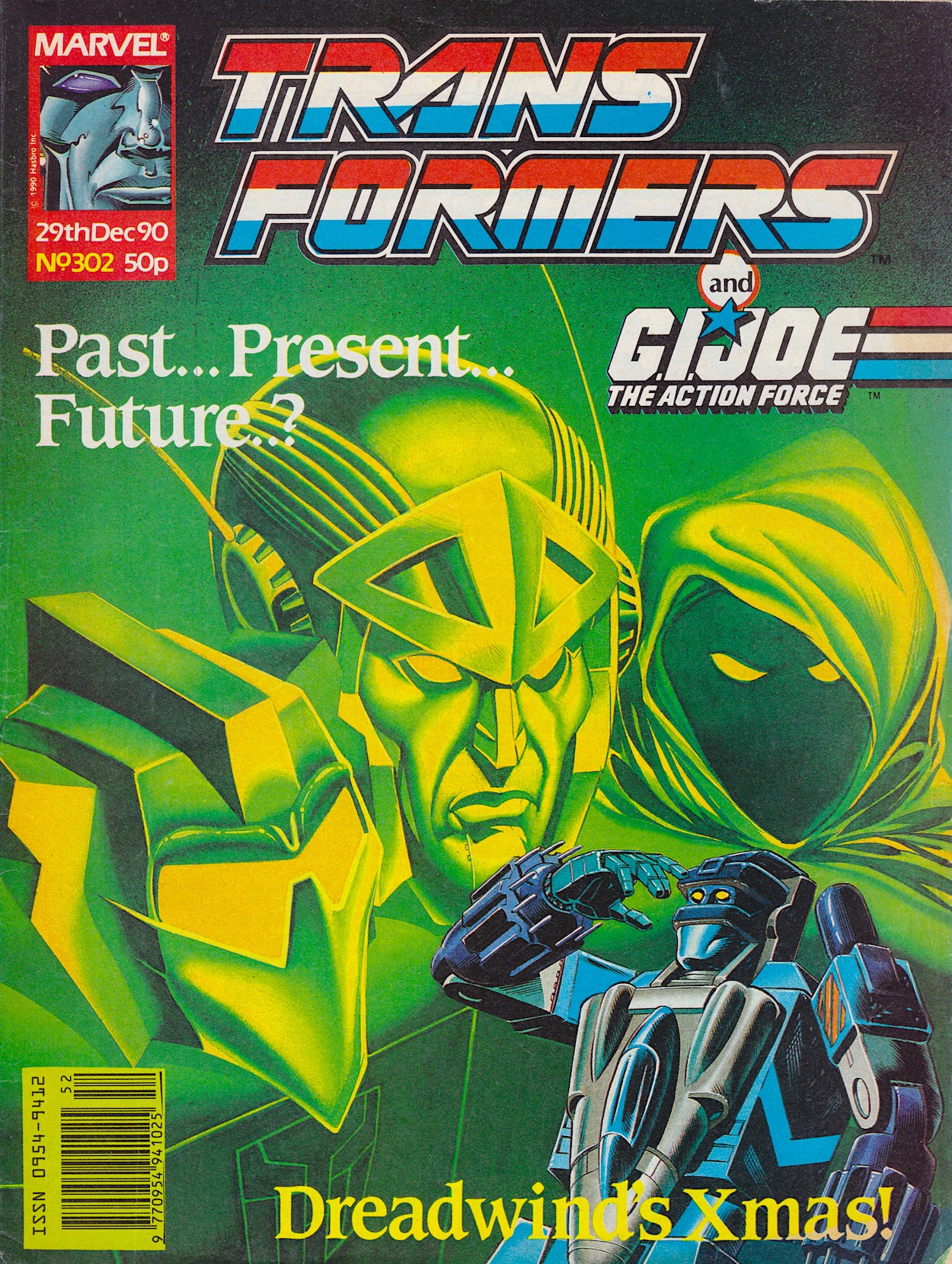 The issue with all the snow was actually one of my first issues back at the time. It was doubly exciting for me because it was a special issue for Christmas and had one of the toys I received that year on the cover (Slapdash, the one on the left). The celebratory 250th issue fell on just the right date and as the comic surpassed an incredible 300 editions former letter answerer Dreadwind hilariously had to answer to the ghosts of the past, present and future Transformers to hold that post.