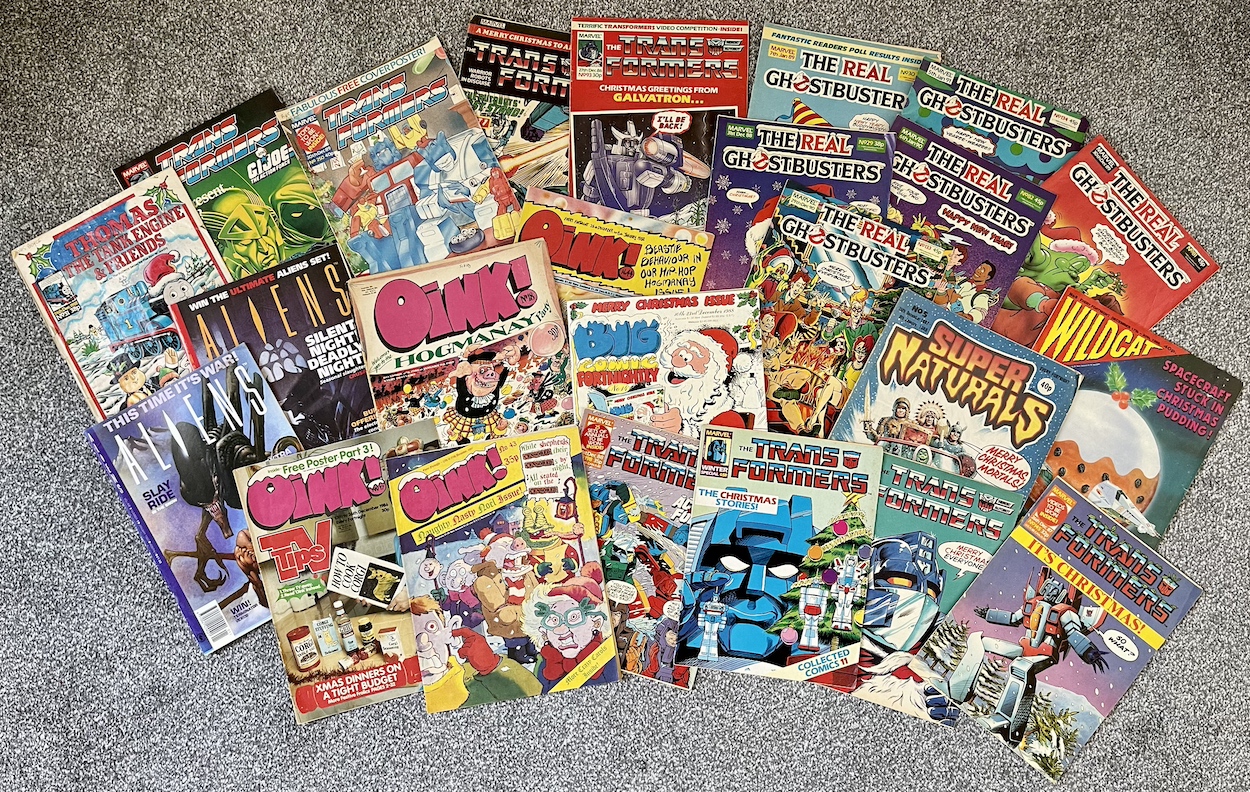 Next to it is the second Christmas edition of Marvel UK’s Thomas the Tank Engine & Friends, one of two issues I’ve kept all these years and for a very personal reason. Namely, it was the first time young me saw his name in print when my drawing of Thomas, Gordon and Percy with Santa hats was published inside. I can still remember that moment of excitement upon turning the page that year. If you want to see it, you can check out the Thomas retrospective (marking an incredible 800 issues), the link to it and all of the issues featured here can be found at the bottom of this post.