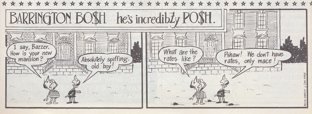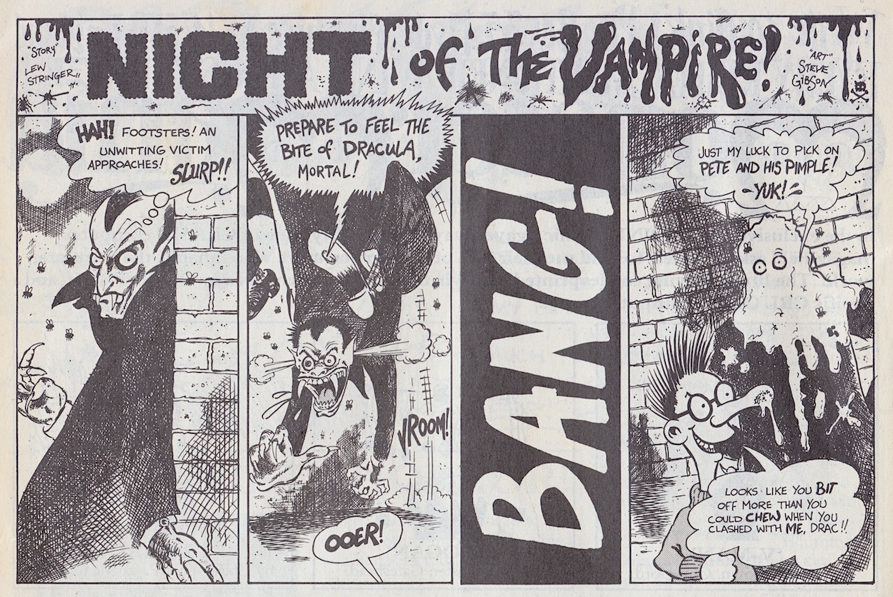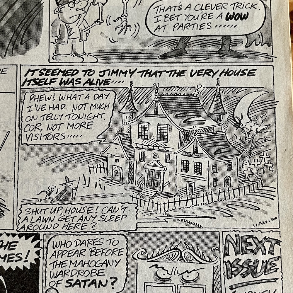 Granny’s stablemate from Cheeky Weekly and Whoopee! comics, Mustapha Mi££ion also has a handful of strips in this book. He made a further transition to Whizzer & Chips too when Whoopee! folded, such was his popularity. Having discovered oil, making him and his father extremely wealthy, his dad sent him to the UK for his education and supplied him with a mansion, land and staff to keep him occupied. Originally drawn by the legendary Reg Partlett, the early stories had him desperately trying to fit in and often misinterpreting the needs of others, going far beyond what was actually needed because he had the wealth to do so.