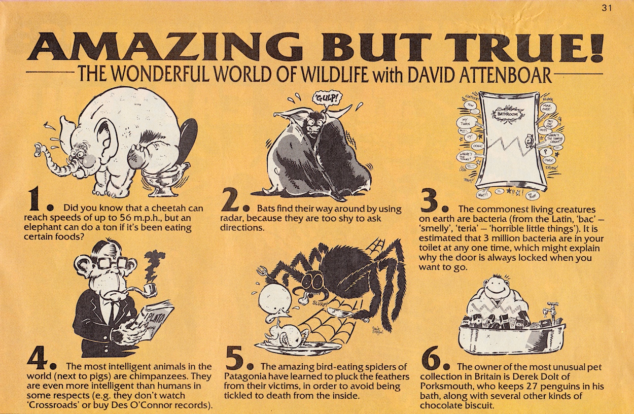 The ‘Hilarious Happy Families Issue’ lives up to its name from the very first page with that brilliant cover complete with a couple of strategically placed OiNKs, portraying an elderly relative dying from the shock of reading an issue. The Christmas Club, the note on the bottom of the casket and a couple of plops for good measure, I can remember visiting my mum’s friend’s house with this issue and sitting absorbed by it while they gossiped.