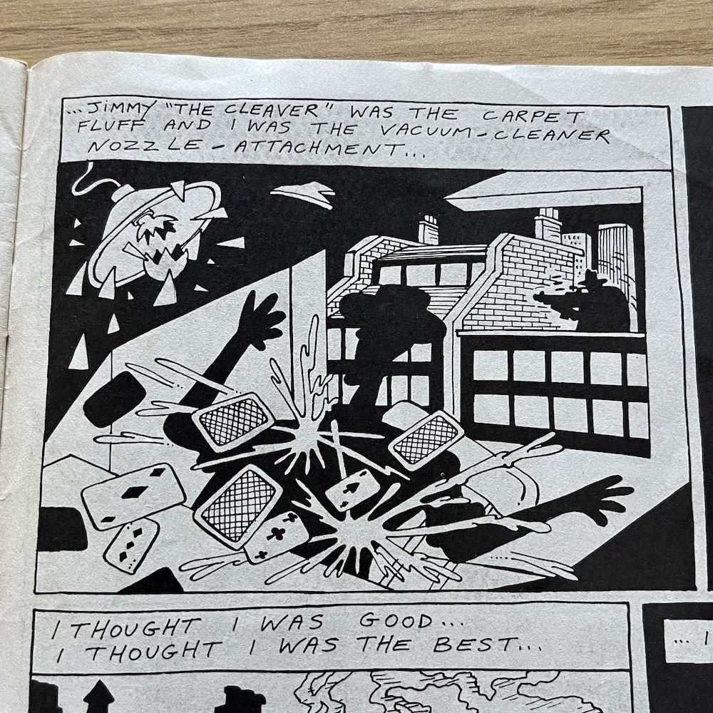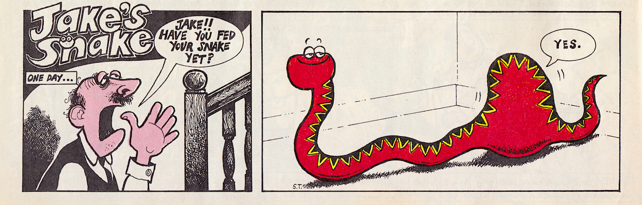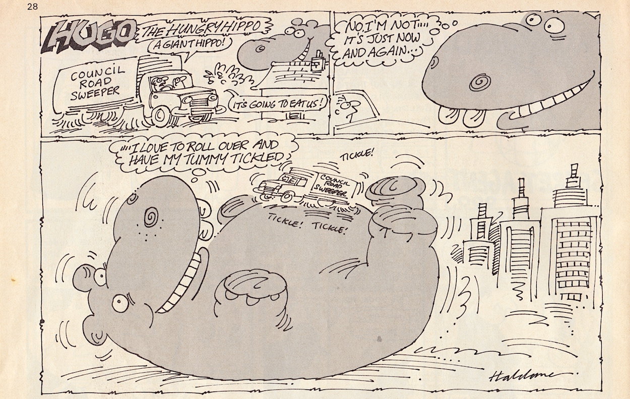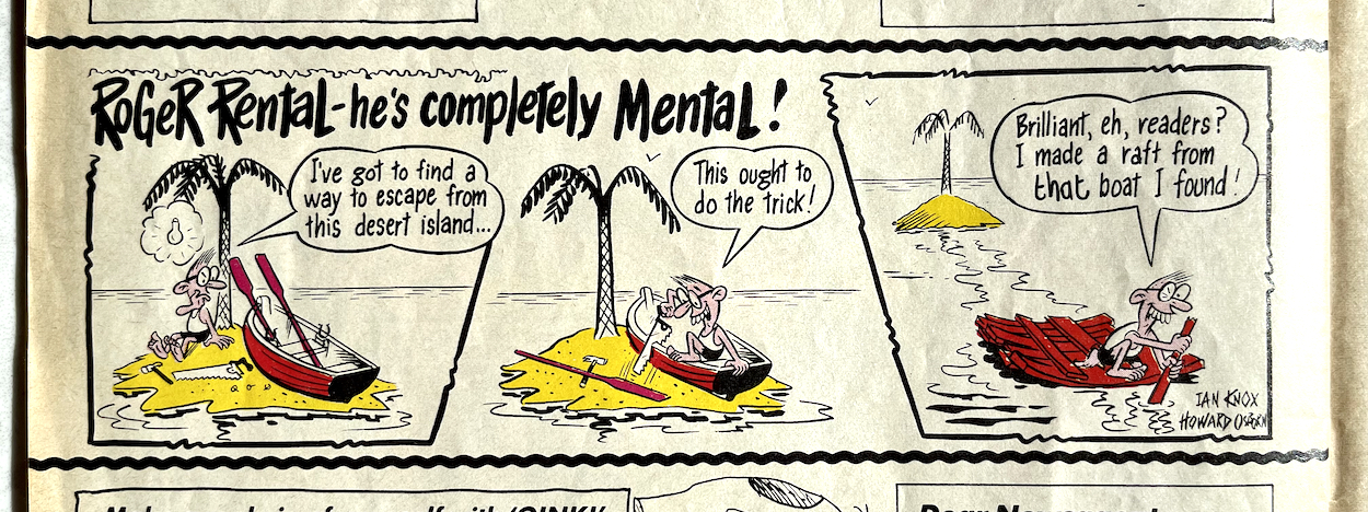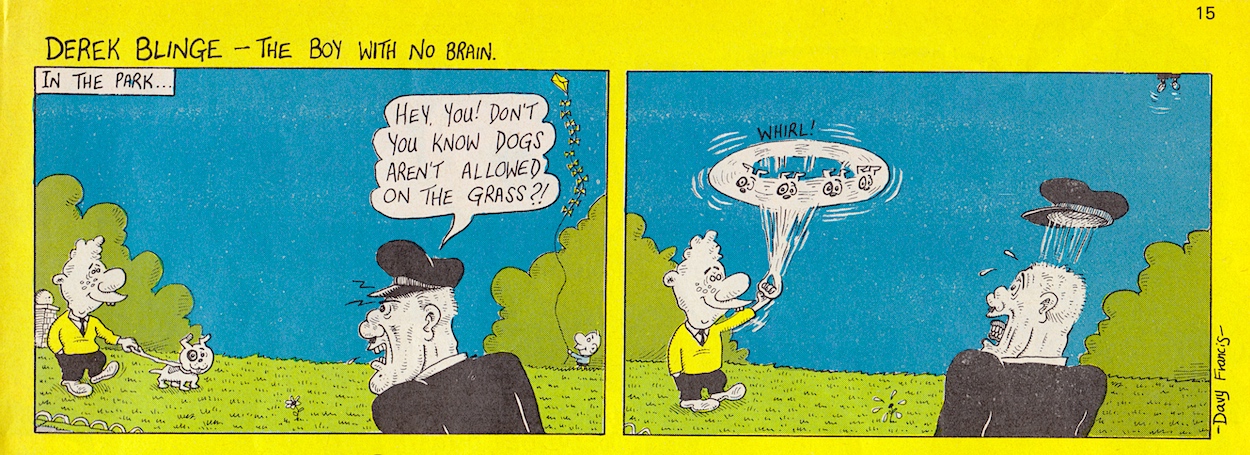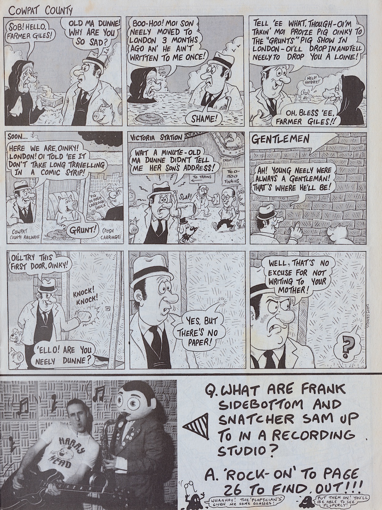 Davy is a real comedic genius and it ran in the family. His father Stanley Francis was a comedian, performing in the old club circuits in Northern Ireland with Frank “it’s a cracker” Carson. Stanley also played piano and once accompanied Little Richard at Belfast’s Boom Boom Rooms! He’d often tell jokes at home to try them out (which Davy now uses on his bus tours) and the joke at the centre of this Cowpat County was one of Stanley’s. Also, check out that middle panel and you’ll see Davy’s caricatures of fellow OiNK cartoonists Ed McHenry and Lew Stringer! (Thanks for pointing them out, Davy!)
