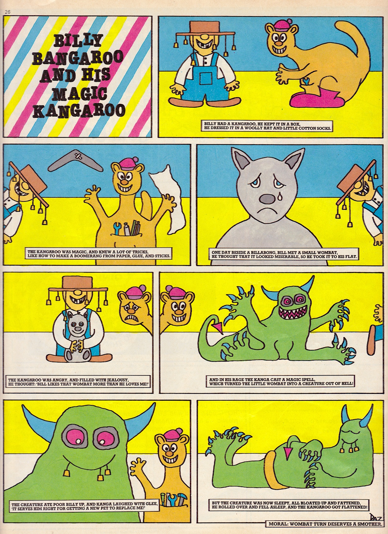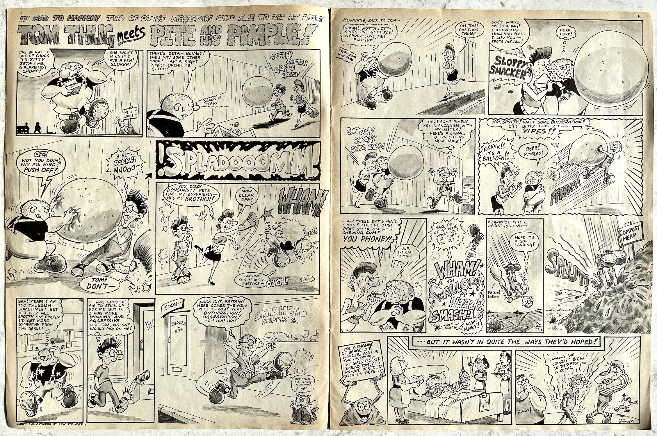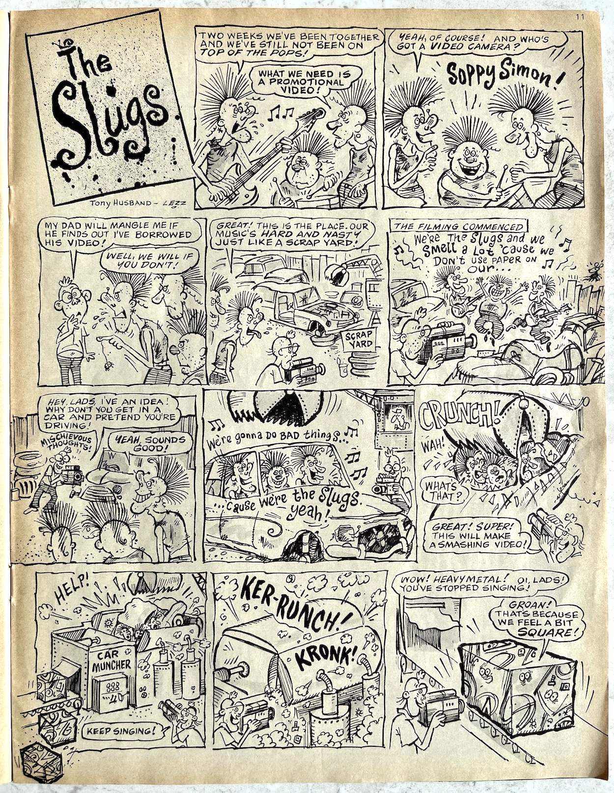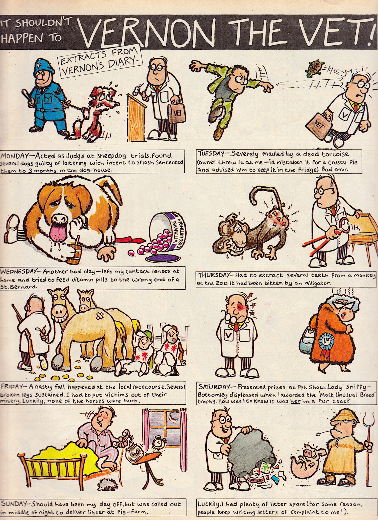 Davy is a real comedic genius and it ran in the family. His father Stanley Francis was a comedian, performing in the old club circuits in Northern Ireland with Frank “it’s a cracker” Carson. Stanley also played piano and once accompanied Little Richard at Belfast’s Boom Boom Rooms! He’d often tell jokes at home to try them out (which Davy now uses on his bus tours) and the joke at the centre of this Cowpat County was one of Stanley’s. Also, check out that middle panel and you’ll see Davy’s caricatures of fellow OiNK cartoonists Ed McHenry and Lew Stringer! (Thanks for pointing them out, Davy!)