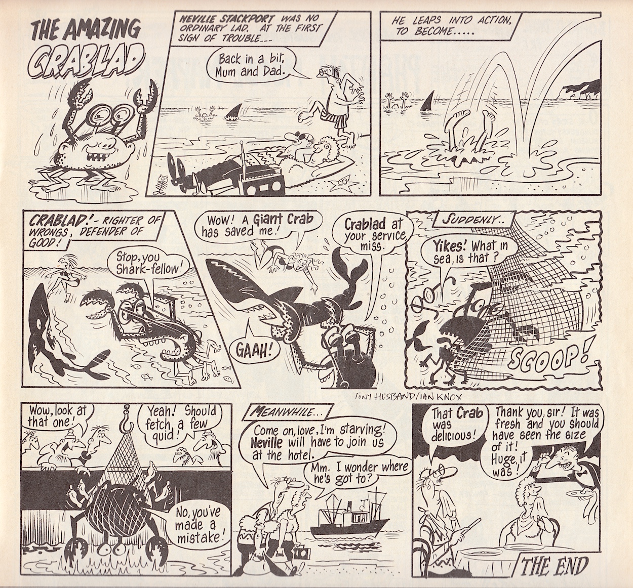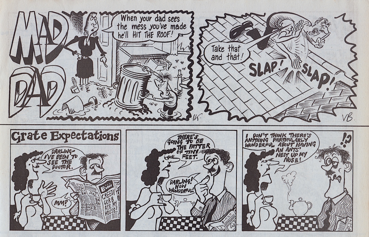 There’s a certain phrase I remember my dad using whenever my siblings or I did anything that our mum would’ve found particularly bad and one of the little quarter-page strips in this issue takes that exact phrase and ridicules it, albeit swapping the parents’ roles over in the process. From that moment on I could never take it seriously when it was used. I still can’t. Mad Dad is written by Vaughan Brunt and drawn by Ian Knox. This is followed up by Grate Expectations, a memorable little one-off from the insane mind of Simon Thorp who, I’m very happy to say, was turning up more regularly by this point.