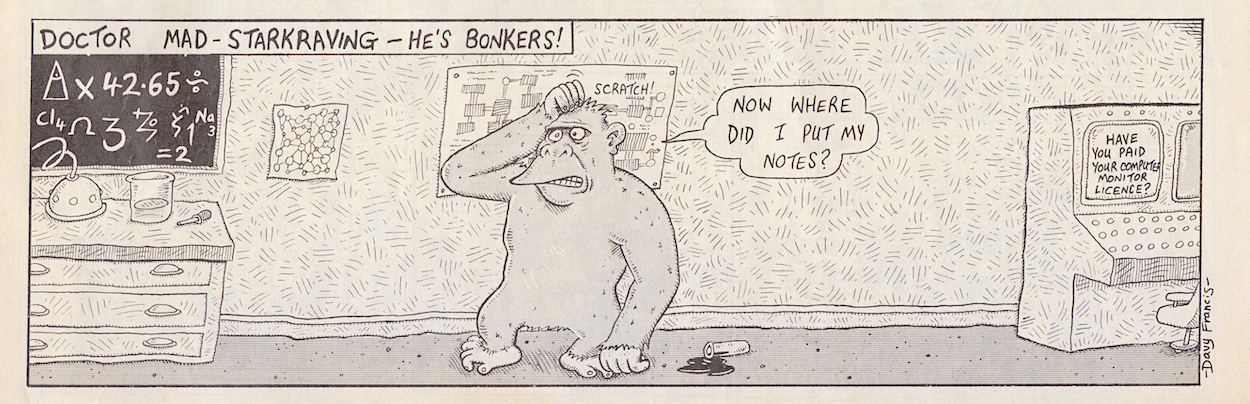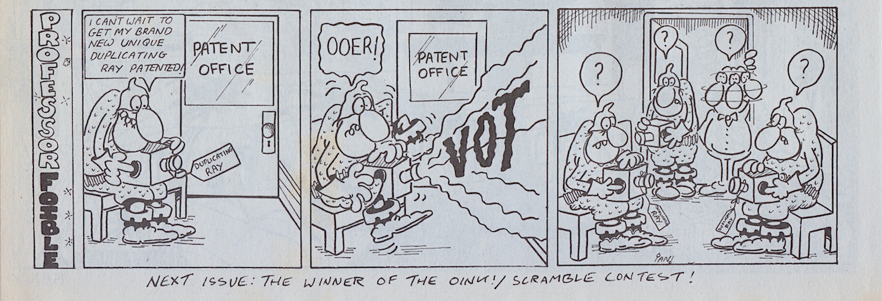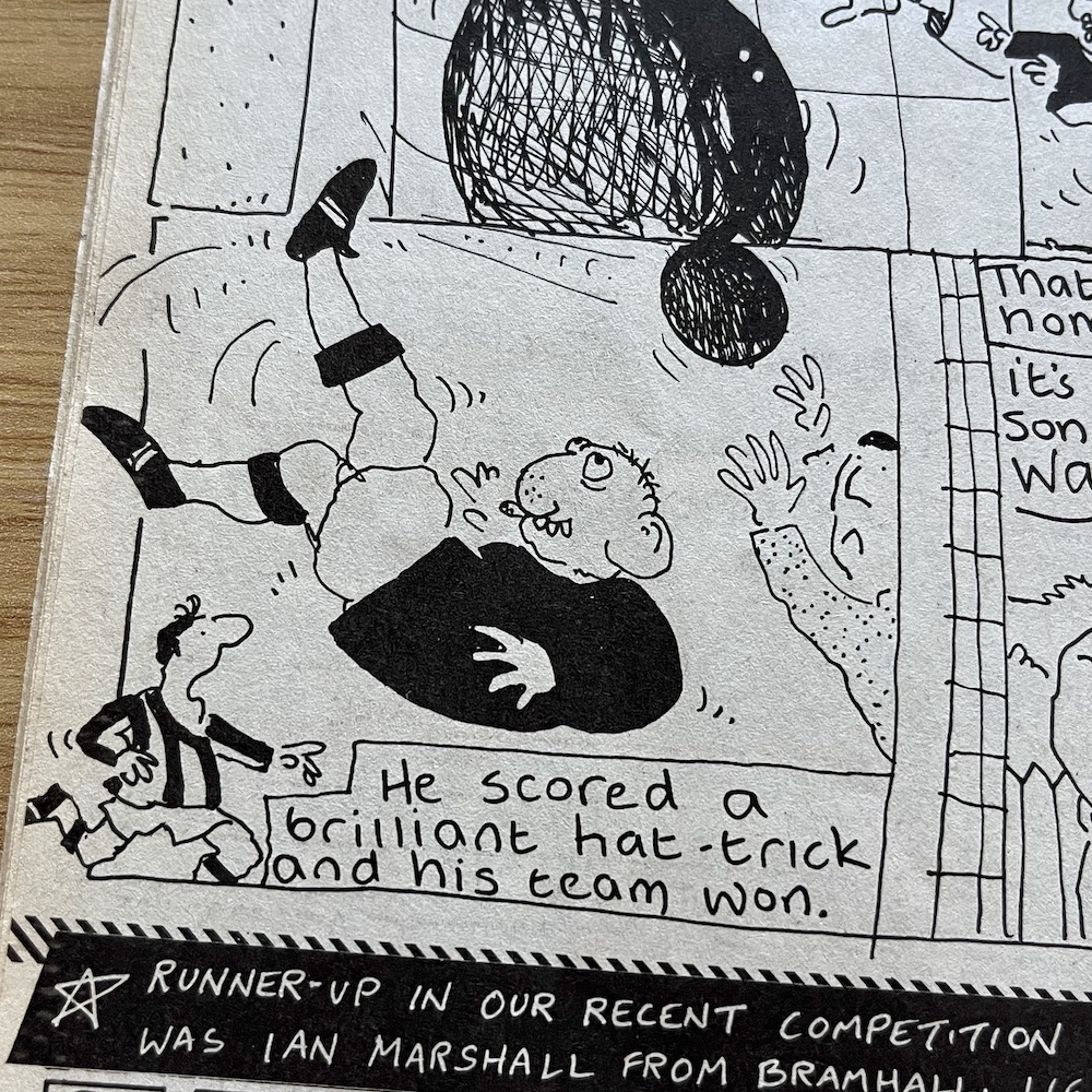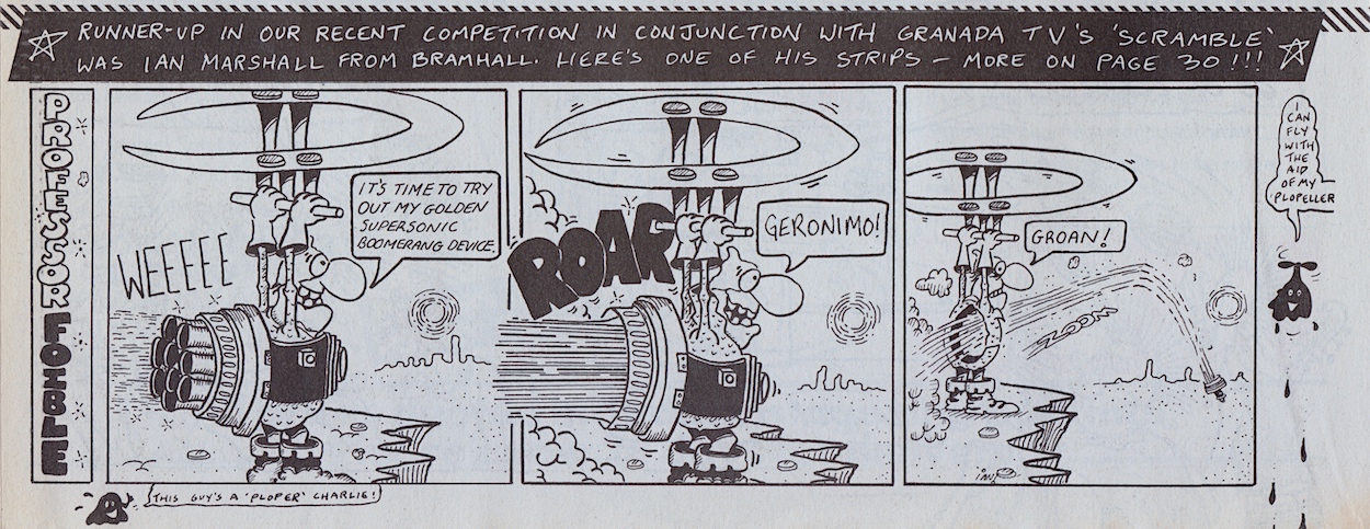 So, Frank has just set a new competition and this issue announces the runner-up of one we hadn’t seen in the comic. In much the same way that OiNK ran a competition in conjunction with Radio Manchester (the results were in #26), they teamed up with Granada TV’s Scramble programme. Ian Marshall from Bramhall has not one, but two small strips in this issue starring his own creation, Professor Foible.