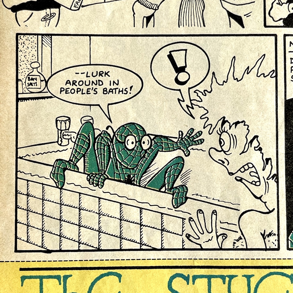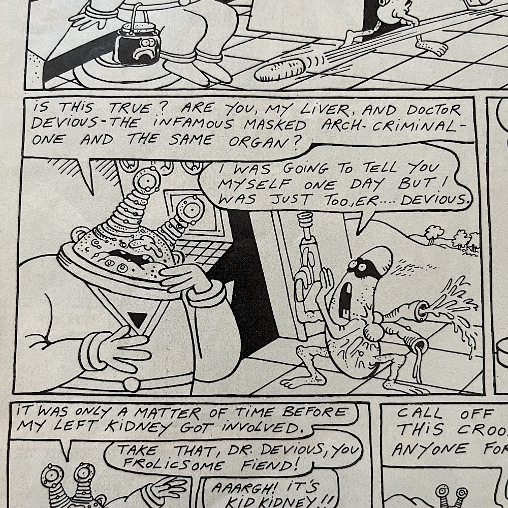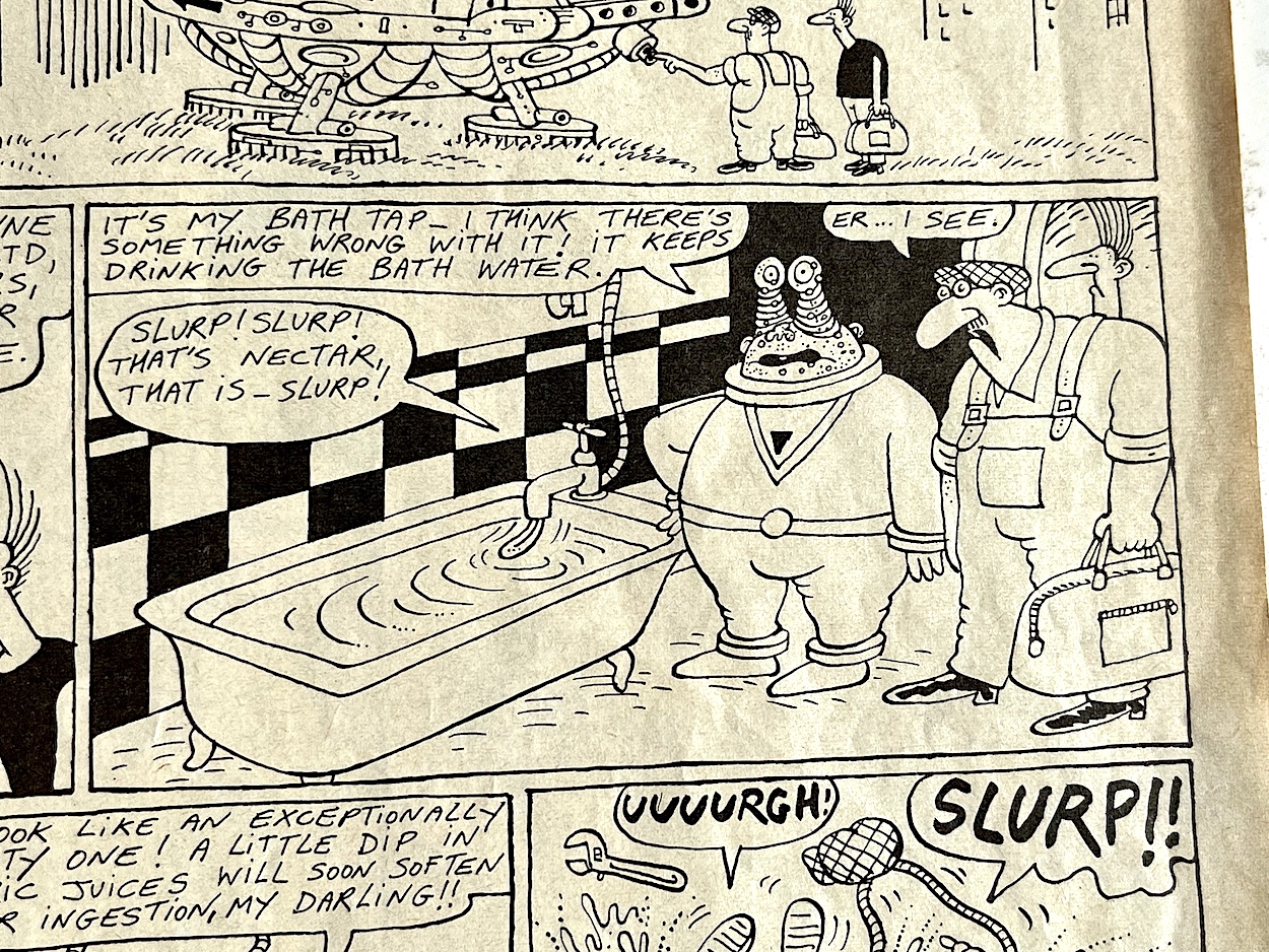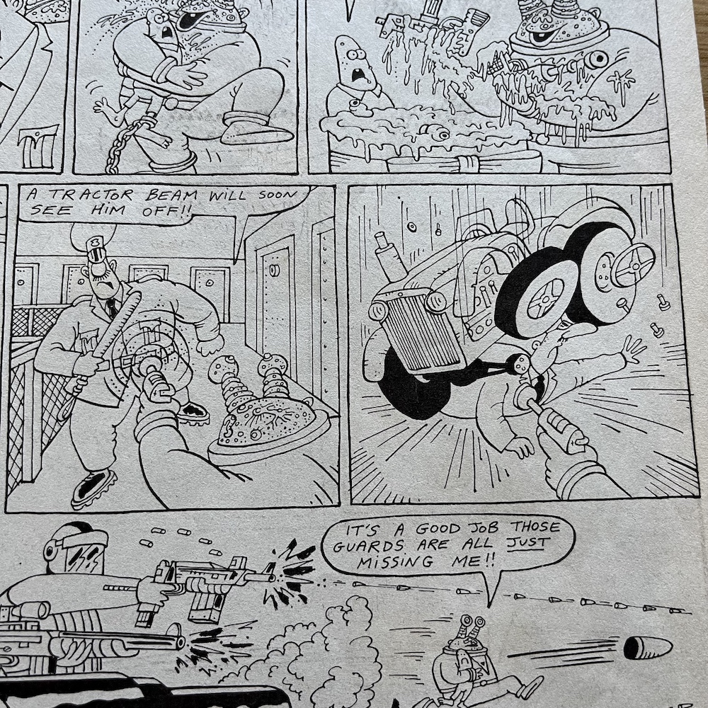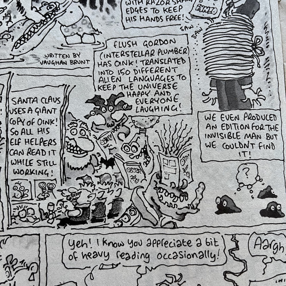 There were so many highlights in this issue I really struggled deciding which ones to include. This could be a regular problem over these next few months, but it’s a nice problem to have, isn’t it? The Grunts page features press clippings about OiNK itself, although I’ll save them for their own post at a future date. Just mentioned recently on the blog’s socials by a fellow pig pal was Burp’s tractor beam and it pops up here, so I just had to include that in this little selection of panels.