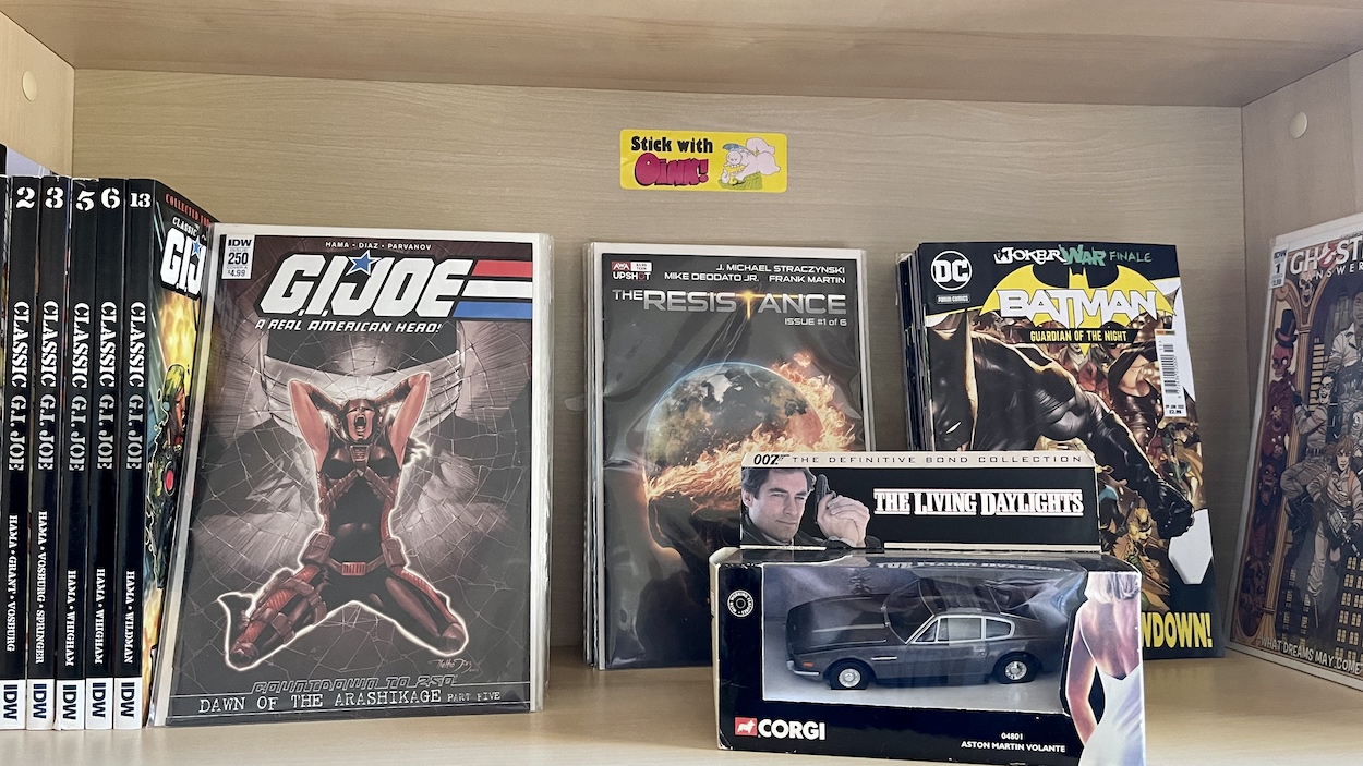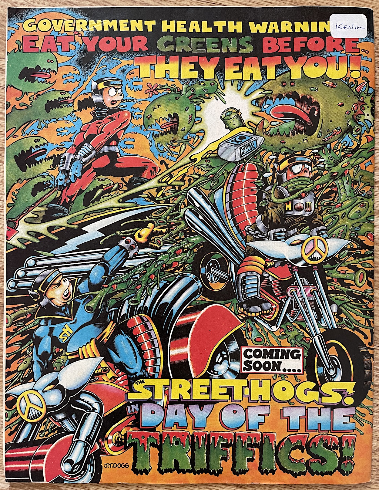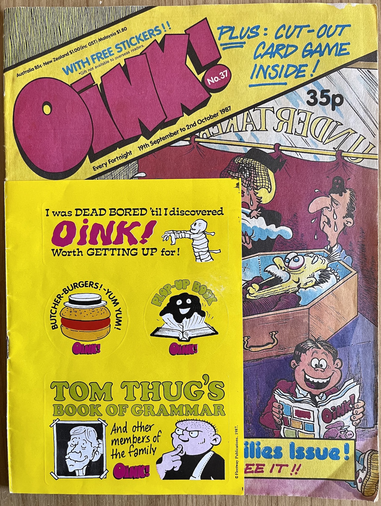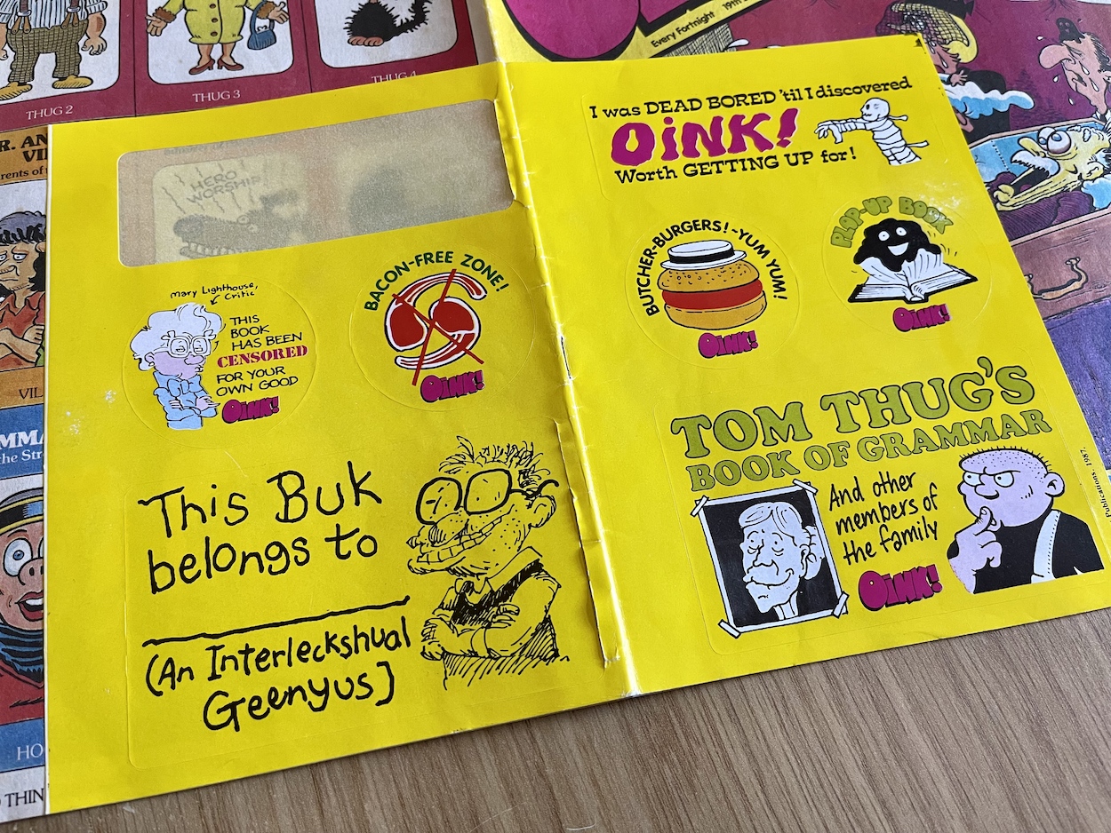 Another set of free stickers are wrapped around the cover, that Tom Thug ‘Book of Grammar’ one being my particular favourite. I think I used the Hadrian Vile sticker on a school book of some description back in 1987 (I would’ve been in primary six at the time of this issue) and the missing one on the back was the same as the one in that position last issue, which ended up on my fridge. This issue’s has been added to the comics shelves in my new home office.