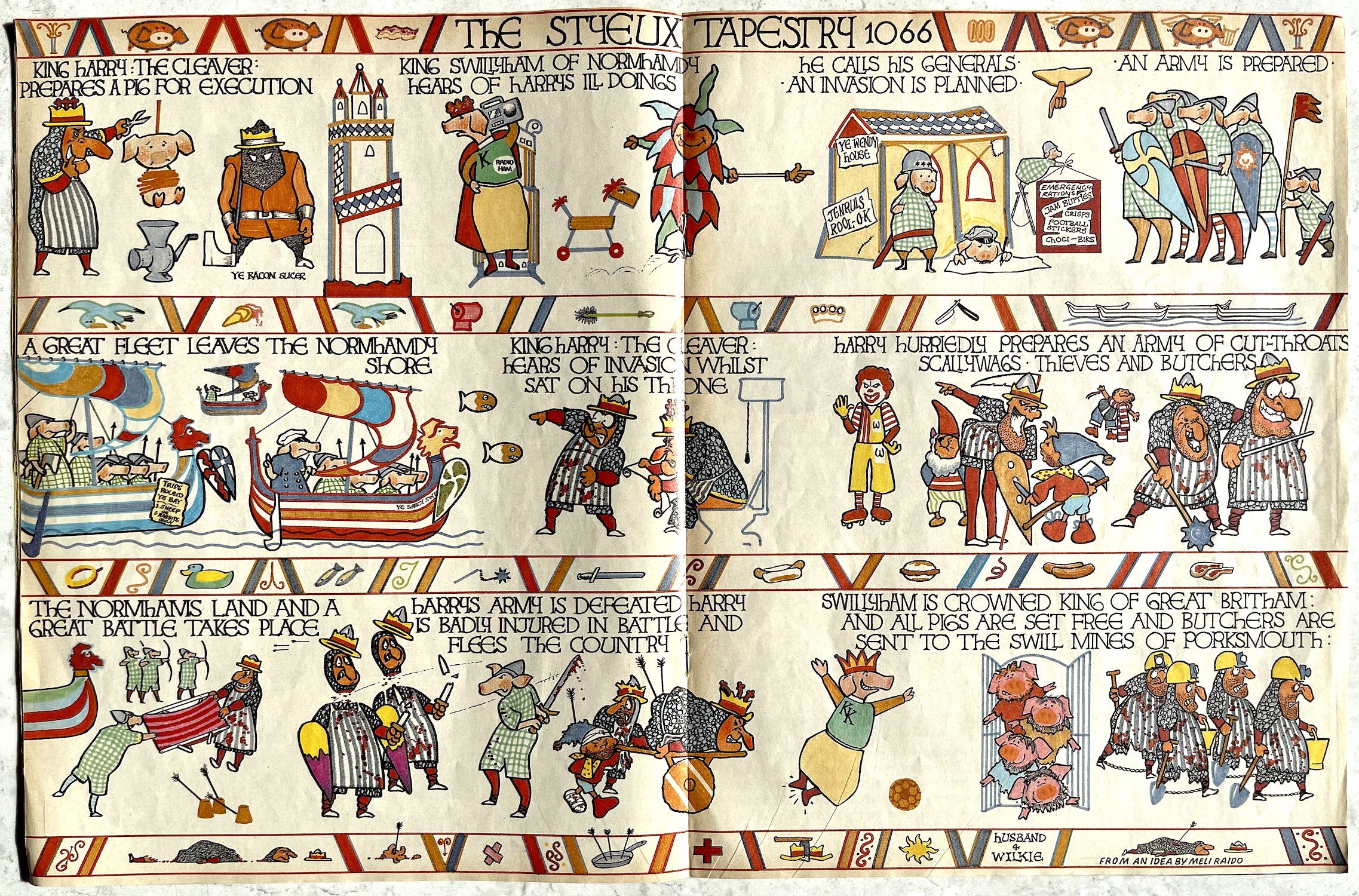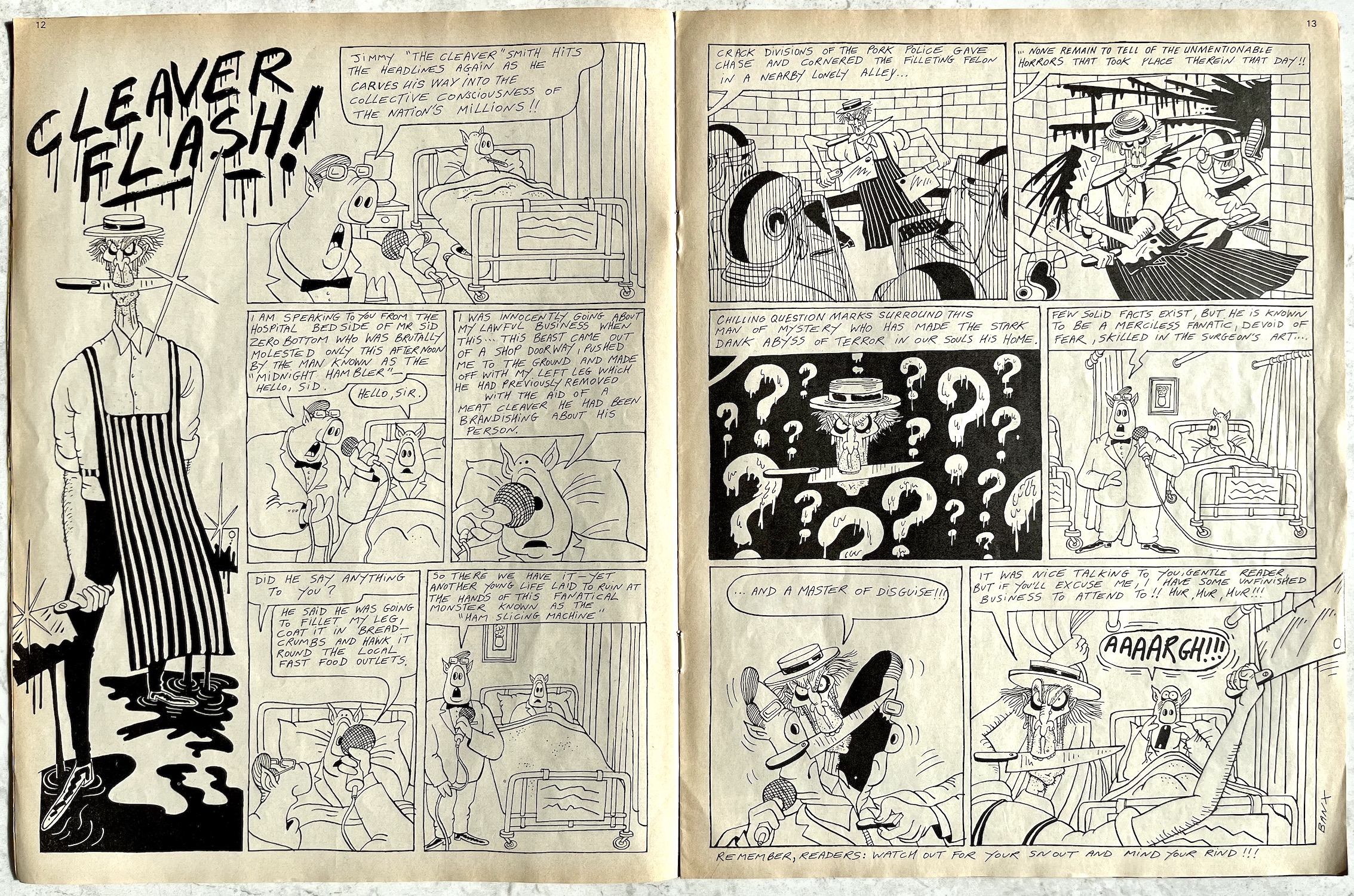 Of course, Jimmy has to live to see another day and terrorise the world in which the characters of OiNK reside. As it turns out that shadowy figure wasn’t Jimmy at all but rather a selection of pork sausages tied up and dressed to resemble him. We see this reveal just before Jimmy strangles Stig to death with another string of sausages. This might sound a bit brutal for a kid’s humour comic but it was so ludicrous and over-the-top we’d just laugh at the absurdity of the pretend horror.