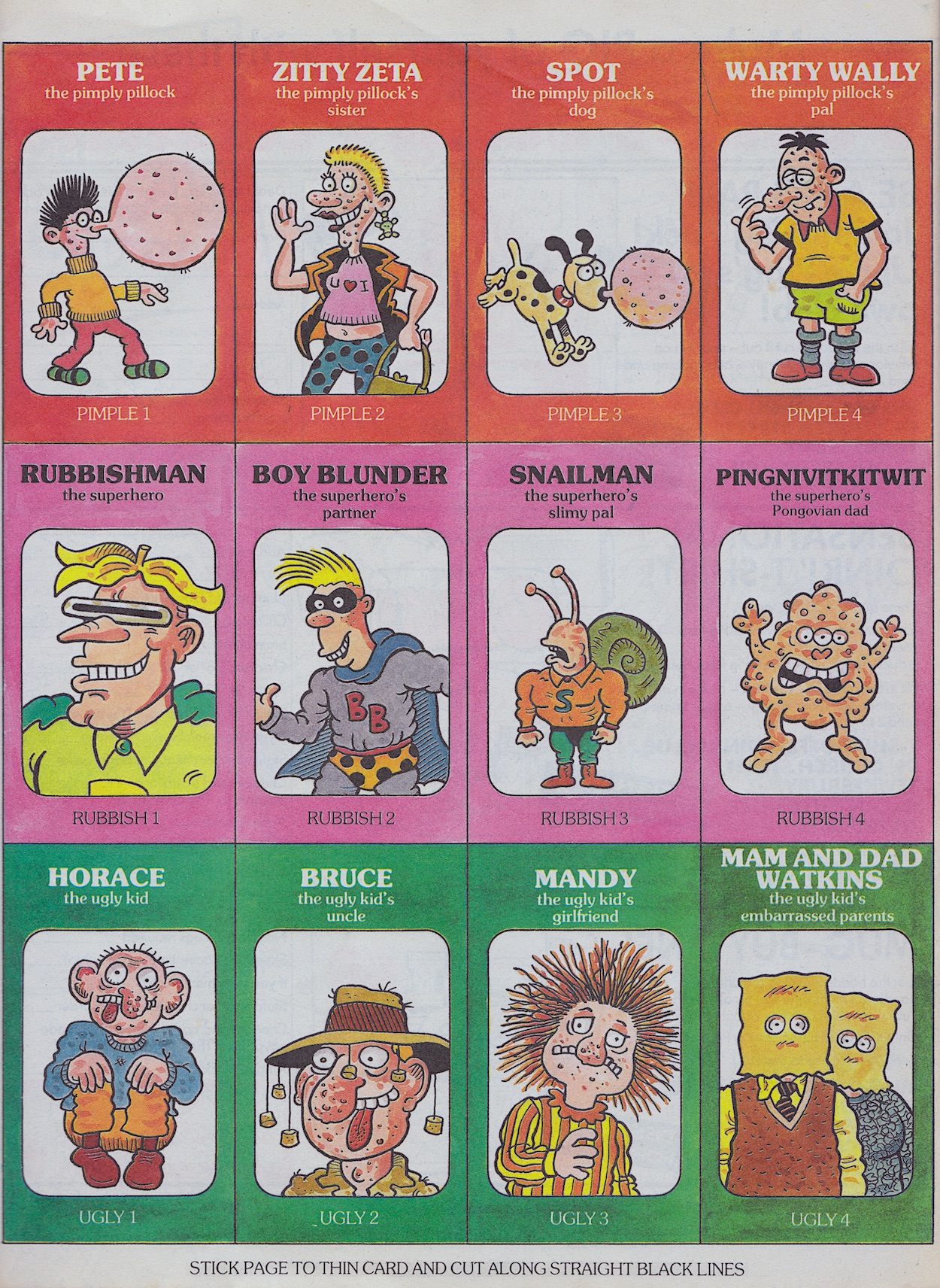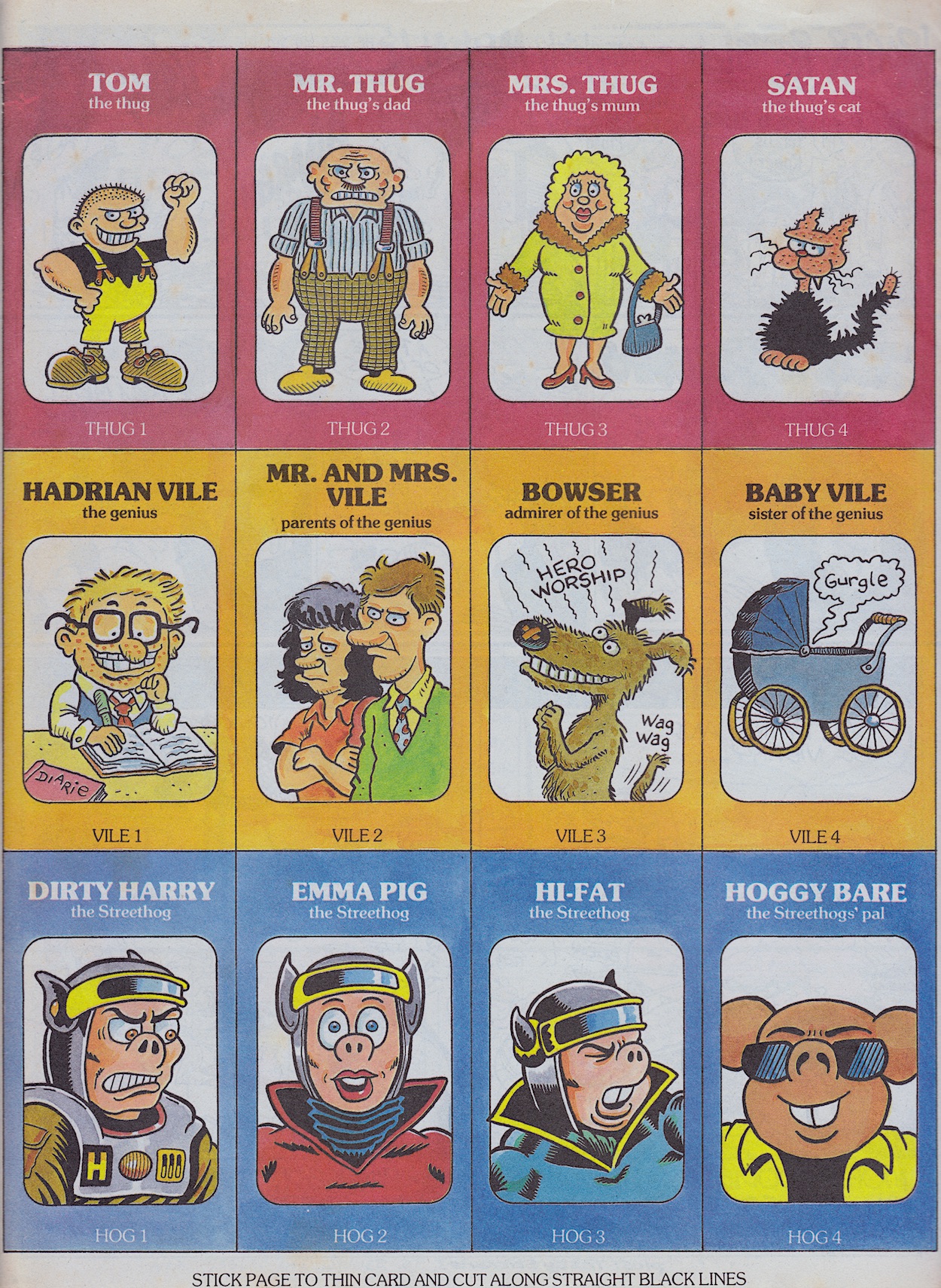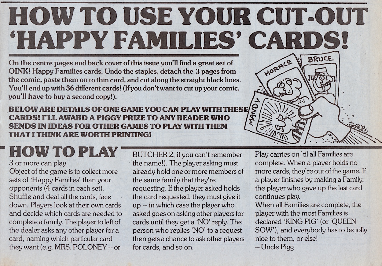 So as per the typical rules each family is made up of four individuals, with Hadrian’s not including Bowser as would’ve been expected up to this point, instead his baby sister gets a little cameo of sorts. Altogether there are 36 cards for the reader to stick on to cardboard and cut out, split into nine families. Parents and siblings could also easily take part because each group has a simple numbering system so non-OiNK fans (yes, they exist!) wouldn’t get lost amongst the silly names.