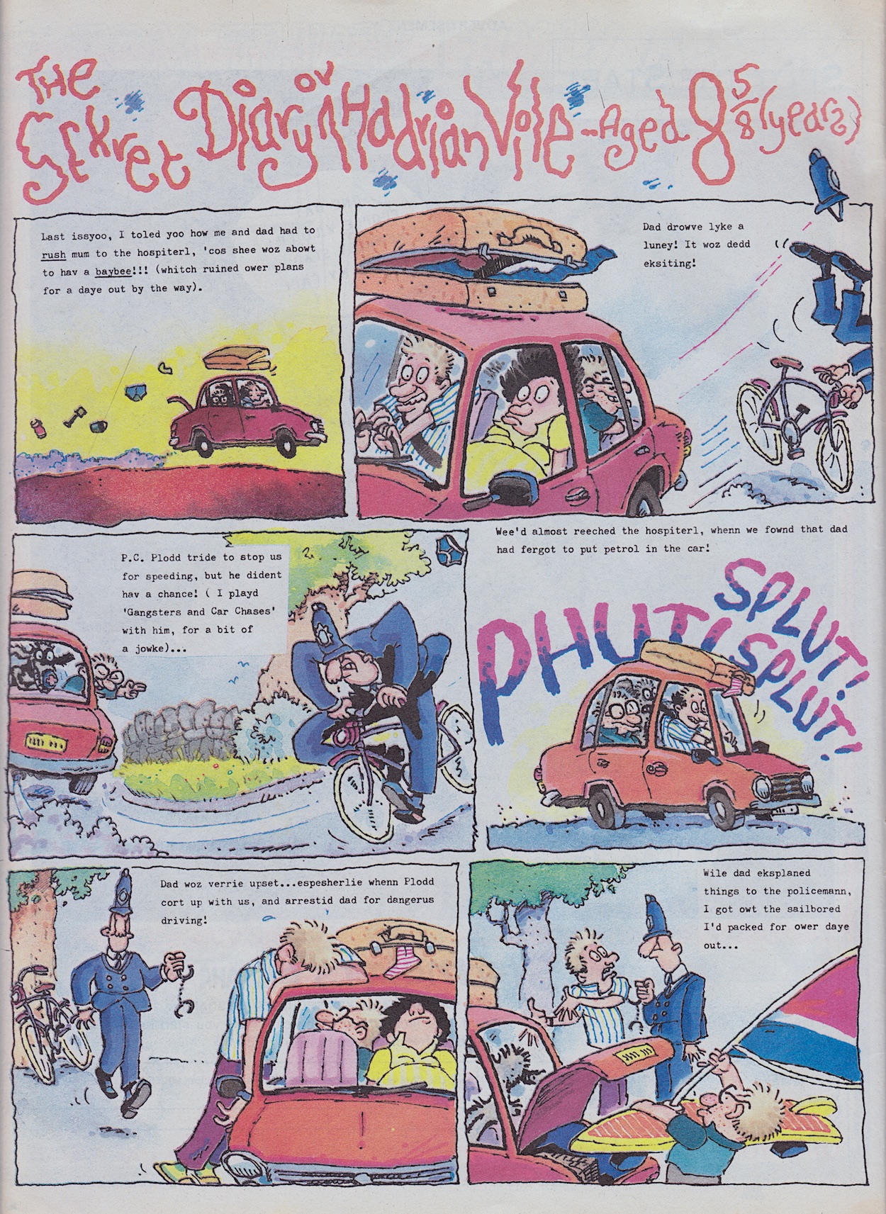 Next up is what I’d easily describe as the main event of this family themed issue. In fact it’s probably the main event in the whole life of Hadrian Vile thus far, something I’ve alluded to ever since the character first appeared on the blog back in #4’s review. To mark the occasion he gets three pages written by Mark Rodgers in glorious Ian Jackson full colour. This story more than any other plays to Ian’s strength of perfectly capturing a character’s thoughts in their face and body language. For example, his exasperated dad when they’re pulled over and in the next panel when he’s trying to explain things to the police officer.