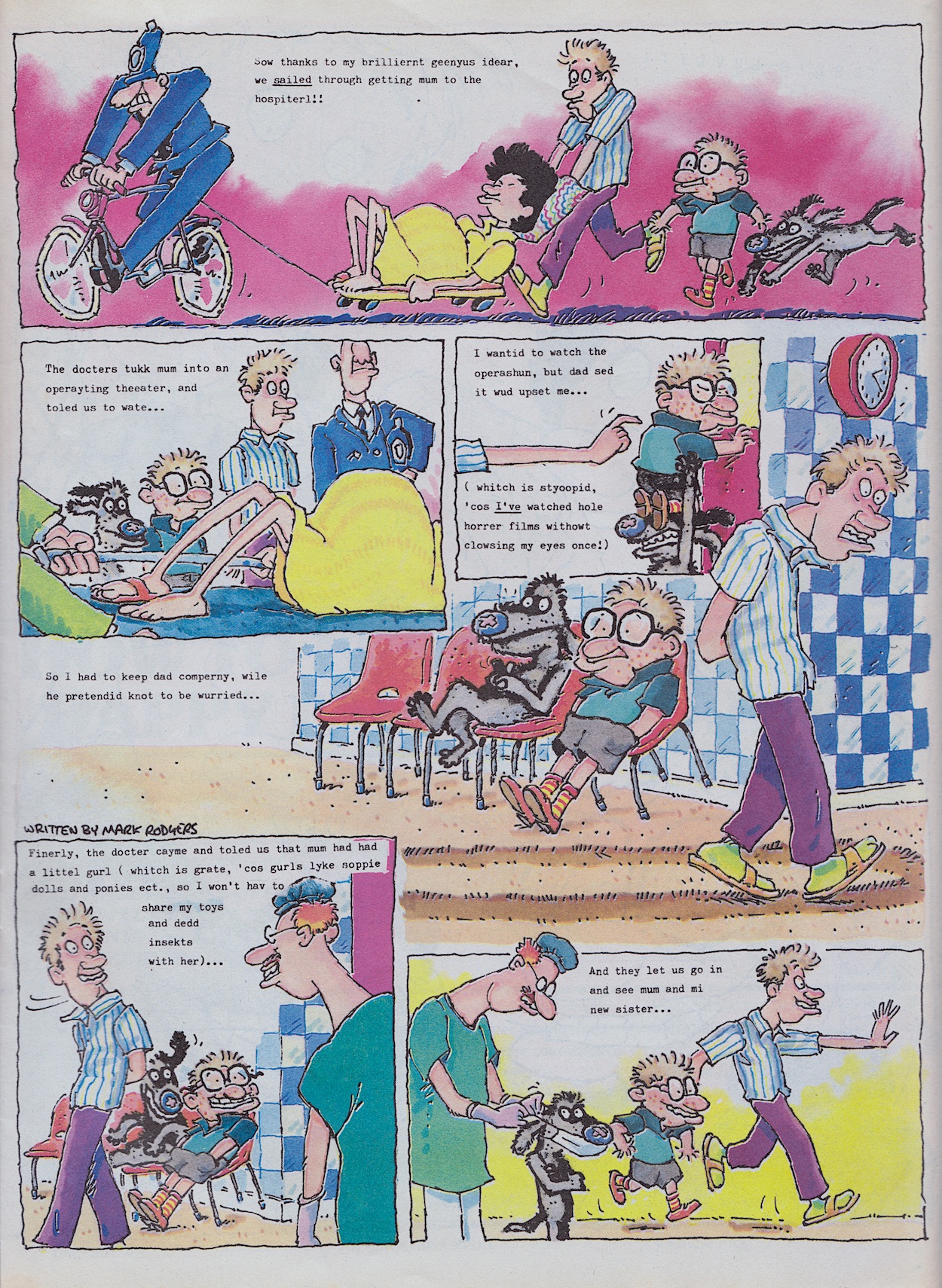 After wearing down the carpet in the waiting room the family are called in to see their newest addition and even Bowser gets a mask so he can join them. We turn over to see the following full-page image with a simple, sweet (yet still incorrectly spelt) diary entry. This was certainly a memorable moment in humour comics. When did a character live their life in an almost real time manner like this? When was something like this properly built up to instead of just being a sudden change? OiNK was always unique and this is all the proof you need.