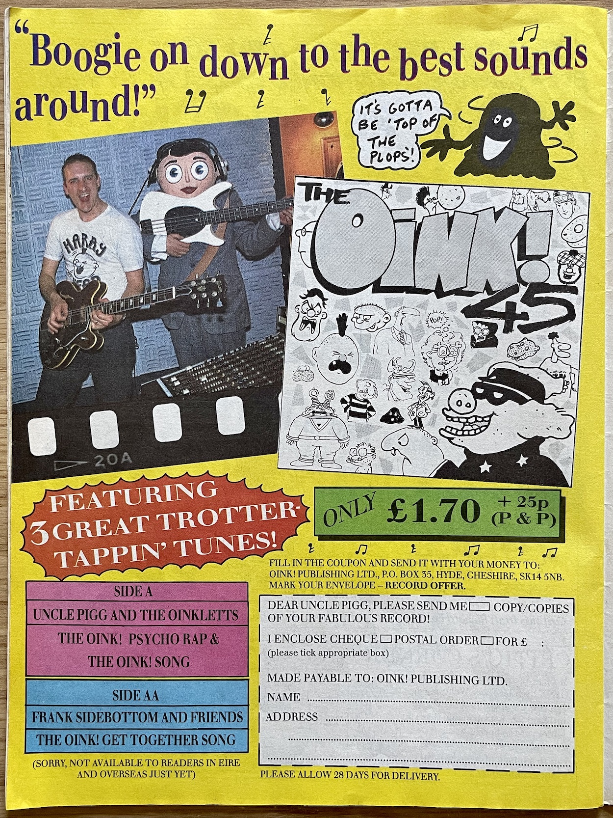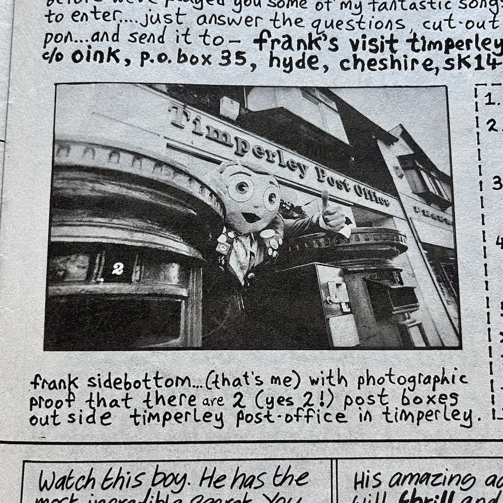 So for the uninitiated, what were Frank Sidebottom aka Chris Sievey and Snatcher Sam aka Marc Riley up to earlier in the issue? Why, they were recording a new song for the OiNK 45 of course! Way back in the mists of time the premiere issue of our favourite comic gave away a fun flexidisc record with two songs created specifically to annoy adults as much as for the kids to enjoy. The OiNK Song and The OiNK Rap are often quoted by fans to this day and on this new proper record they were getting another outing alongside a new song.