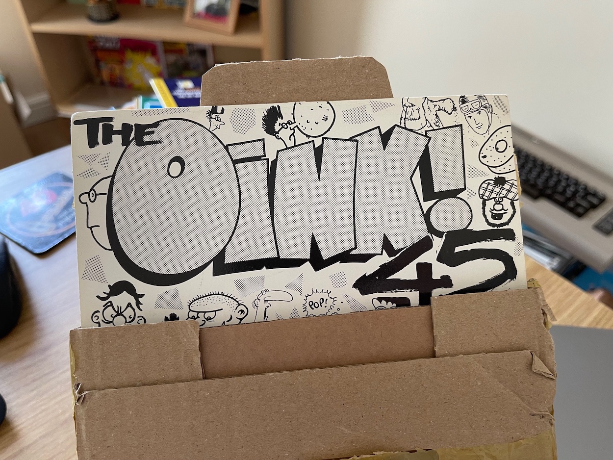 When the original songs were produced by Marc, Chris had yet to join the comic (#16) so the new track, called The OiNK Get Together Song was a chance for the pop music sensation to get in on the action and team up with the former member of The Fall. Along with the other two songs (the rap now renamed The OiNK Psycho Rap) this was a proper, solid record the size of a single, in its own sleeve for just £1.70 and I for one jumped at the chance to own it, especially since all three songs were new to me (having missed the flexidisc first time around). In fact, this and the mug were the only pieces of OiNK merchandise I originally owned.