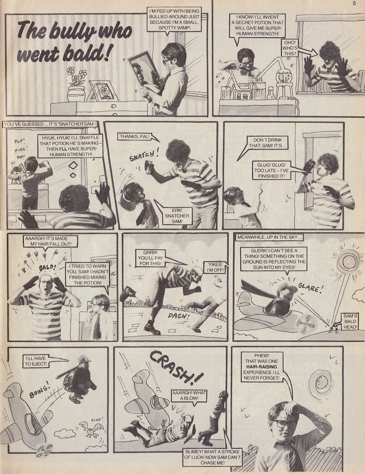 The Bully Who Went Bald is one such story. It also features Tony’s son Paul (previously seen in the preview issue) as Sam’s intended target and Patrick as an innocent airplane pilot who just happens to be passing by. The rough sketches and cut-and-paste nature adds to the amateurish look, which in itself highlights the fact these were spoofs of photo stories found in the likes of Eagle and women’s weeklies of the 80s.
